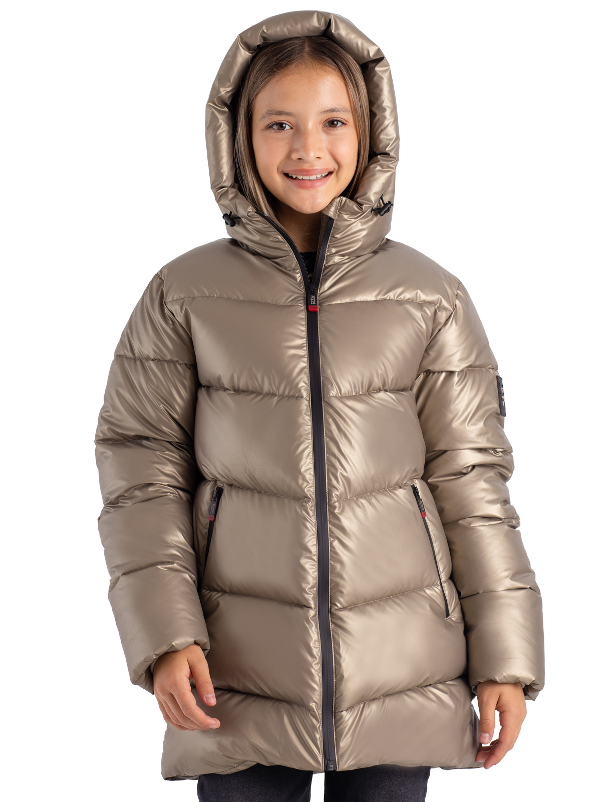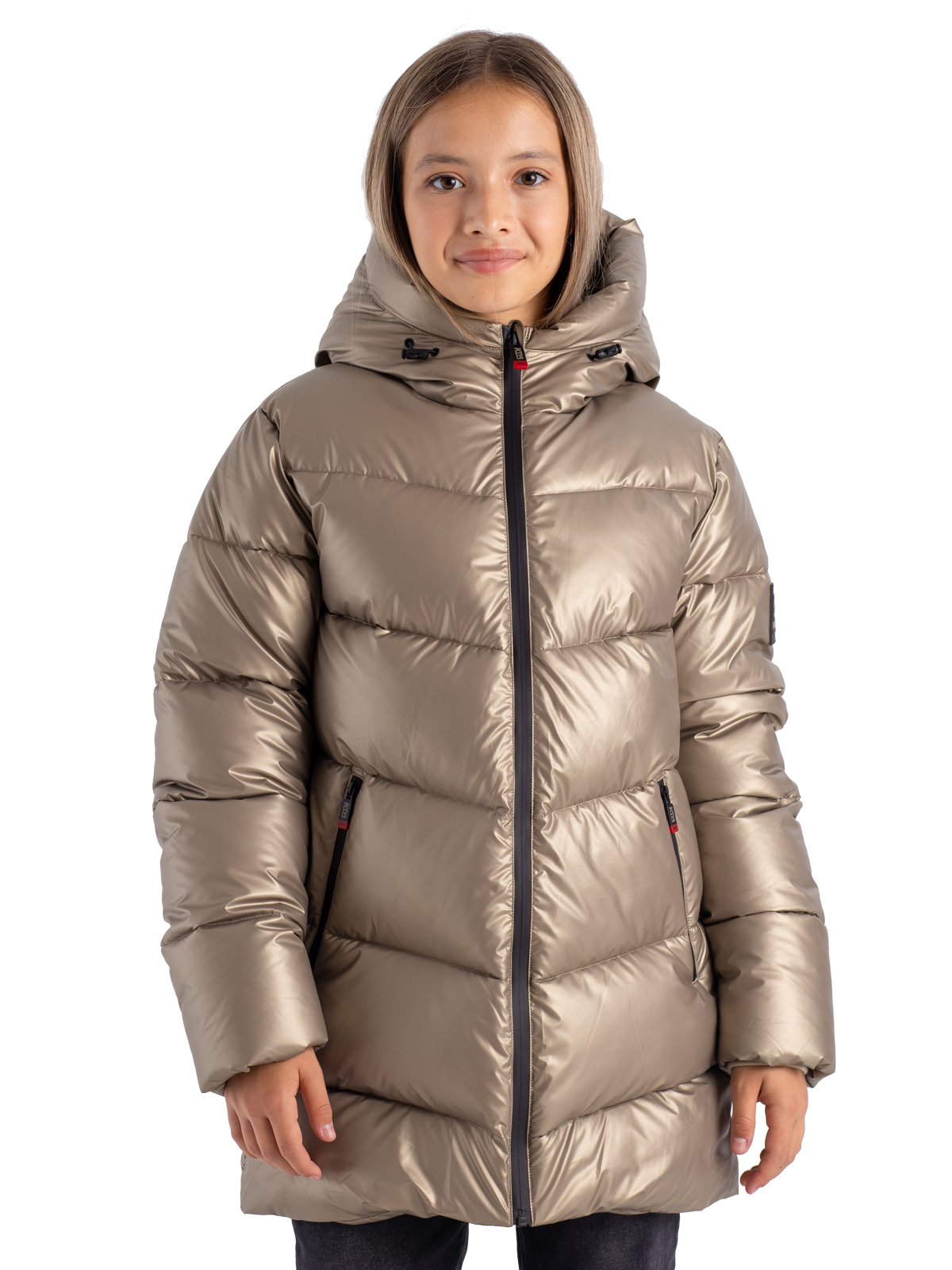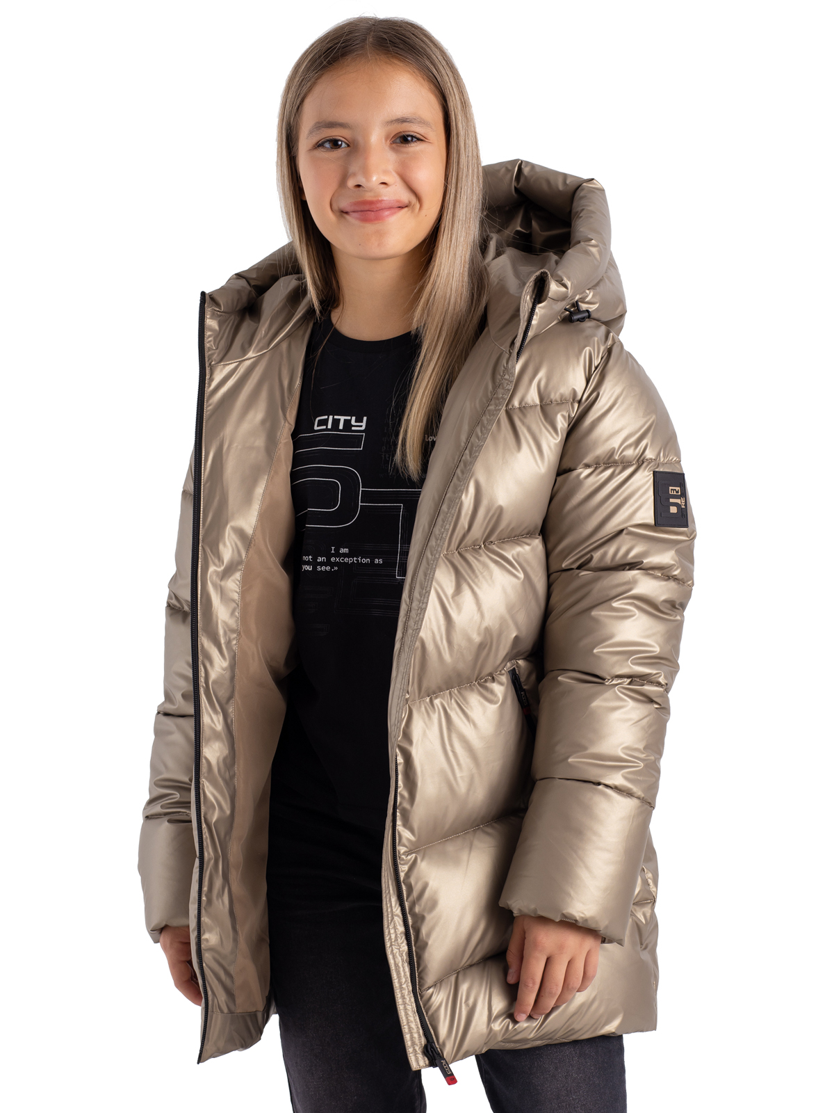 Зимняя куртка для девочки подростка с утеплителем – искусственный пух весом 300 г/м из немаркой ткани трендового цвета с блестящим финишем застегивается на ветрозащитную, водонепроницаемую молнию. Высокий ворот, внутренние манжеты, цельный несъемный капюшон с регулируемой кулисой призваны защитить от ветра. Функциональные карманы по бокам застегиваются на молнию. Стильная, универсальная модель на каждый день.