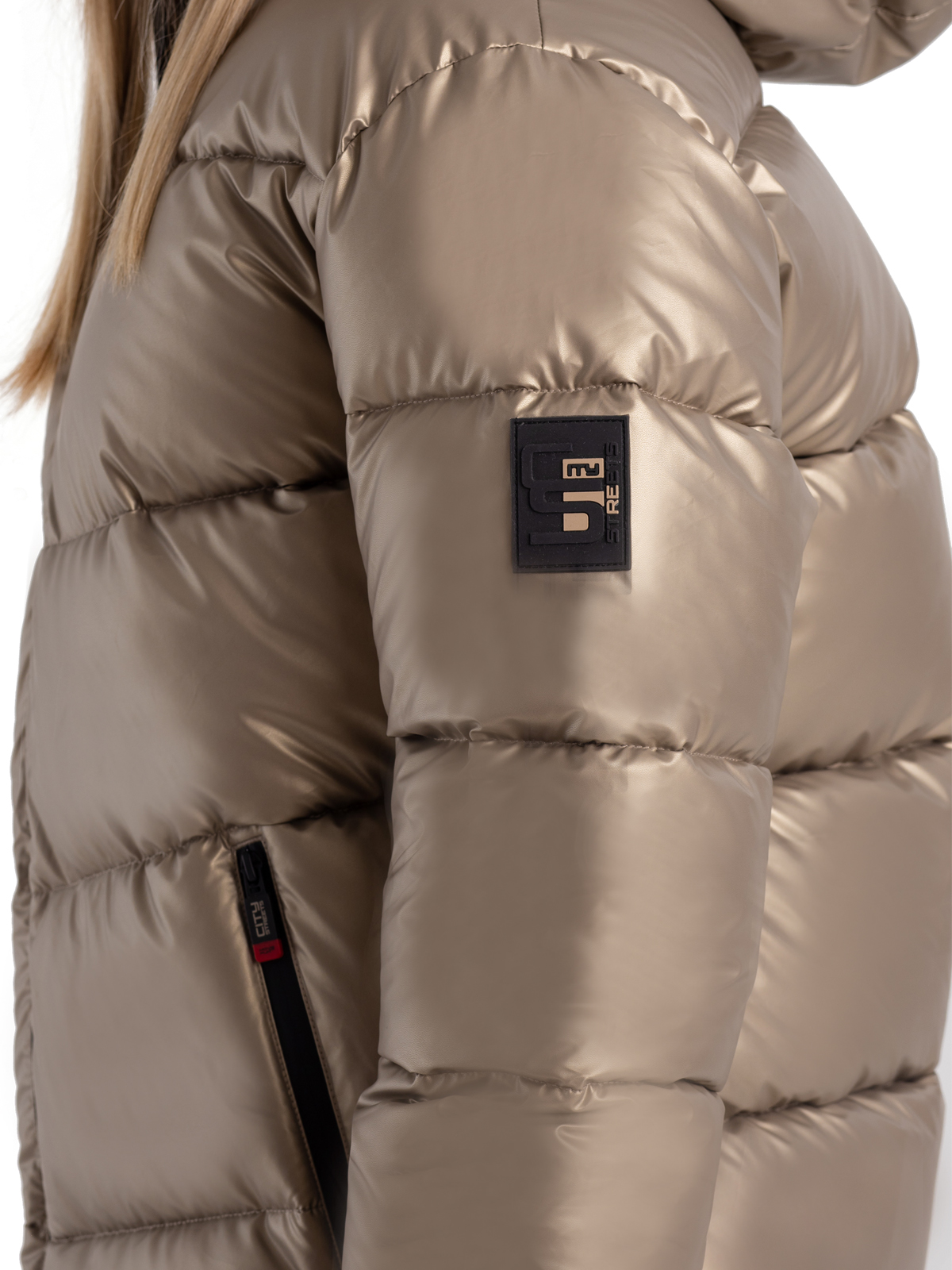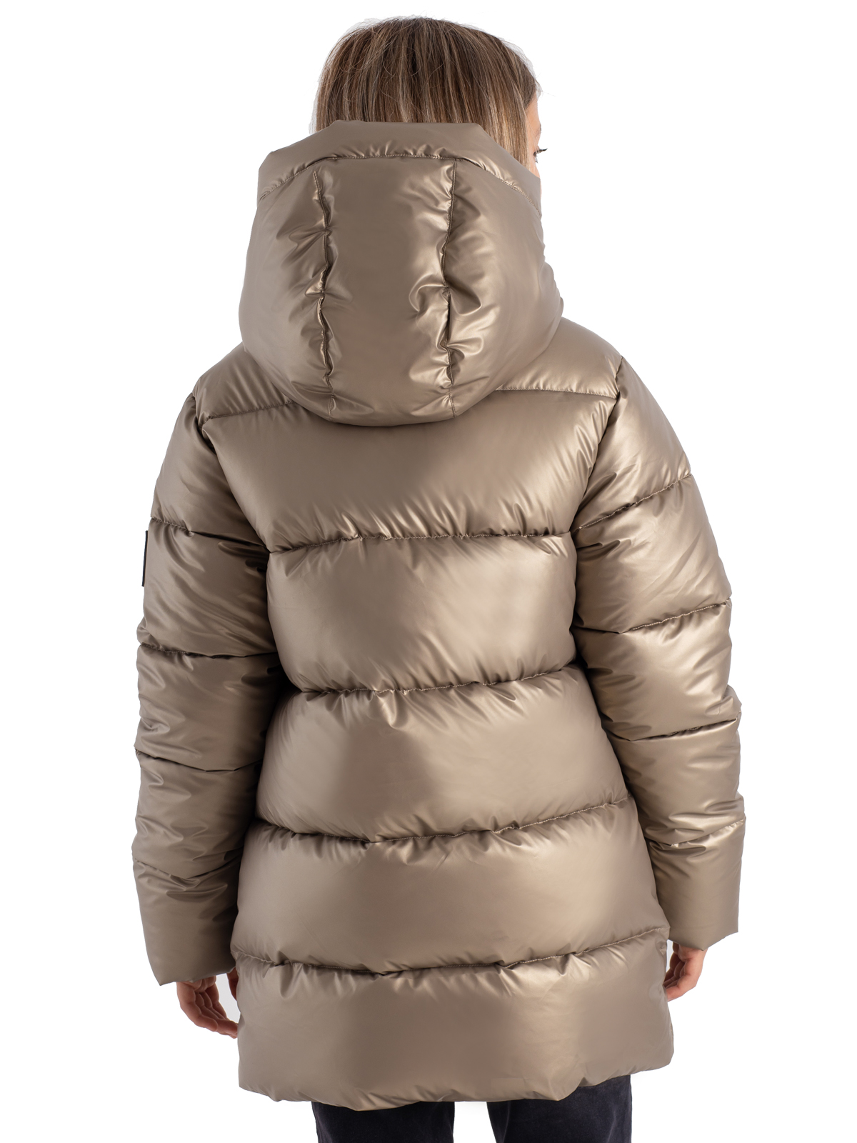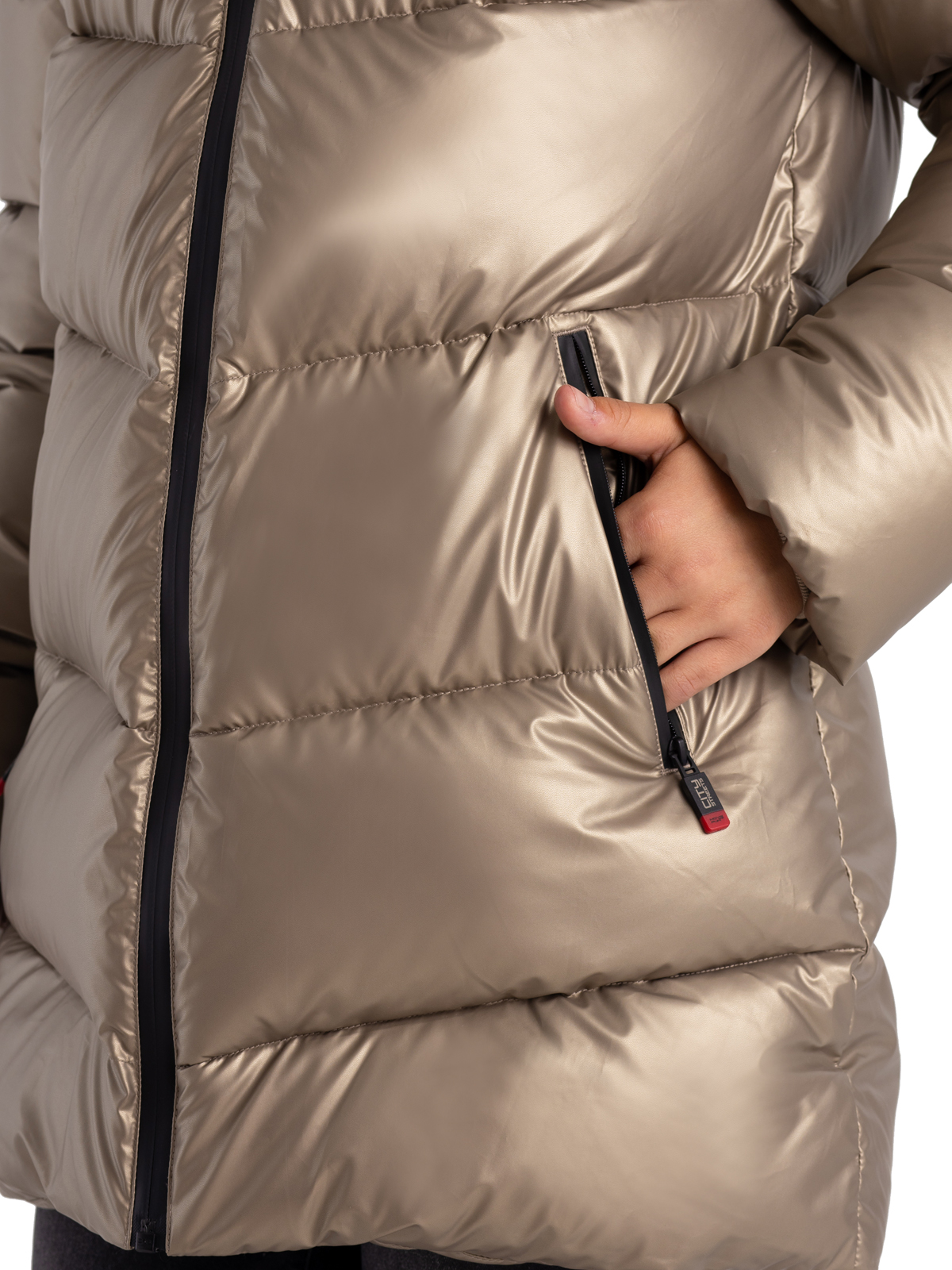 Зимняя куртка для девочки подростка с утеплителем – искусственный пух весом 300 г/м из немаркой ткани трендового цвета с блестящим финишем застегивается на ветрозащитную, водонепроницаемую молнию. Высокий ворот, внутренние манжеты, цельный несъемный капюшон с регулируемой кулисой призваны защитить от ветра. Функциональные карманы по бокам застегиваются на молнию. Стильная, универсальная модель на каждый день.