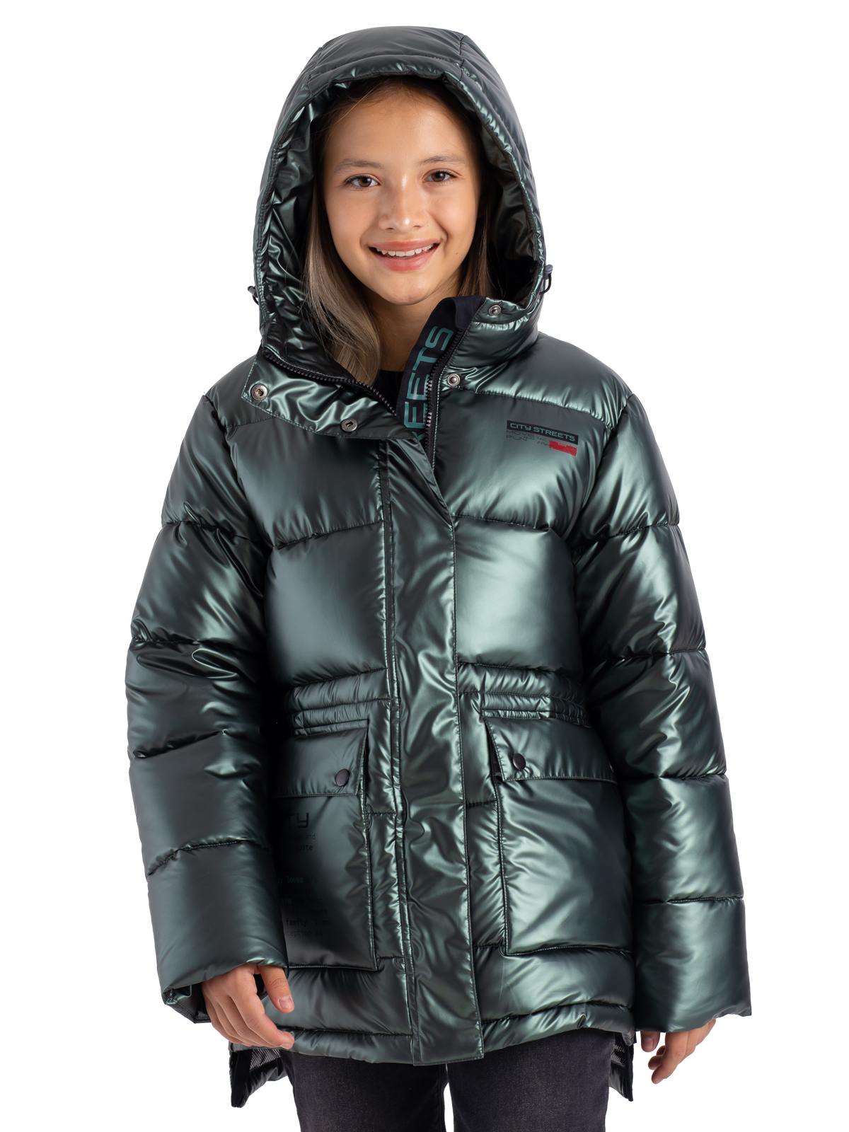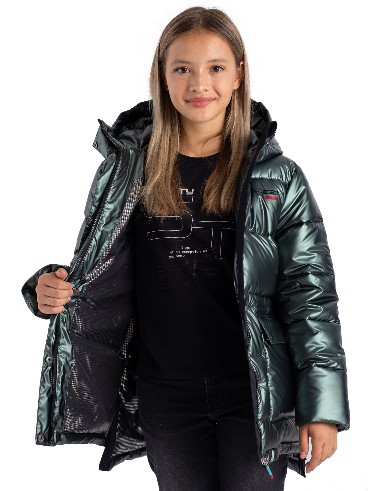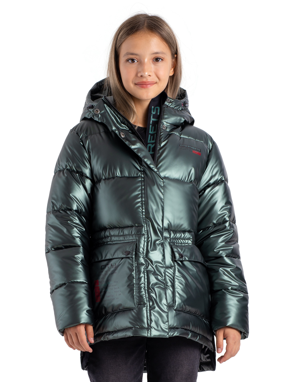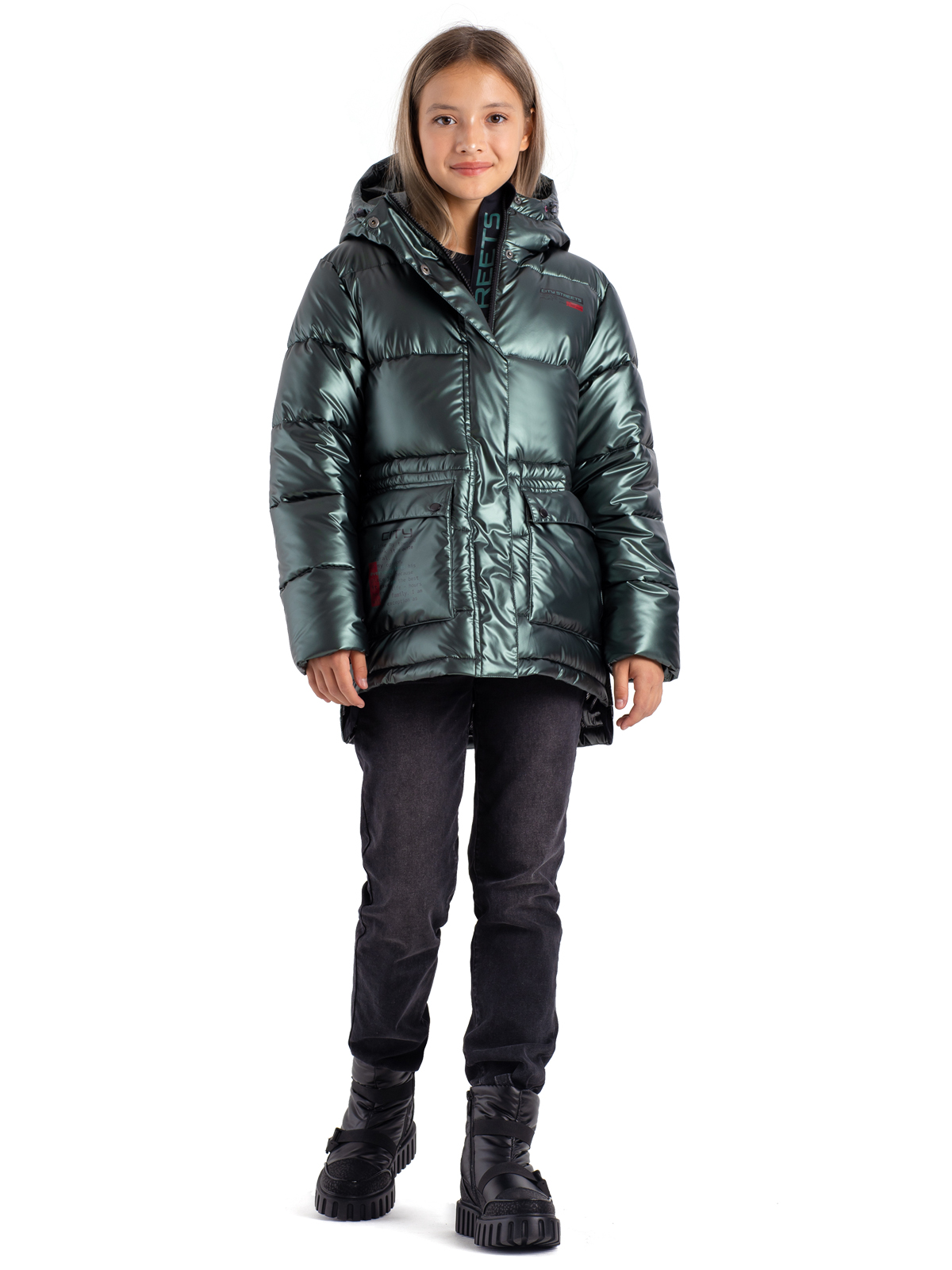 Зимняя куртка для девочки подростка с утеплителем – искусственный пух весом 300 г/м из ткани трендового цвета с блестящим финишем и полиуретановым покрытием имеет ассиметричный силуэт за счет увеличения длины по спинке изделия. Высокий ворот, ветрозащитная планка, внутренние манжеты, цельный несъемный капюшон с регулируемой кулисой призваны защитить от ветра. Молнии по низу изделия для регулировки ширины - добавляют удобства. Стильная, универсальная модель на каждый день.