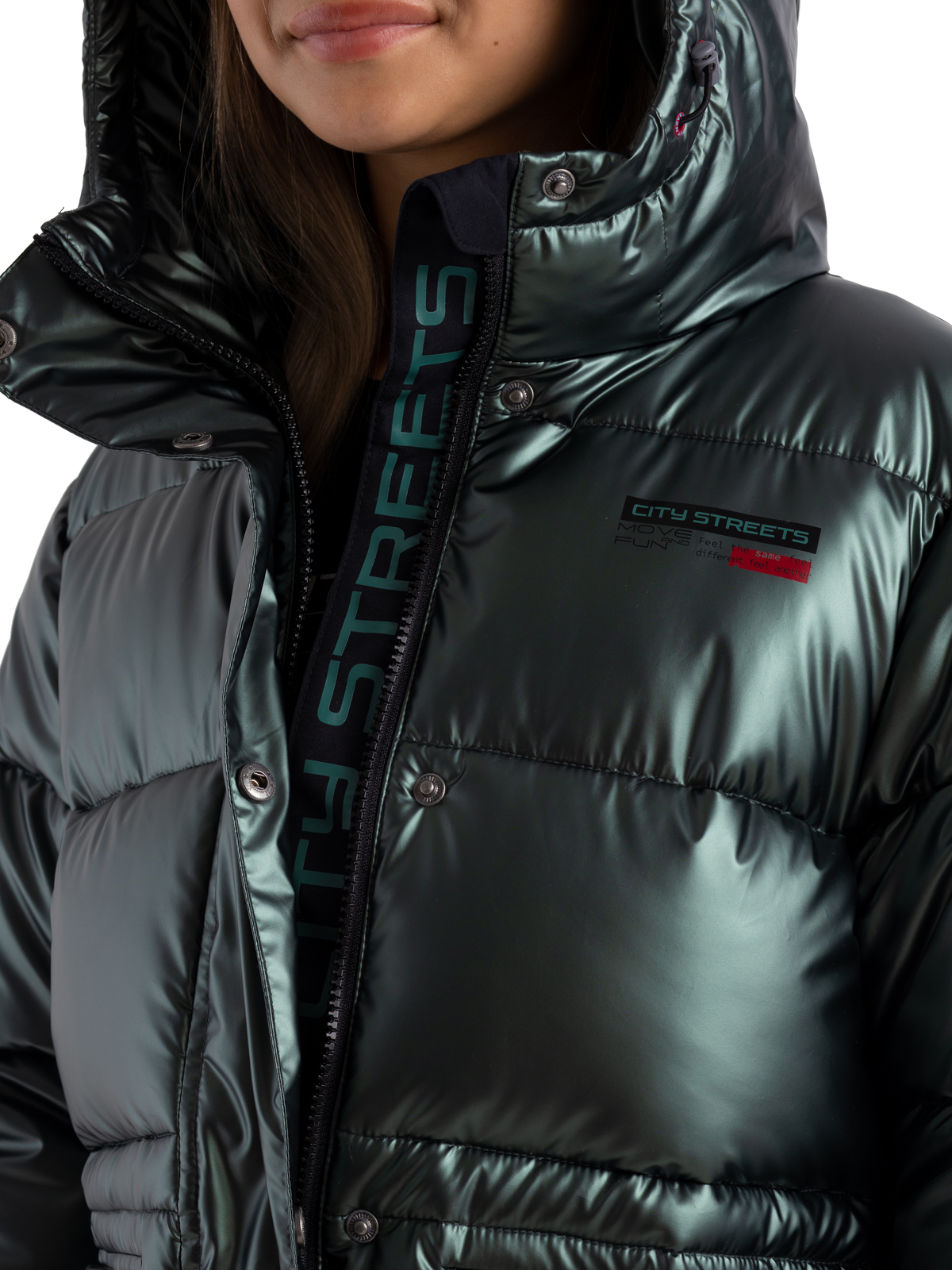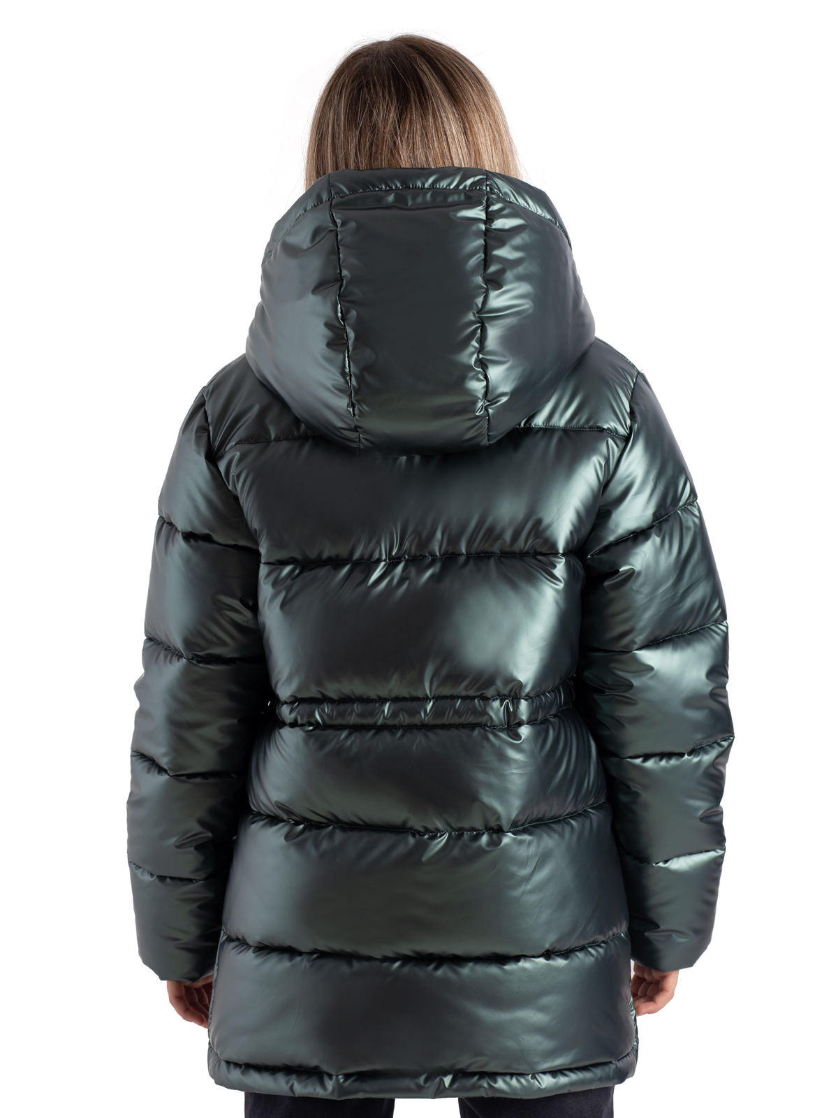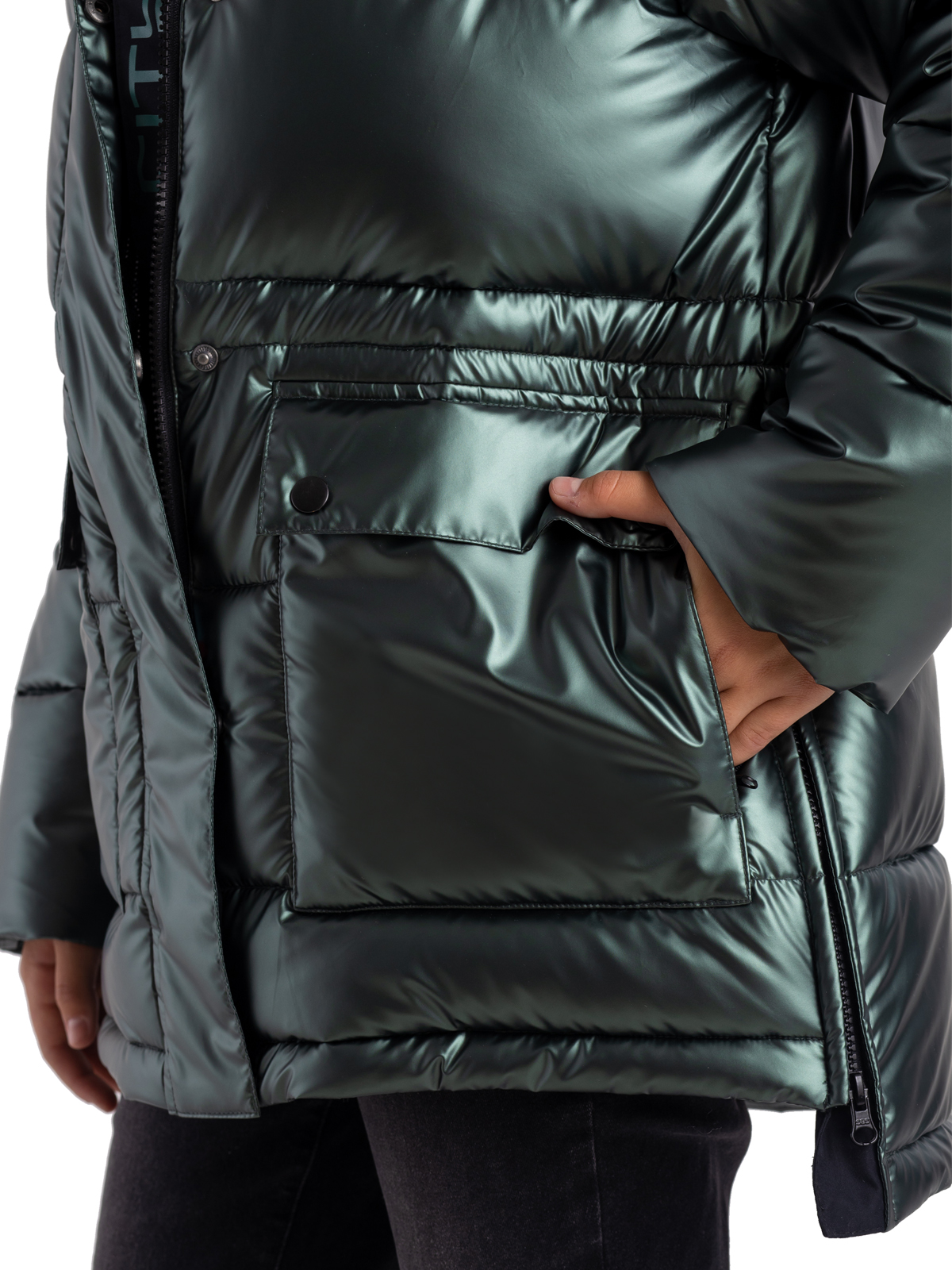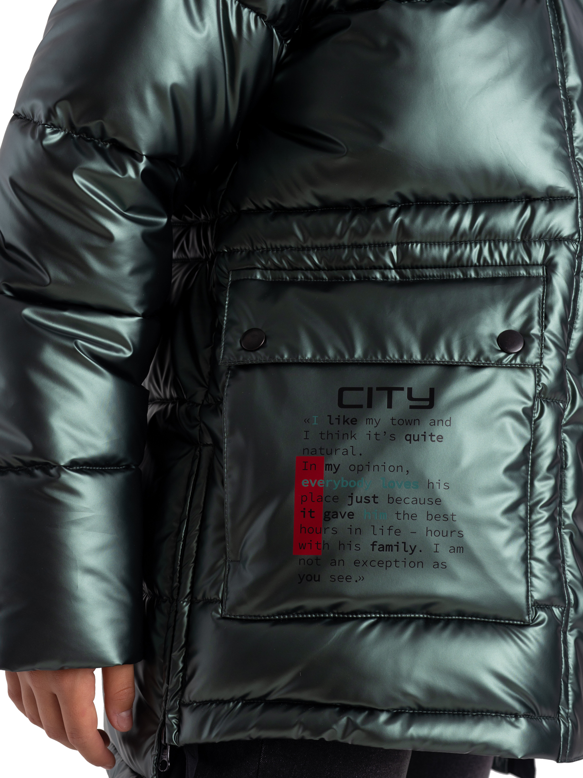 Зимняя куртка для девочки подростка с утеплителем – искусственный пух весом 300 г/м из ткани трендового цвета с блестящим финишем и полиуретановым покрытием имеет ассиметричный силуэт за счет увеличения длины по спинке изделия. Высокий ворот, ветрозащитная планка, внутренние манжеты, цельный несъемный капюшон с регулируемой кулисой призваны защитить от ветра. Молнии по низу изделия для регулировки ширины - добавляют удобства. Стильная, универсальная модель на каждый день.