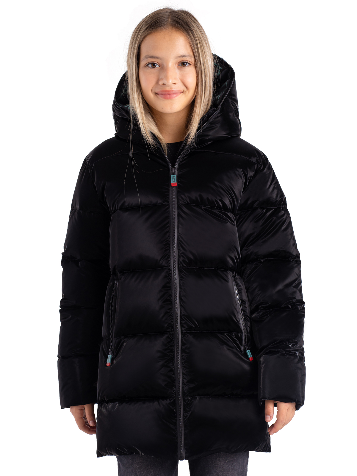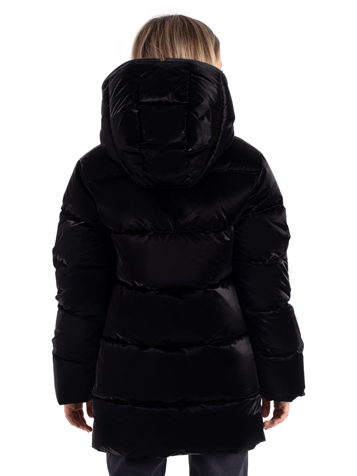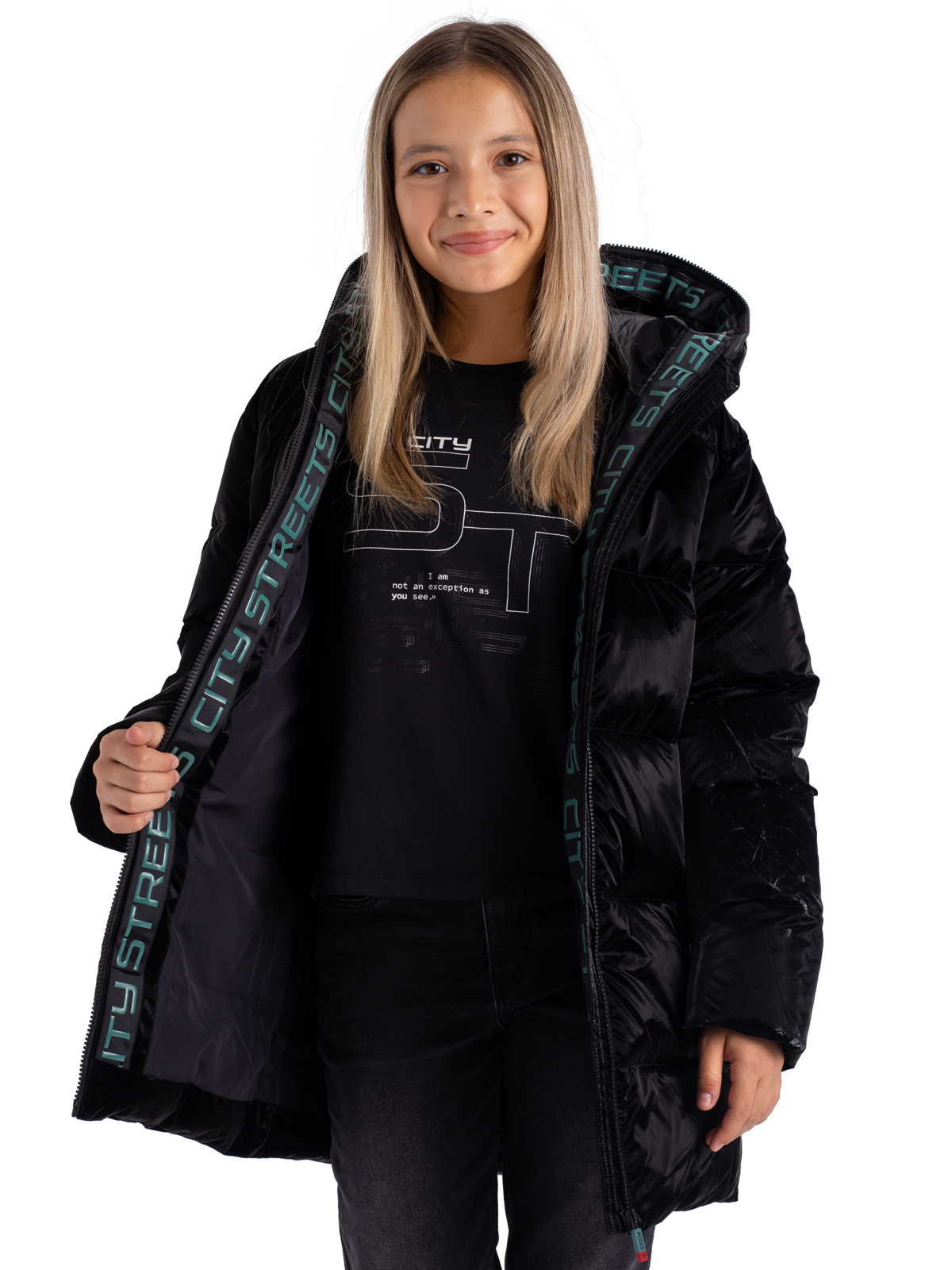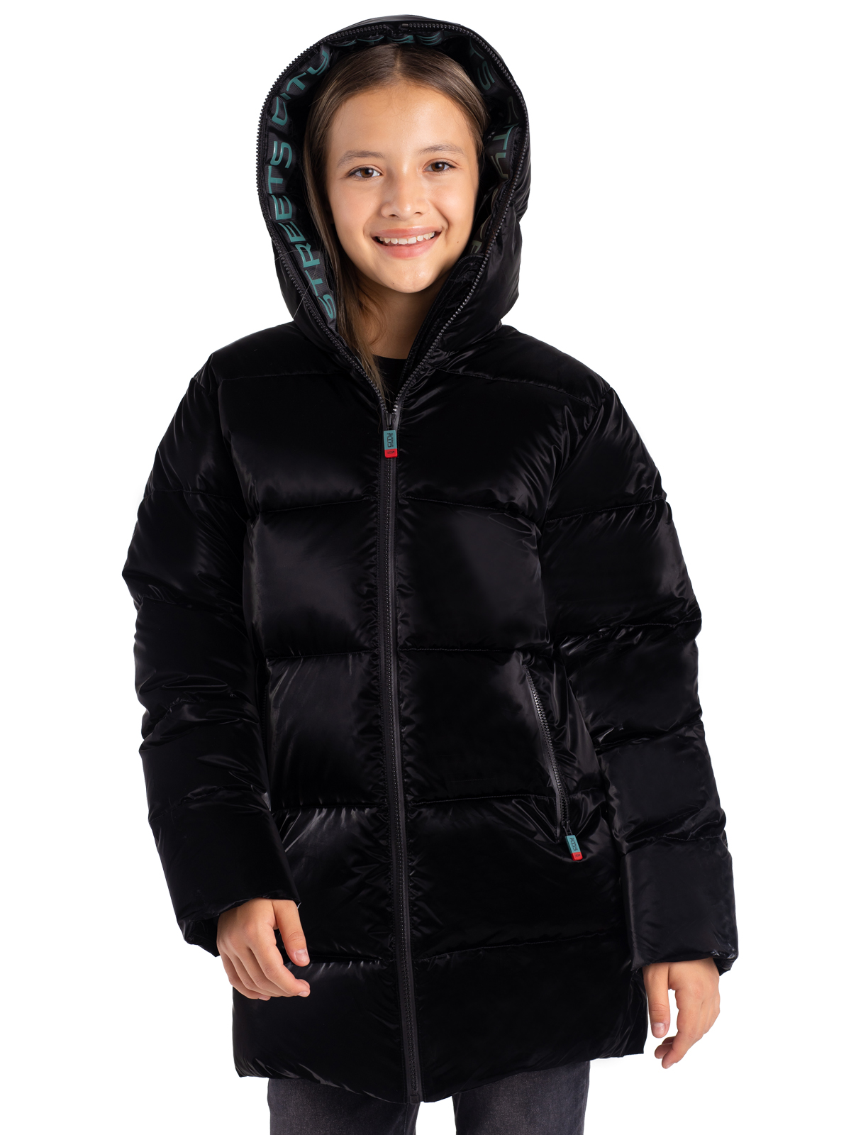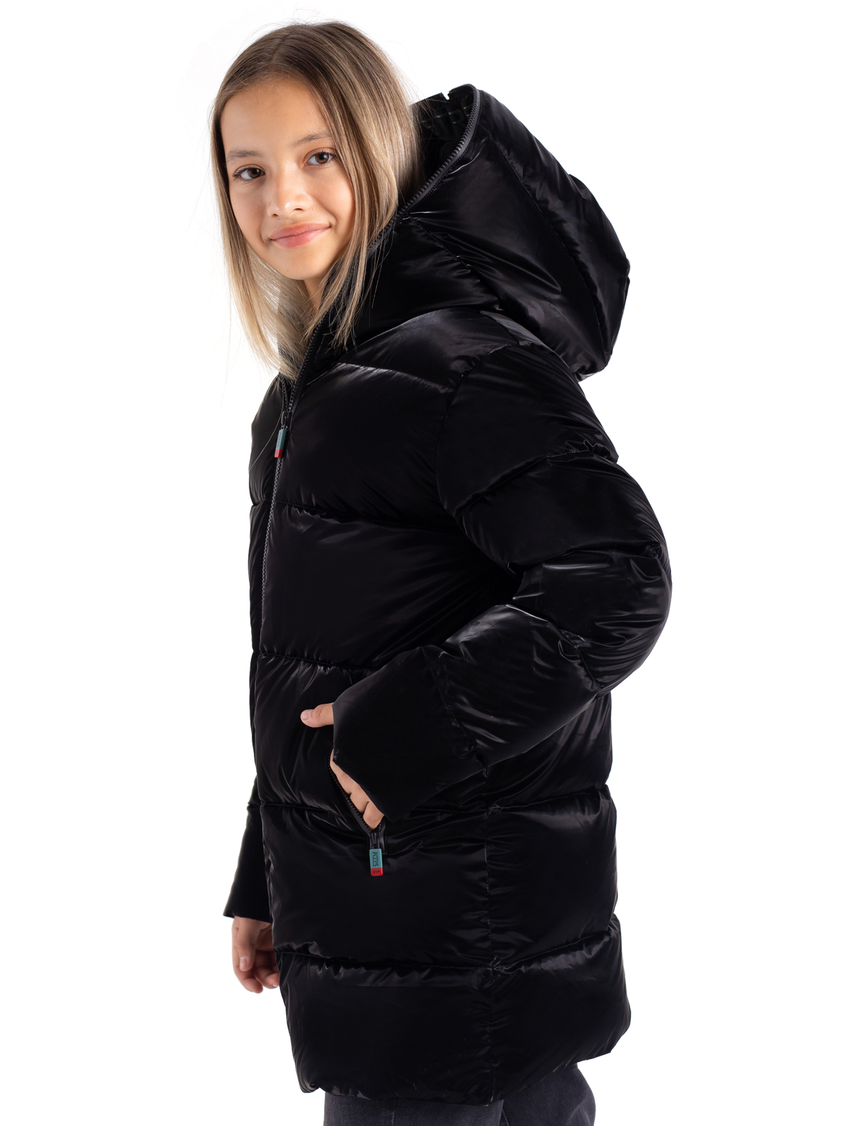 Стильная зимняя куртка из ткани черного цвета с водоотталкивающим покрытием из полиуретана, и матовым «бархатным» финишем, имеет утеплитель - искусственный пух весом 300г/м2. Оптимальная длина, цельный капюшон, внутренние манжеты и водостойкие молнии обеспечивают защиту от холода и ветра. Зимняя куртка декорирована контрастным принтом и брендированной фурнитурой.