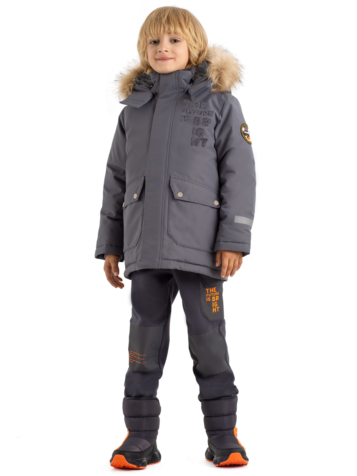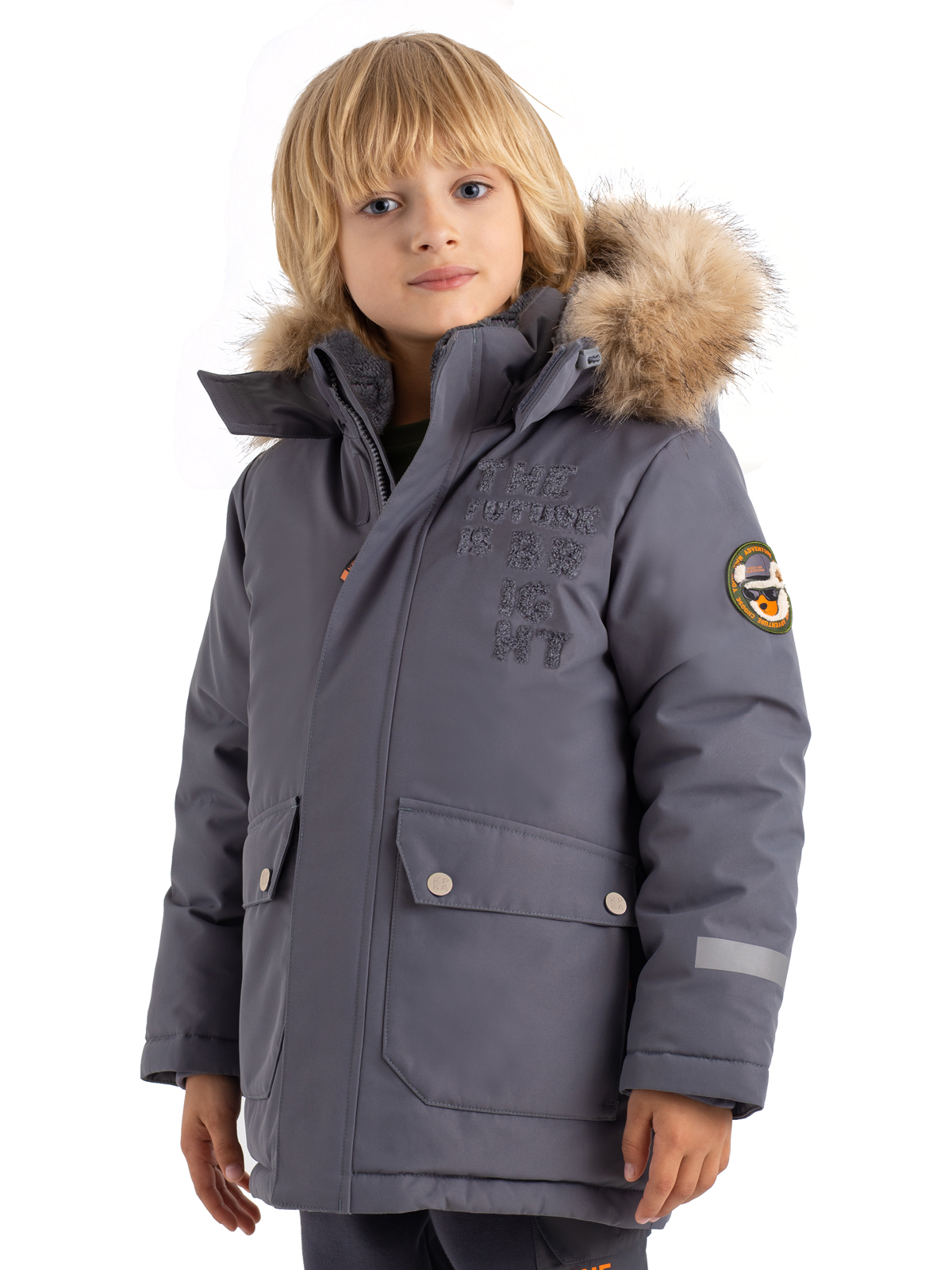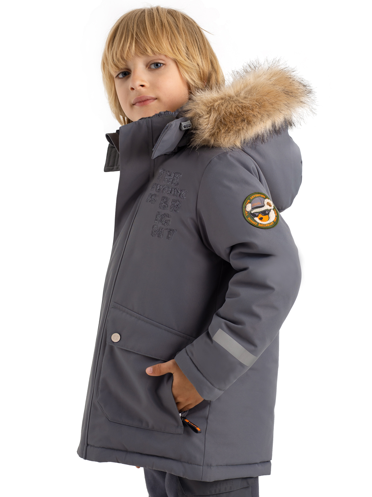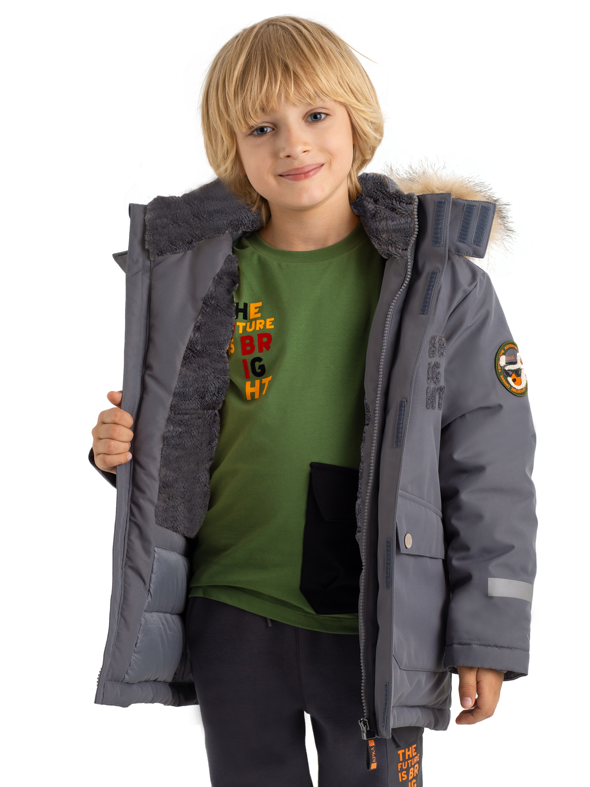Зимняя удлиненная куртка для мальчика из влагозащитной, грязеотталкивающей, не продуваемой мембранной ткани 5000мм/5000г/м2/24ч, имеет утеплитель 280г/м2. Куртка дополнена подкладкой из шерпы в капюшоне, воротнике и верхней части изделия. Съемный капюшон имеет регулируемую кулису по краю, и декорирован отстегивающимся мехом. Высокий воротник, манжеты из риба и ветрозащитная планка на липучках надежно защищают от ветра. Куртка имеет два накладных кармана, и светоотражающие принты сзади и на рукаве для защиты ребенка в темное время суток.