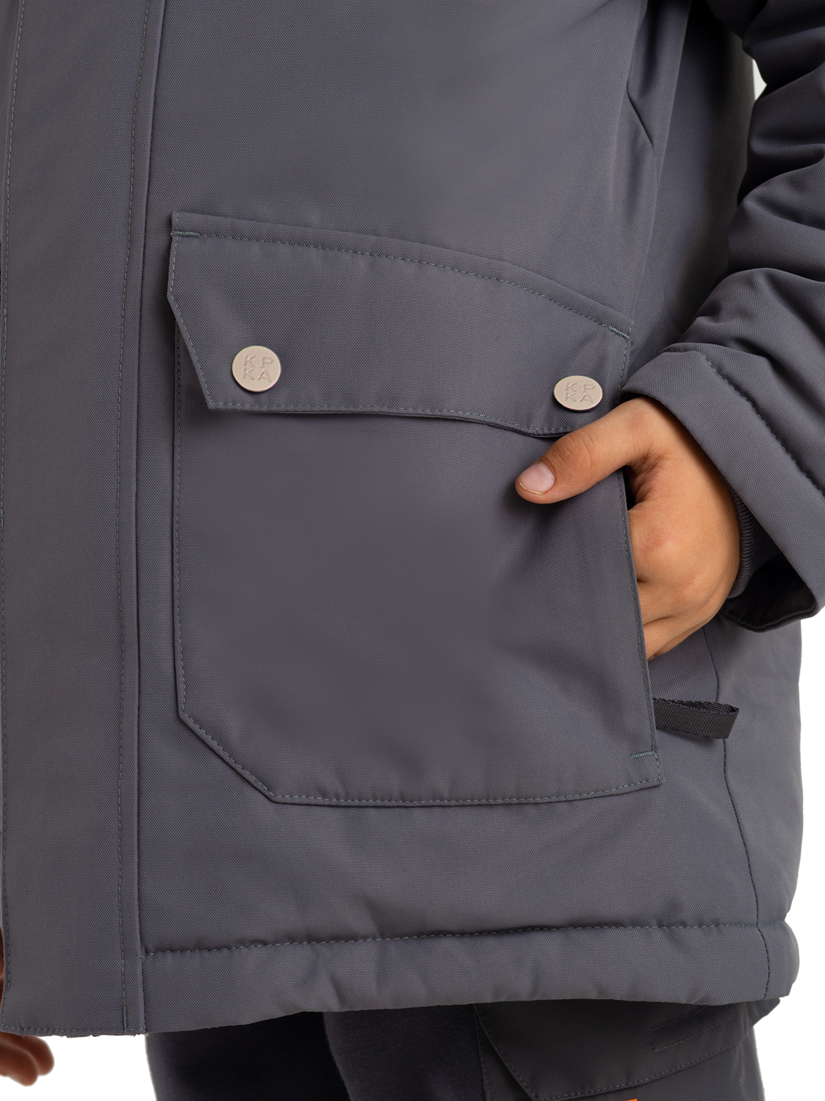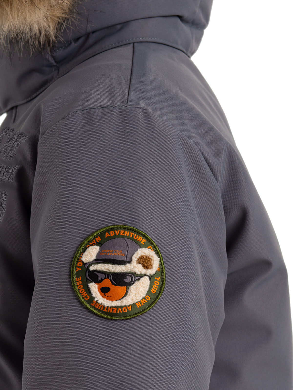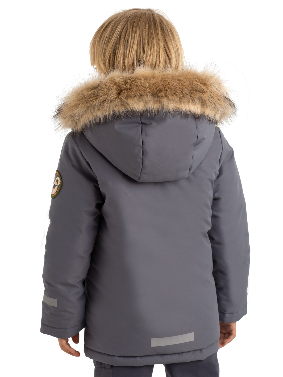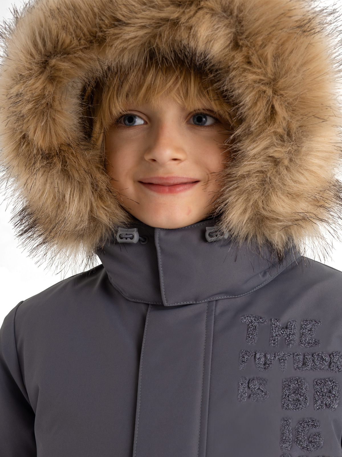 Зимняя удлиненная куртка для мальчика из влагозащитной, грязеотталкивающей, не продуваемой мембранной ткани 5000мм/5000г/м2/24ч, имеет утеплитель 280г/м2. Куртка дополнена подкладкой из шерпы в капюшоне, воротнике и верхней части изделия. Съемный капюшон имеет регулируемую кулису по краю, и декорирован отстегивающимся мехом. Высокий воротник, манжеты из риба и ветрозащитная планка на липучках надежно защищают от ветра. Куртка имеет два накладных кармана, и светоотражающие принты сзади и на рукаве для защиты ребенка в темное время суток.