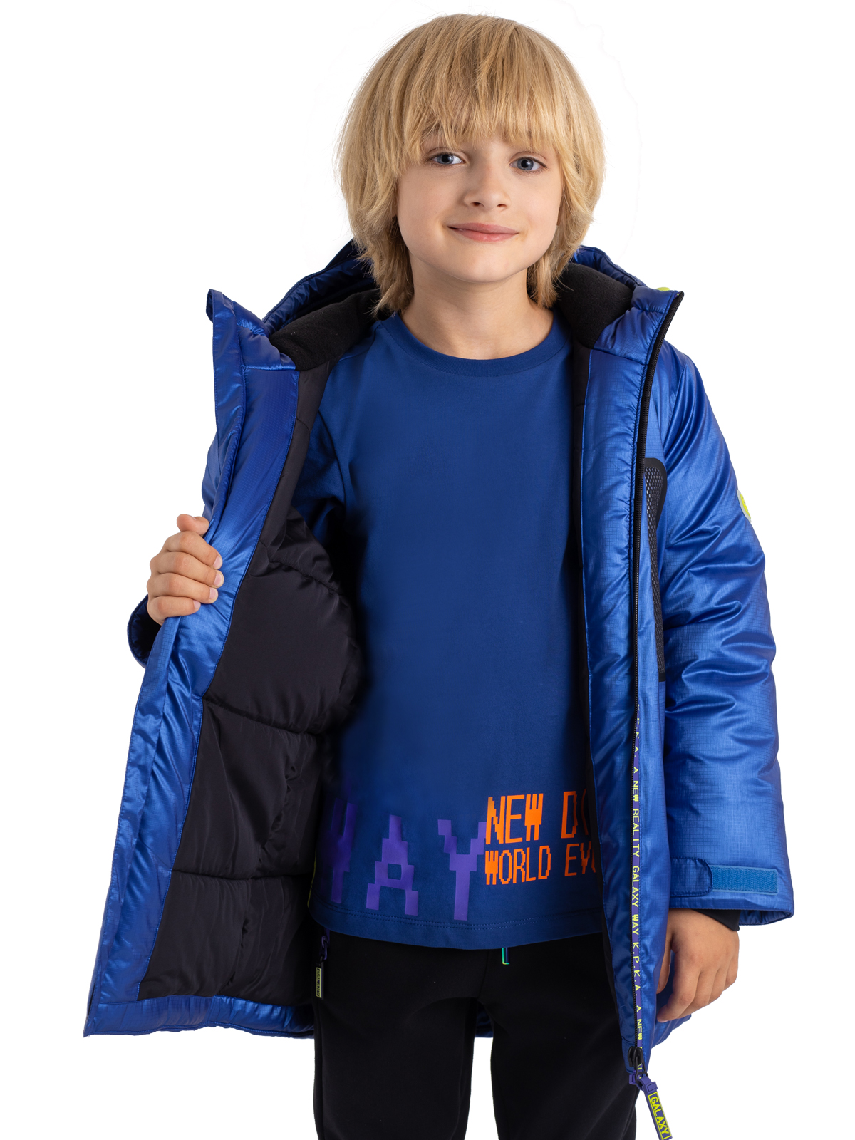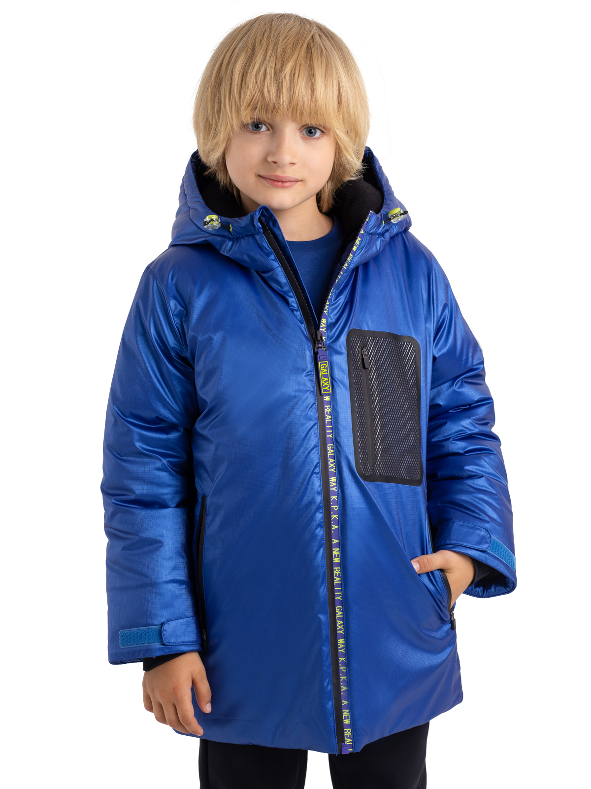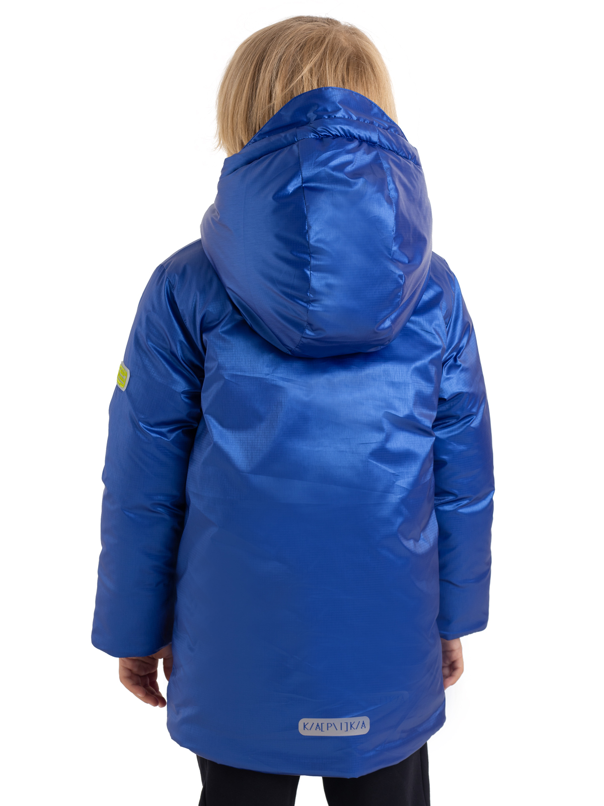 Демисезонная куртка для мальчика из яркой синей ткани «рипстоп» имеет утеплитель 260г/м2. Куртка дополнена ветрозащитными, непромокаемыми «молниями», регулируемыми манжетами на липучке, и внутренними эластичными манжетами с прорезью под большой палец, для защиты от ветра. Капюшон несъемный, по краю капюшона регулируемая кулиса. Куртка имеет функциональный контрастный накладной карман на груди, два боковых кармана, и светоотражающий принт сзади для защиты ребенка в темное время суток