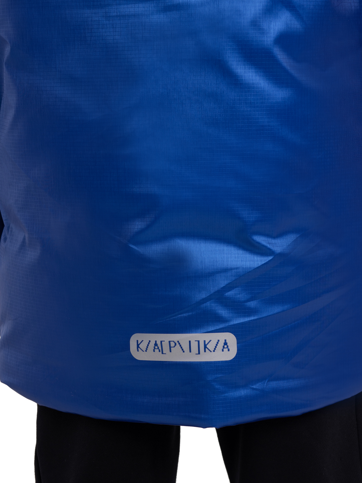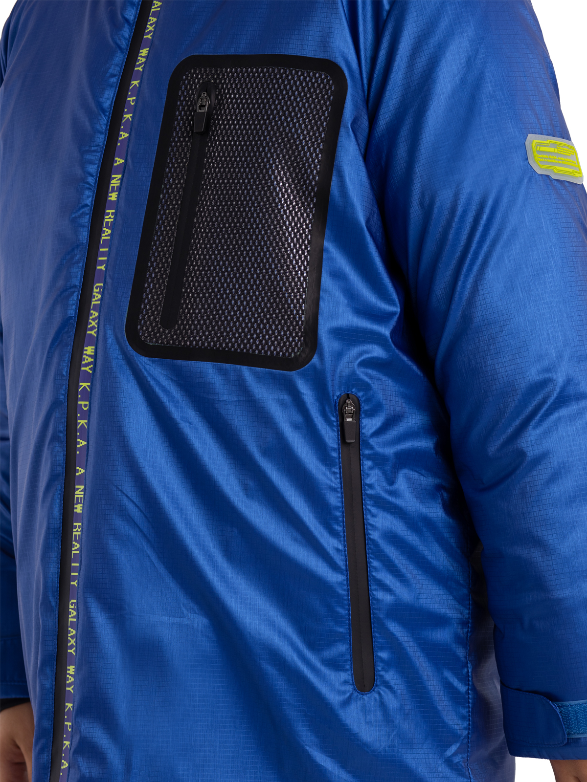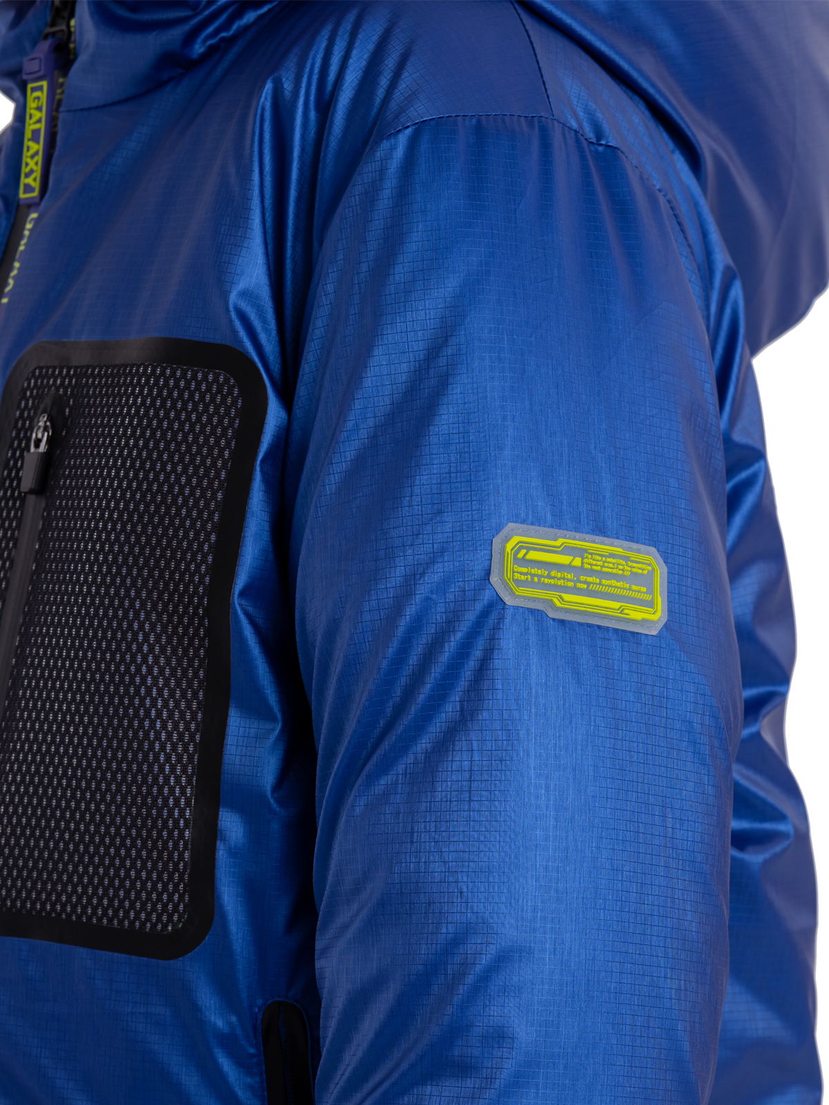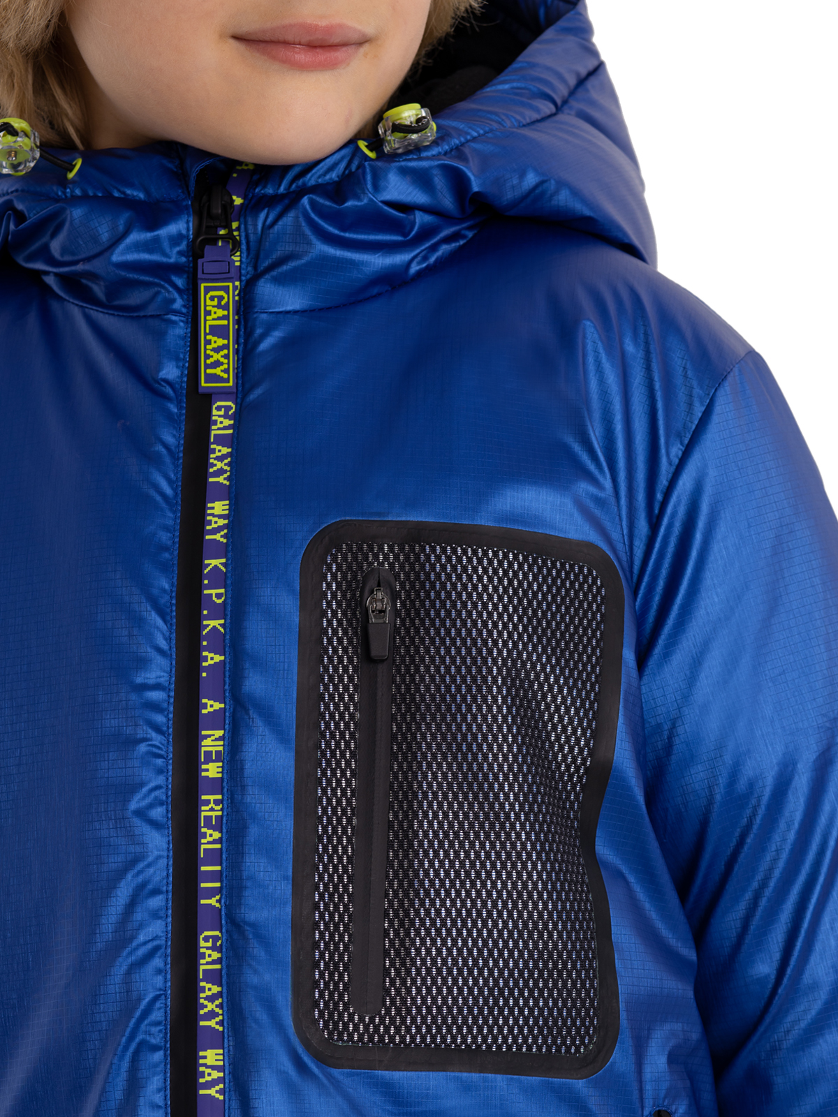 Демисезонная куртка для мальчика из яркой синей ткани «рипстоп» имеет утеплитель 260г/м2. Куртка дополнена ветрозащитными, непромокаемыми «молниями», регулируемыми манжетами на липучке, и внутренними эластичными манжетами с прорезью под большой палец, для защиты от ветра. Капюшон несъемный, по краю капюшона регулируемая кулиса. Куртка имеет функциональный контрастный накладной карман на груди, два боковых кармана, и светоотражающий принт сзади для защиты ребенка в темное время суток