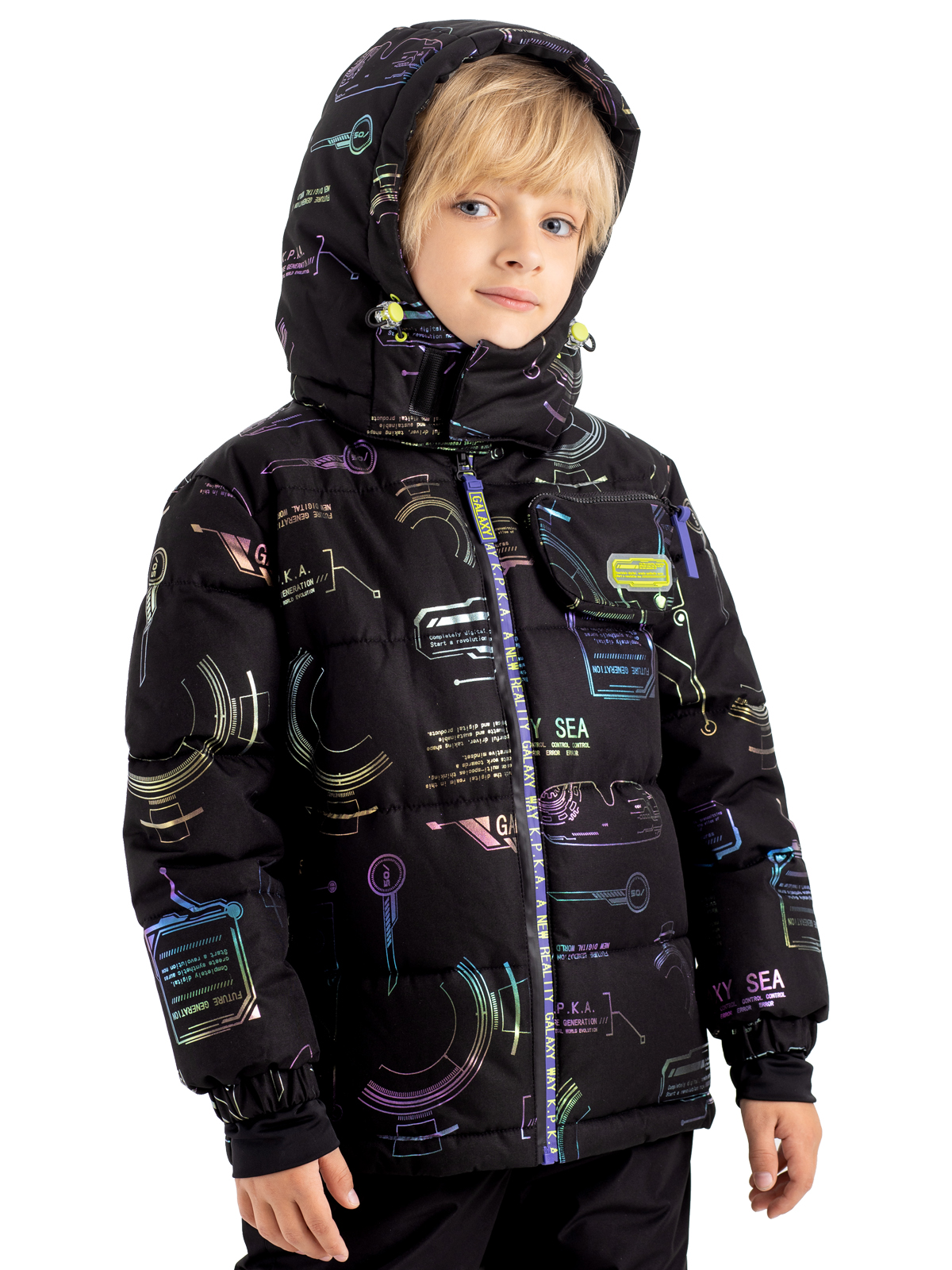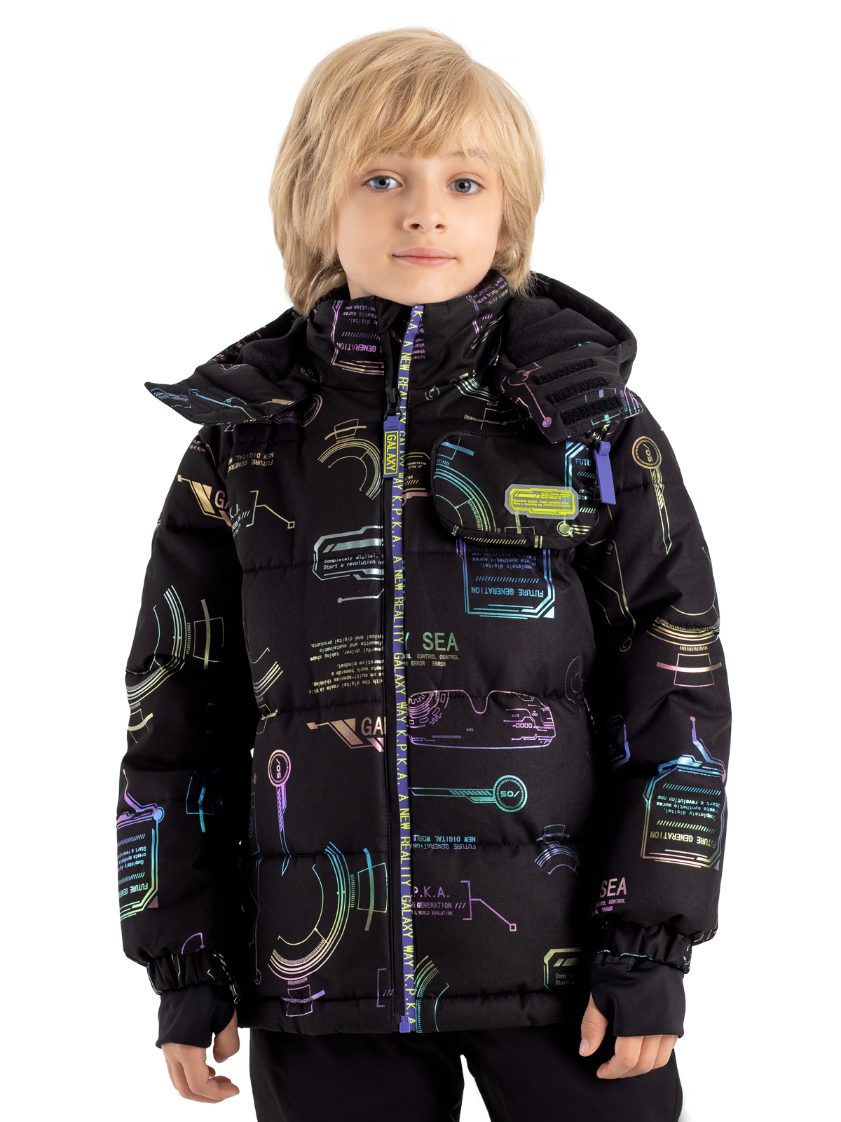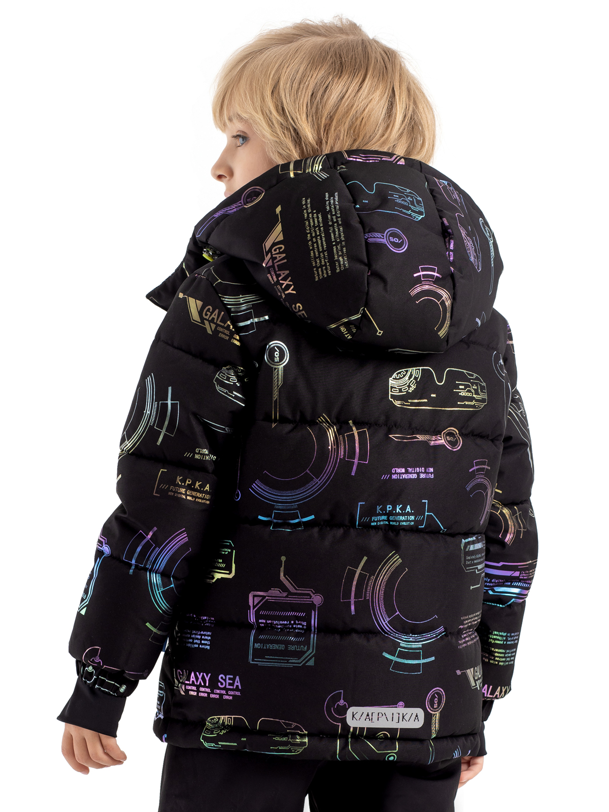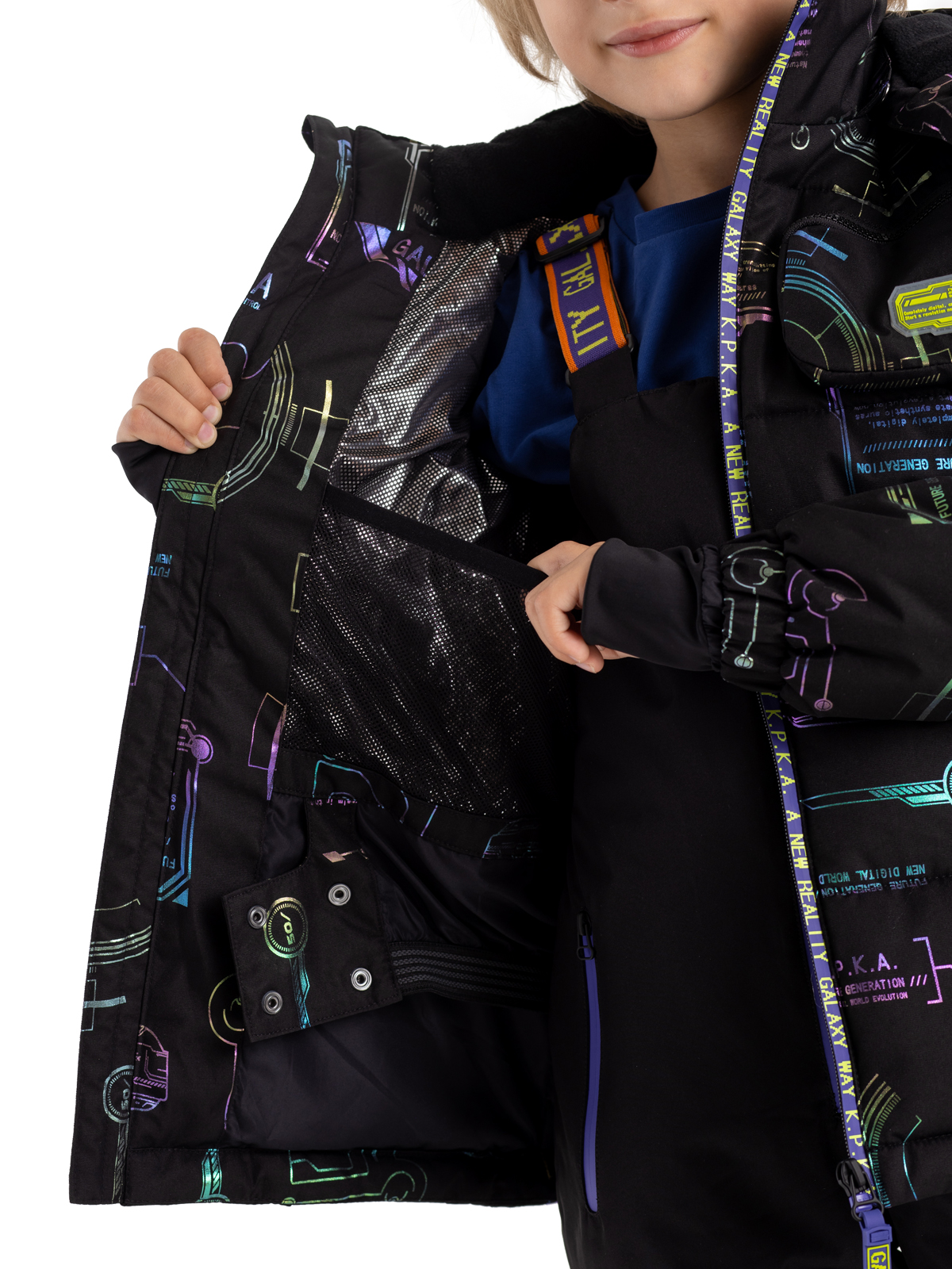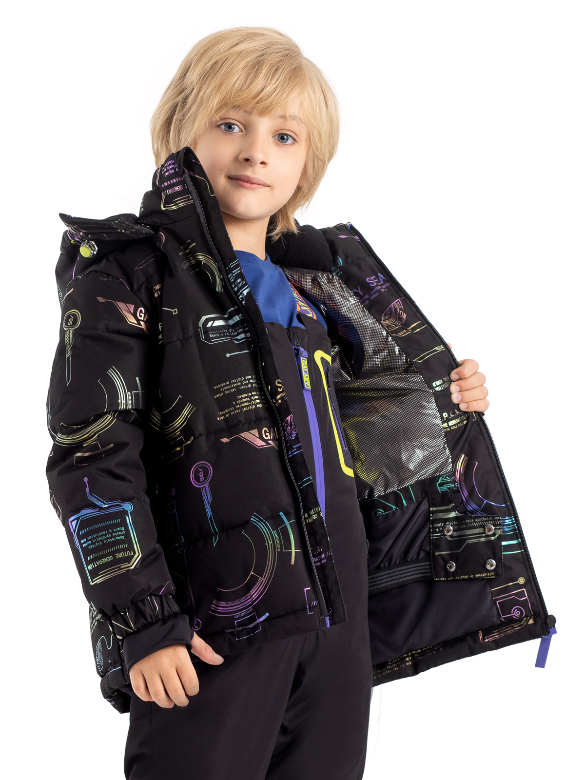 Пуховик с яркими принтами изготовлен из влагозащитной, грязеотталкивающей, не продуваемой мембранной ткани 8000мм/5000г/м2/24ч, имеет утеплитель из искусственного пуха 300г/м2 не дает ребенку замерзнуть. Пуховик со съемным капюшоном, на регулируемой кулисе, имеет снежную «юбку», служащую для исключения попадания снега при падении или катания по глубокому снегу, а также – для защиты от ветра. Центральная молния – водостойкая и прекрасно защищает от ветра, карманы на липучке. Куртка с блестящими принтами имеет светоотражающий элемент на спинке, защищающий в темное время суток и стильный силиконовый патч на груди, также имеется съемный брелок с функциональной игрушкой pop-it. Эластичные манжеты из лайкры с прорезью для большого пальца сохраняют тепло. Рефлективная подкладка с фольгированным принтом (OMNI-HEAT) эффективно удерживает тепло внутри.