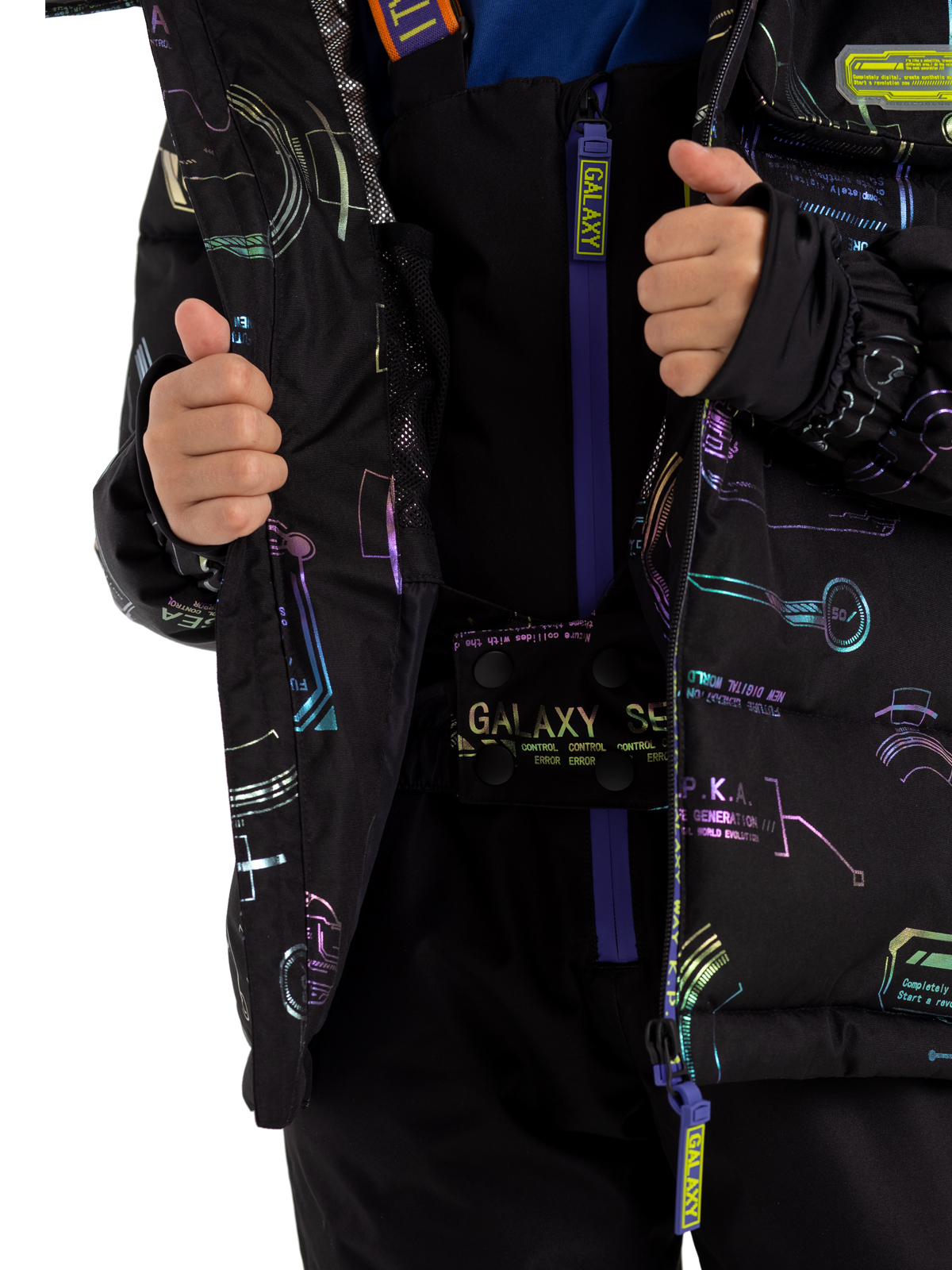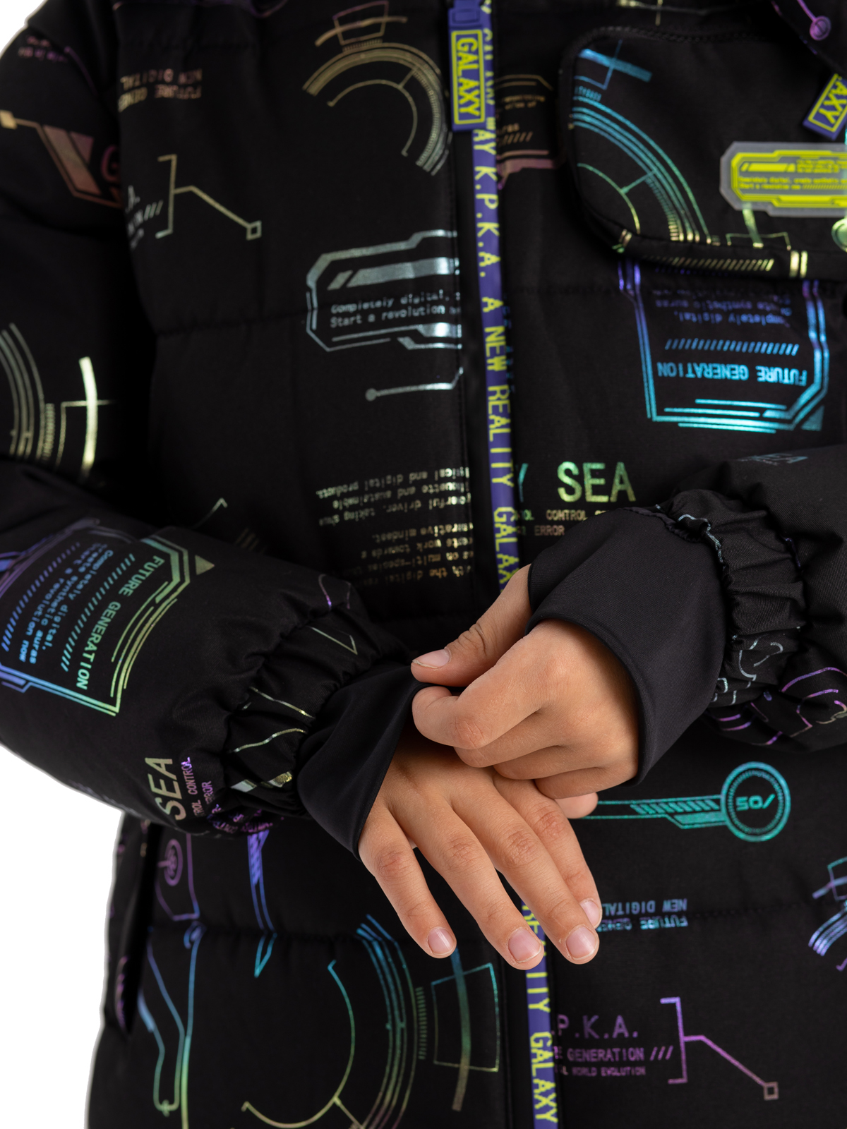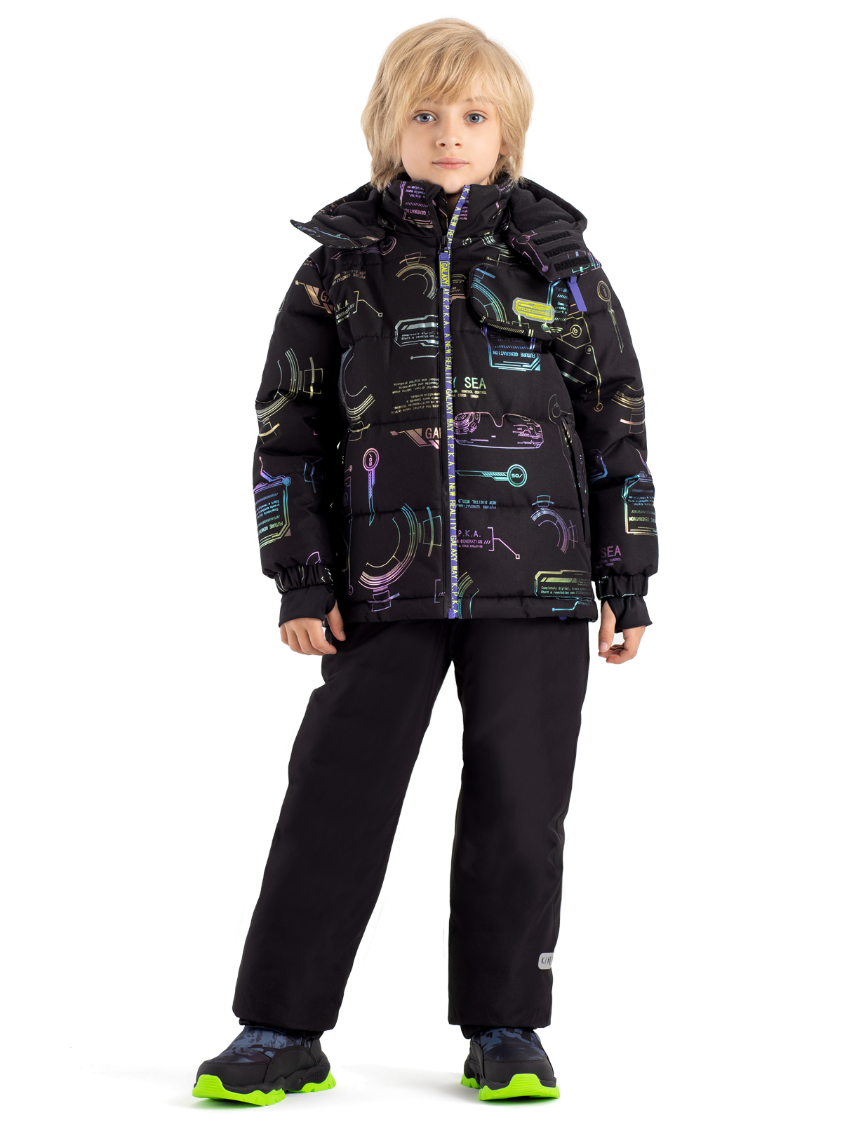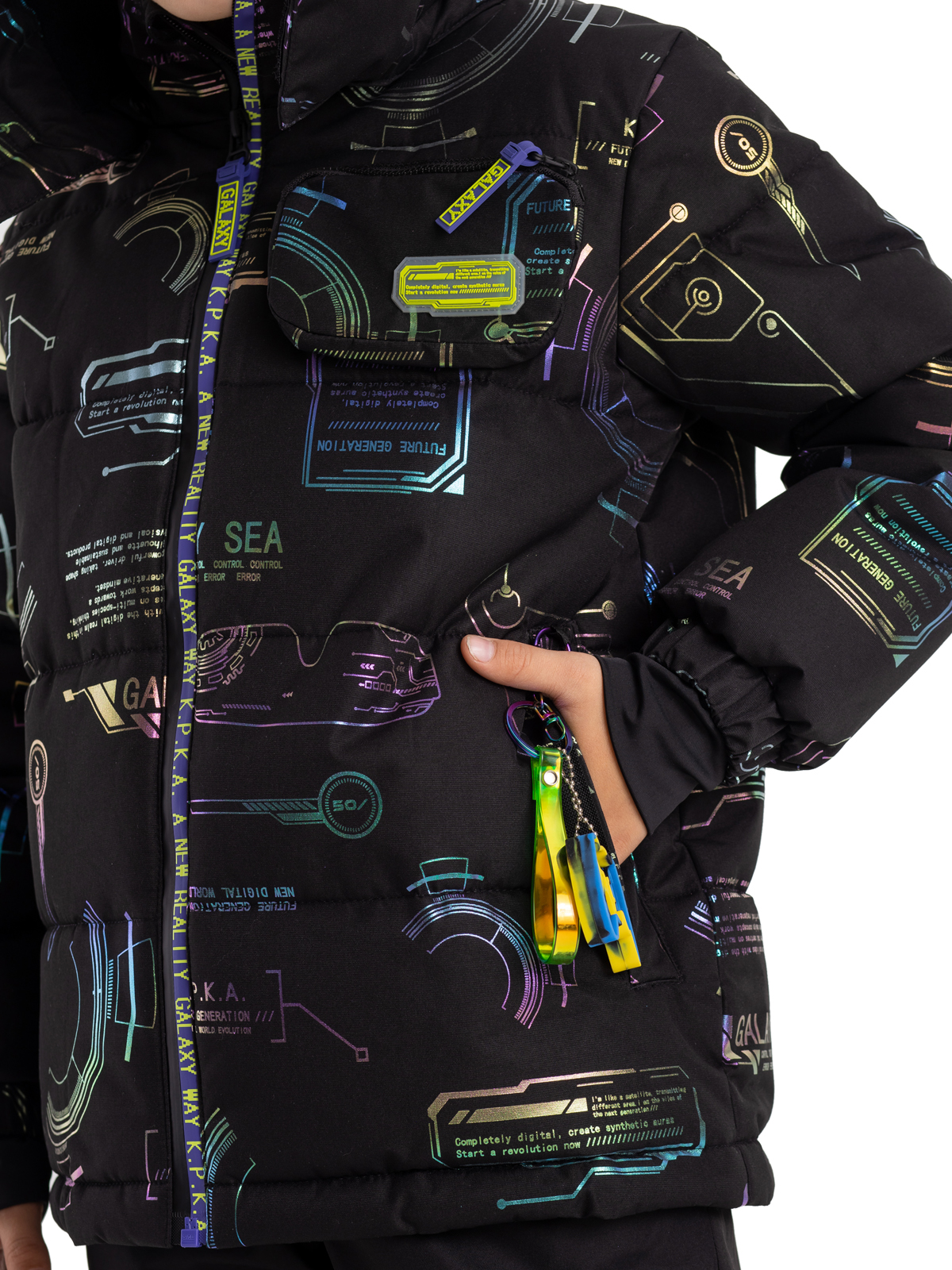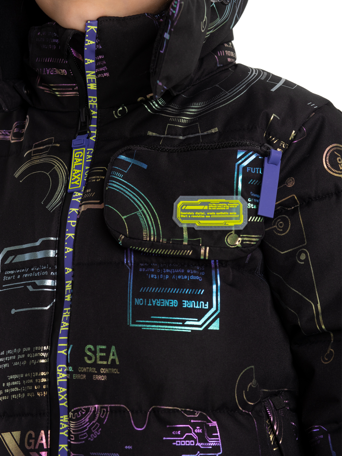 Пуховик с яркими принтами изготовлен из влагозащитной, грязеотталкивающей, не продуваемой мембранной ткани 8000мм/5000г/м2/24ч, имеет утеплитель из искусственного пуха 300г/м2 не дает ребенку замерзнуть. Пуховик со съемным капюшоном, на регулируемой кулисе, имеет снежную «юбку», служащую для исключения попадания снега при падении или катания по глубокому снегу, а также – для защиты от ветра. Центральная молния – водостойкая и прекрасно защищает от ветра, карманы на липучке. Куртка с блестящими принтами имеет светоотражающий элемент на спинке, защищающий в темное время суток и стильный силиконовый патч на груди, также имеется съемный брелок с функциональной игрушкой pop-it. Эластичные манжеты из лайкры с прорезью для большого пальца сохраняют тепло. Рефлективная подкладка с фольгированным принтом (OMNI-HEAT) эффективно удерживает тепло внутри.