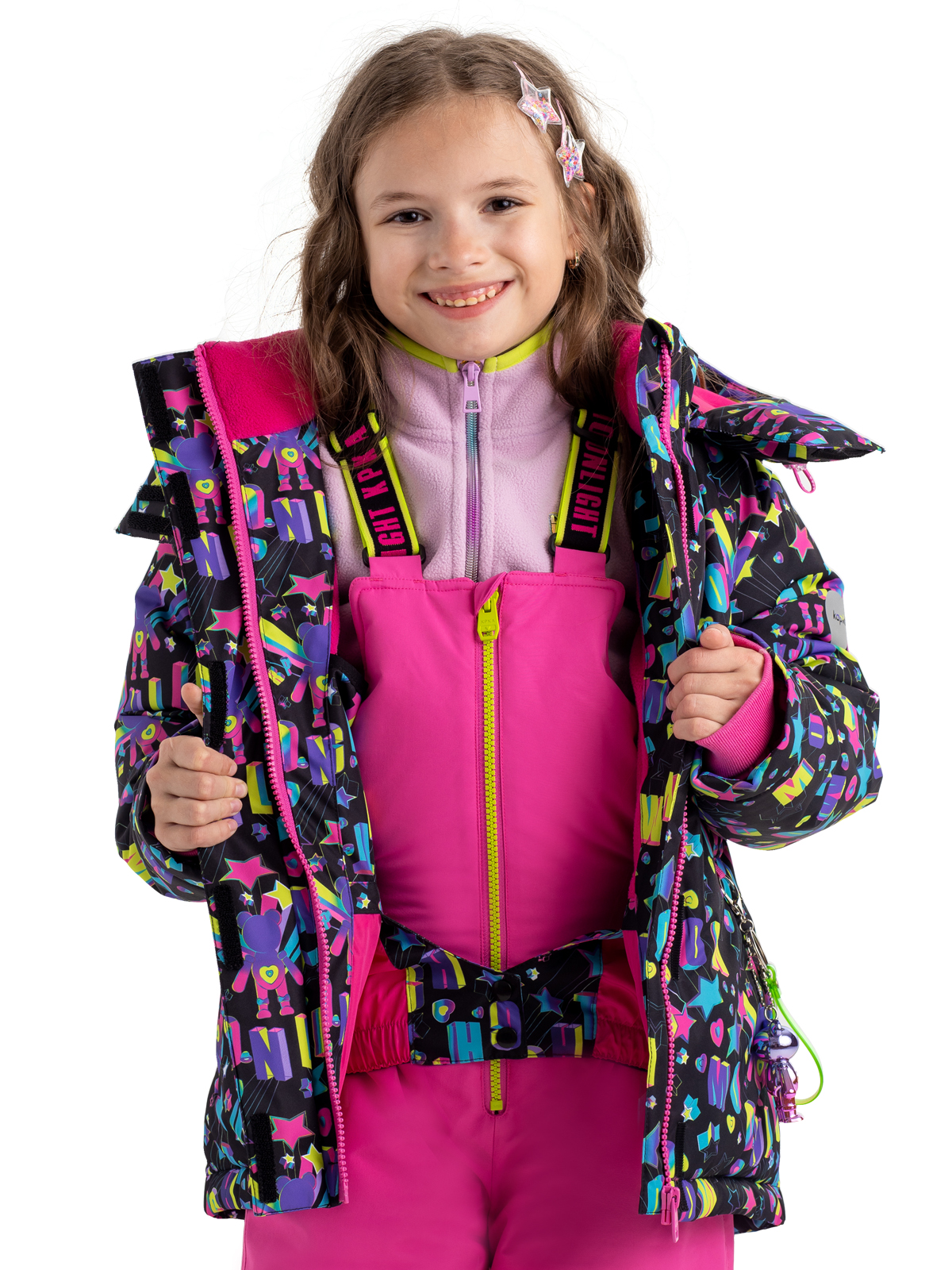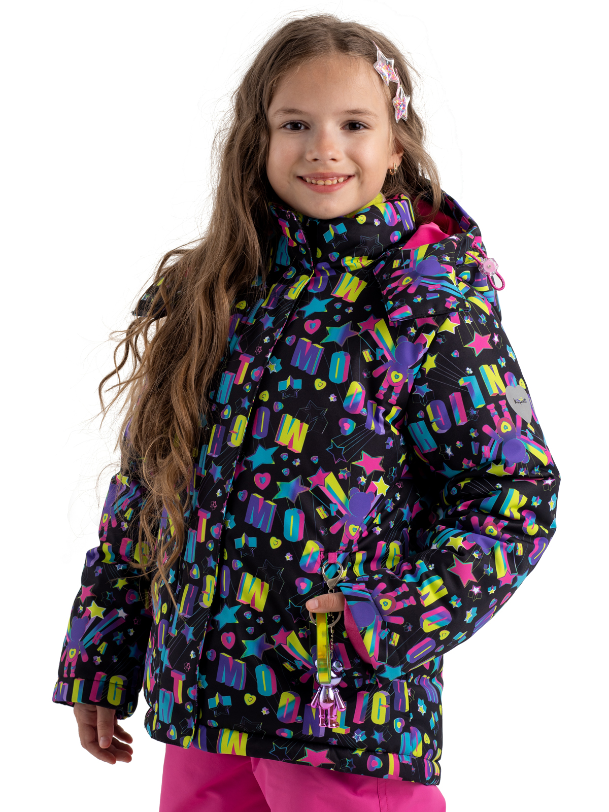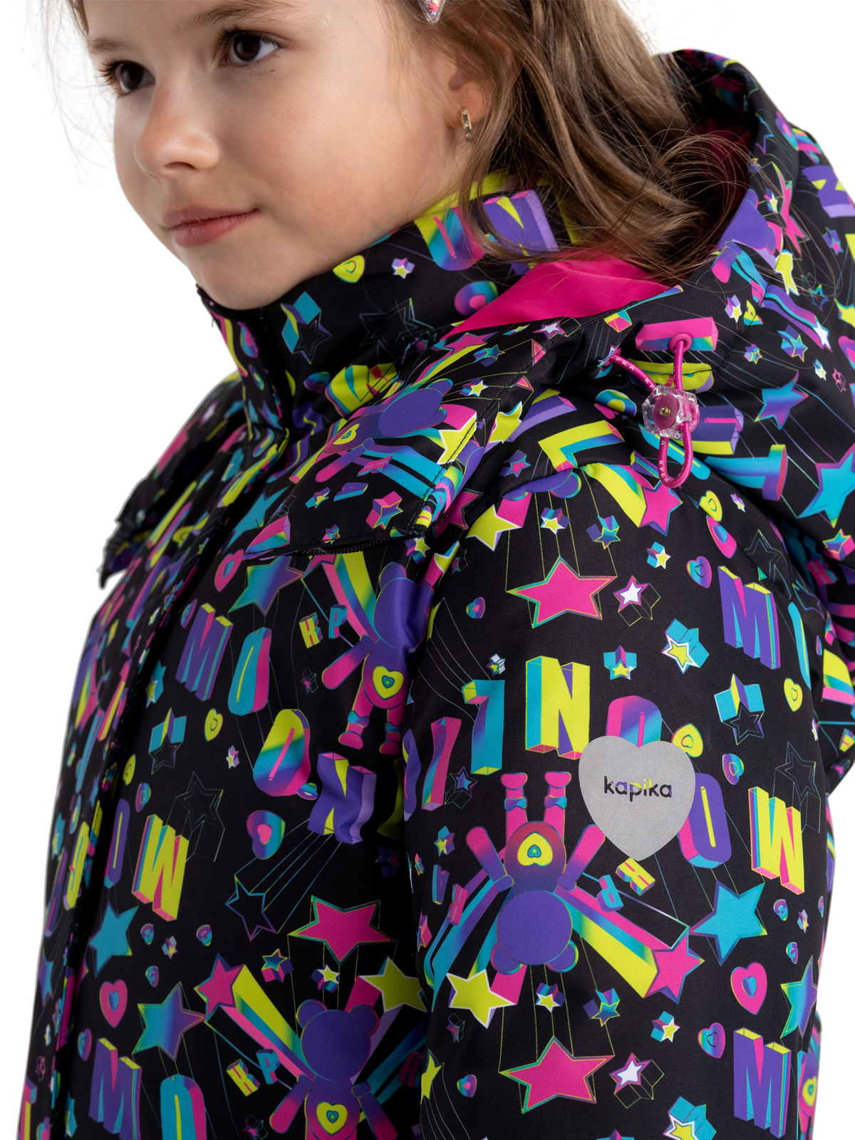 В этой зимней куртке ребенок будет не только защищен от всех зимних непогод, но и будет выглядеть ярко и стильно. Пуховик с яркими принтами изготовлен из влагозащитной, грязеотталкивающей, не продуваемой мембранной ткани 8000мм/5000г/м2/24ч, а утеплитель из искусственного пуха 350г/м2 не даст ребенку замерзнуть. Пуховик со съемным капюшоном, на регулируемой кулисе, имеет снежную «юбку», служащую для исключения попадания снега при падении или катания по глубокому снегу, а также – для защиты от ветра. Центральная молния закрыта ветрозащитной планкой, карманы на липучке. Куртка дополнена тематическими светоотражающими элементами на спинке и рукаве, защищающими в темное время суток, также имеется съемный брелок с милым мишкой. Манжеты из риба сохраняют тепло. Рефлективная подкладка с фольгированным принтом (OMNI-HEAT) эффективно удерживает тепло внутри.