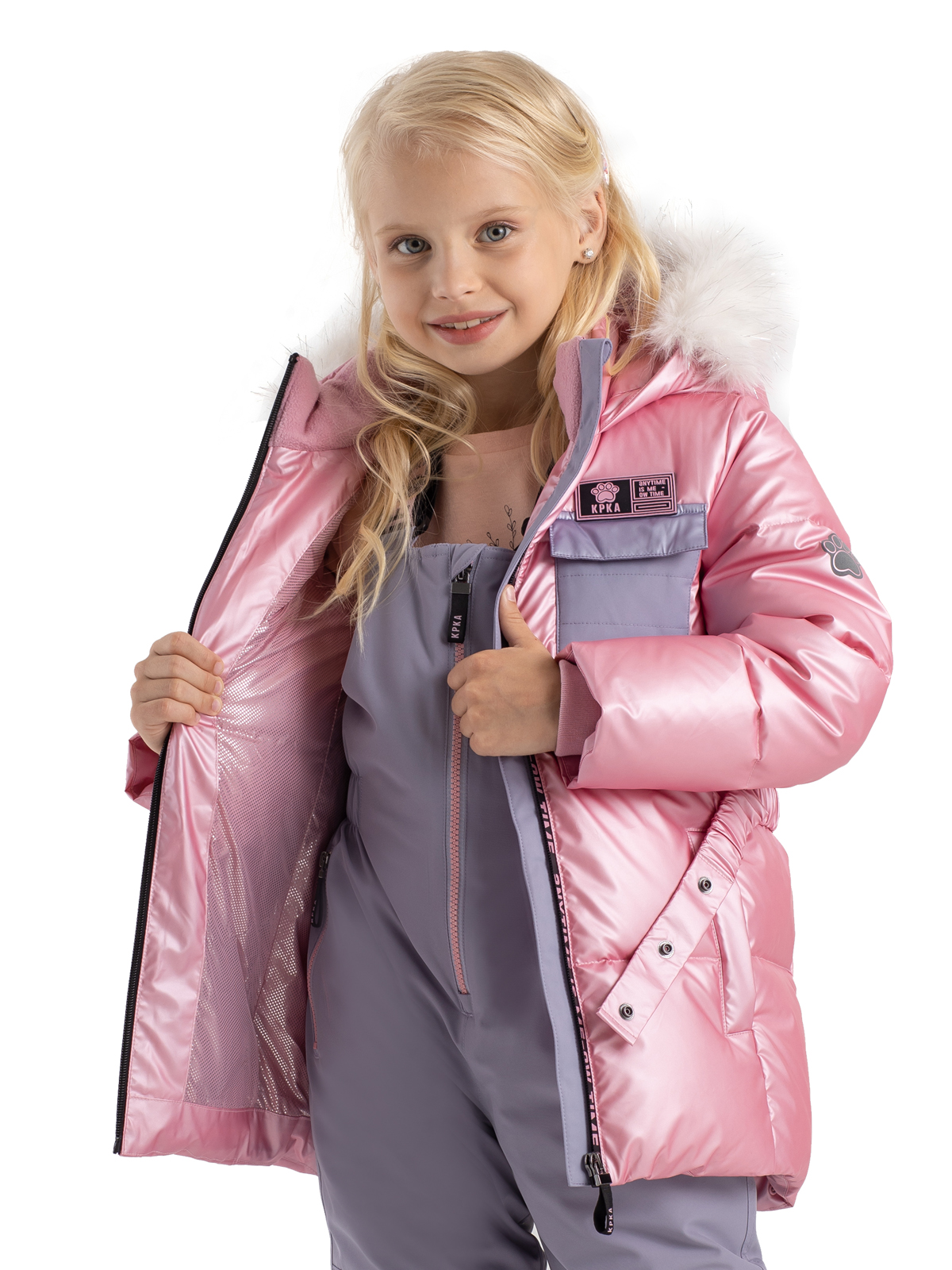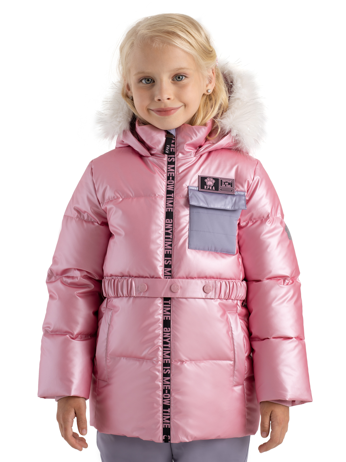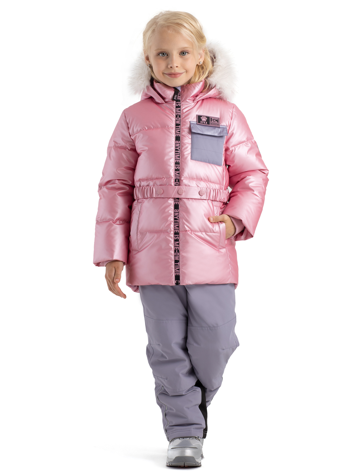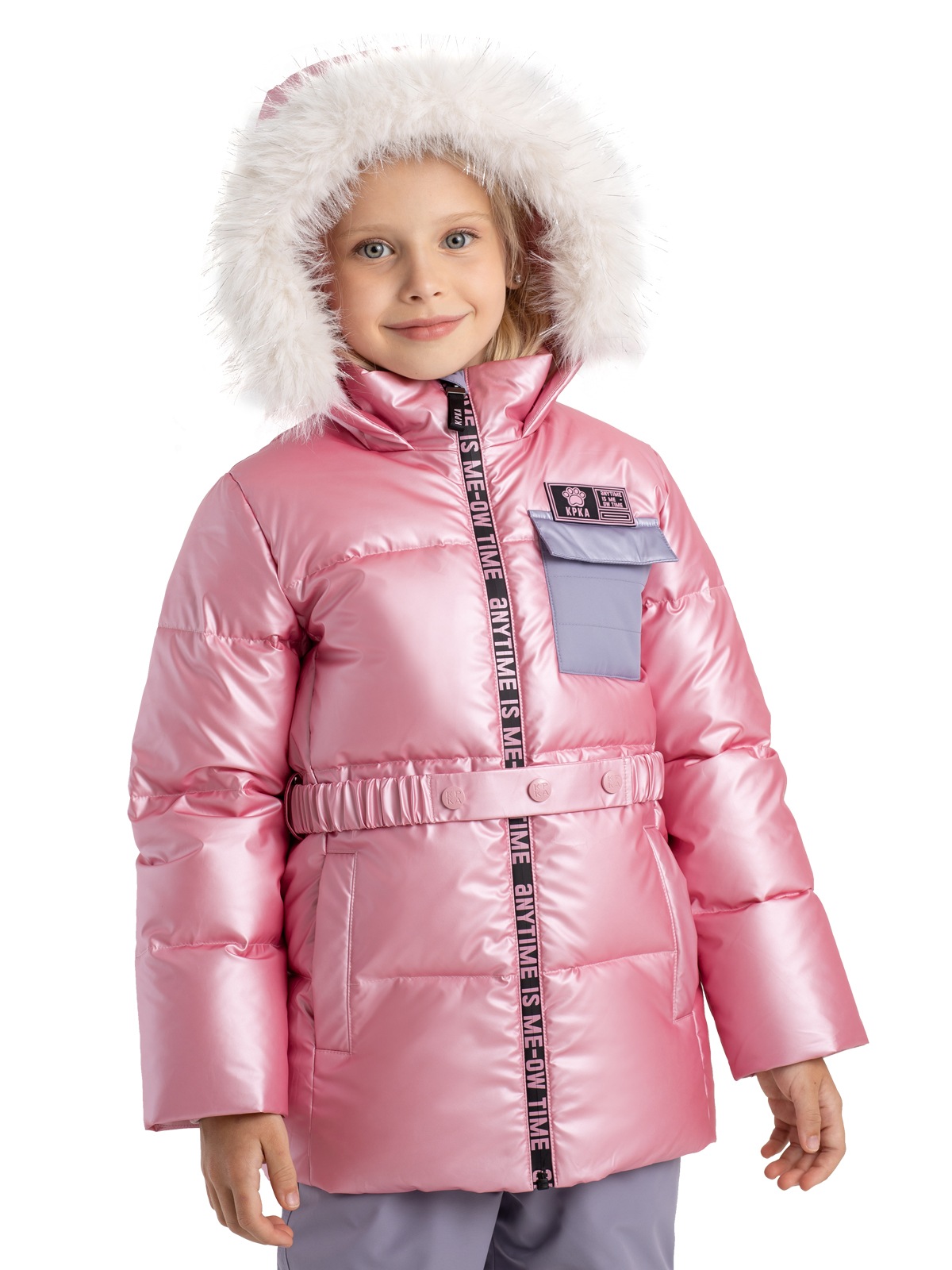 Зимняя куртка для девочки нежного розового цвета не только защищает от всех зимних непогод, но и позволяет выглядеть ярко и стильно. Пуховик влагозащитной ткани с PU-покрытием, а утеплитель из искусственного пуха 350г/м2 не даст ребенку замерзнуть. Пуховик со съемным капюшоном, на регулируемой кулисе декорирован съемным мехом, у куртки также есть съемный регулируемый пояс на кнопках. Центральная ветрозащитная, непромокаемая молния на полочке украшена принтом, карман из контрастной ткани на груди - функциональный. Куртка дополнена тематическими светоотражающими элементами на спинке и рукаве, защищающими в темное время суток. Манжеты из риба и рефлективная подкладка с фольгированным принтом (OMNI-HEAT) эффективно удерживают тепло внутри.