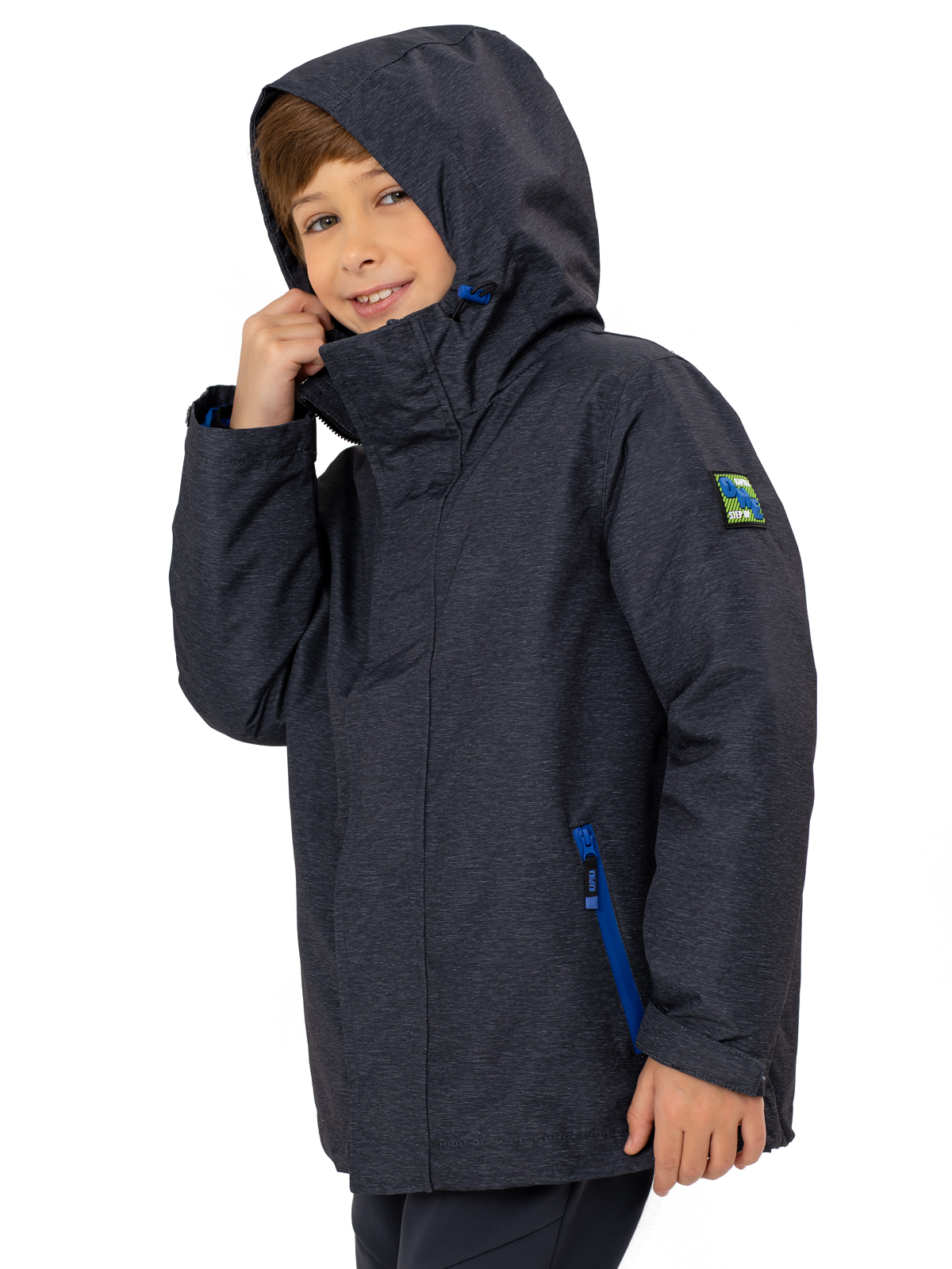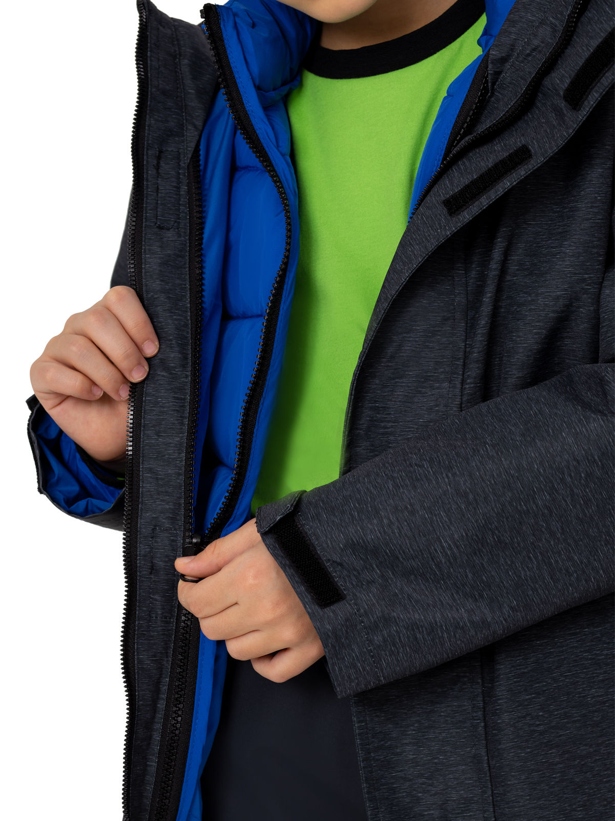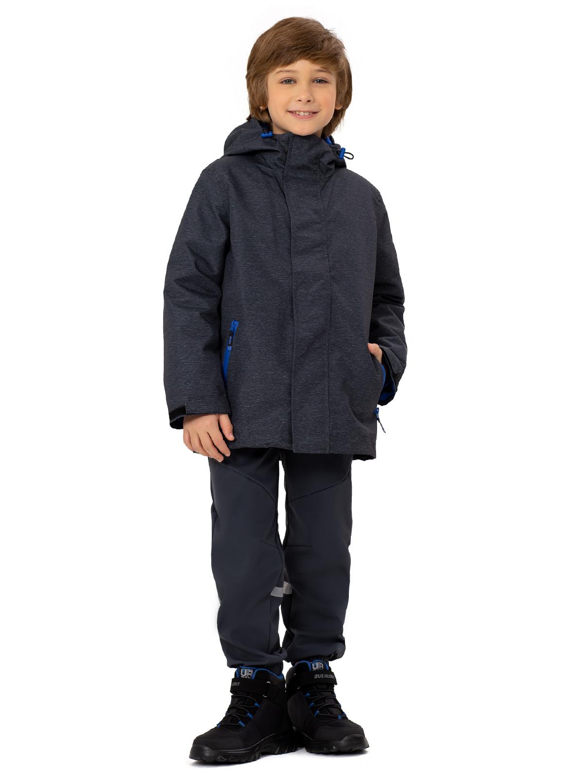Универсальная демисезонная куртка 2 в 1 для мальчика представляет собой продуманное решение для переменчивой погоды. Верхняя модель выполнена в практичном сером цвете из 100% полиэстера с современной мембраной 5000мм/5000г/м2/24ч, которая обеспечивает надёжную защиту от влаги и отличную воздухопроницаемость. Конструкция верхней куртки включает продуманные детали: центральную молнию с ветрозащитной планкой на липучках, регулируемый капюшон для индивидуальной посадки, карманы с яркими синими водозащитными молниями. Манжеты рукавов оснащены липучками для дополнительной защиты от ветра. Внутренняя куртка насыщенного синего цвета присоединяется к верхней с помощью молнии. Она отличается горизонтальной стёжкой, собственной застёжкой-молнией, функциональными карманами и утеплением из синтепона плотностью 160 г/м². Такая конструкция позволяет использовать куртку как в комплекте, так и по отдельности, что делает её максимально функциональной для различных погодных условий.