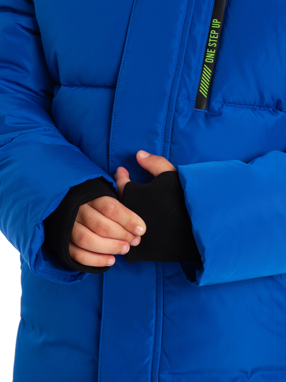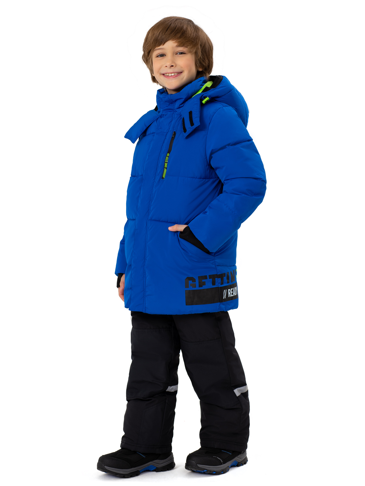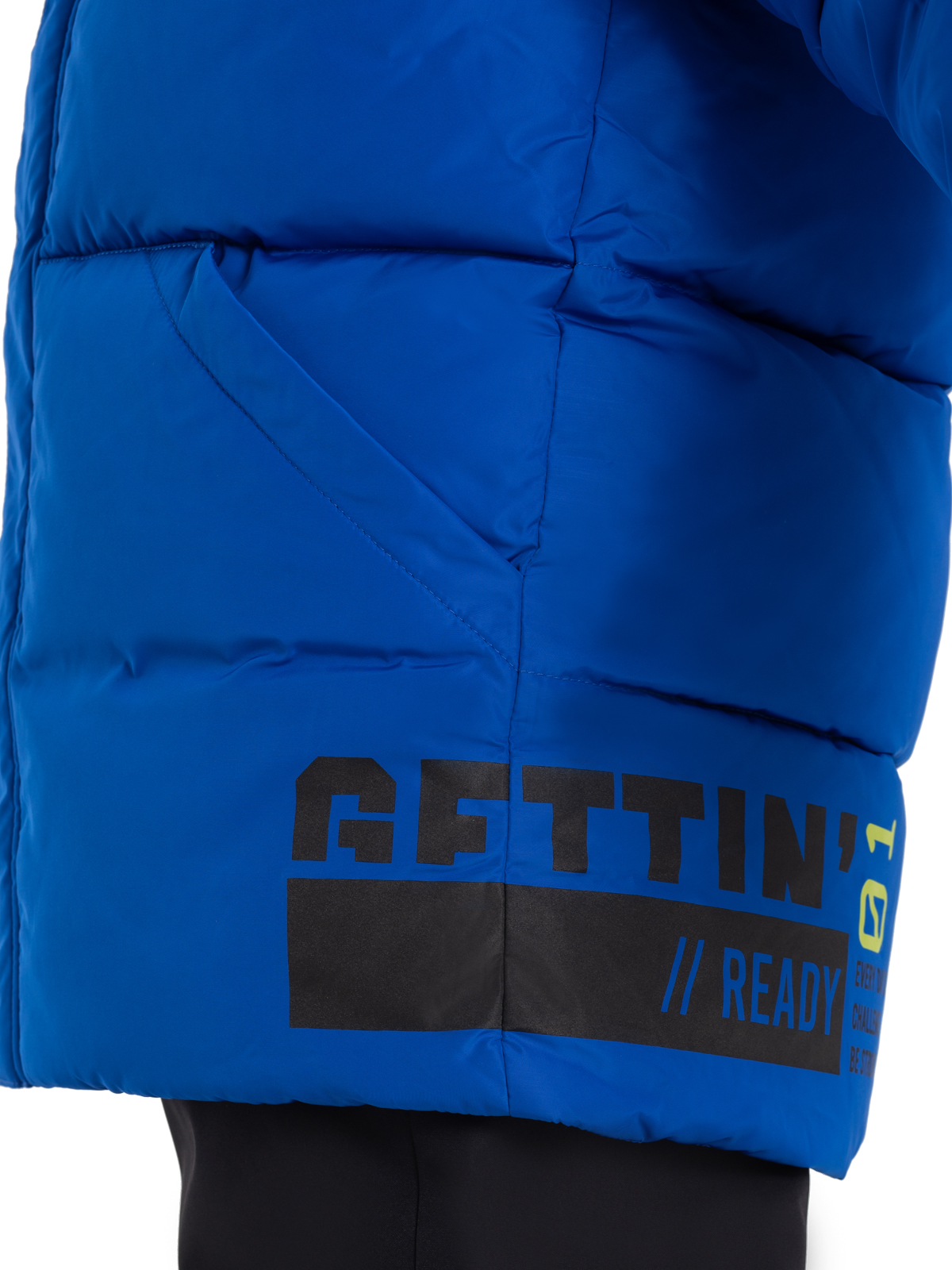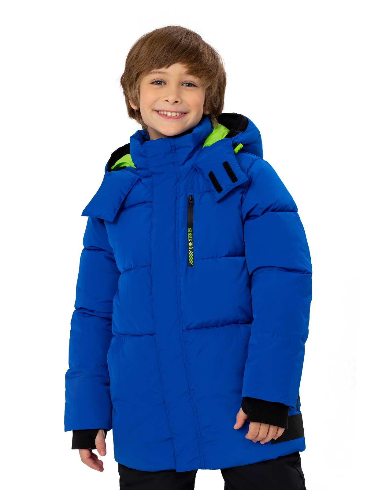Яркая удлинённая зимняя куртка насыщенного синего цвета — отличный выбор для активного мальчика. Модель изготовлена из качественного 100% полиэстера с AC-покрытием, которое надёжно защищает от влаги и загрязнений. Утеплитель из искусственного пуха плотностью 350 г/м² обеспечивает комфорт даже в сильные морозы. Практичная застёжка-молния дополнена ветрозащитной планкой для надёжной защиты от холода. Стильный дизайн подчёркивают яркие жёлтые декоративные элементы и подкладка, создающие контрастный акцент. Функциональные детали включают удобные передние карманы, нагрудный карман с водозащитной молнией и регулируемый капюшон. Эластичные манжеты с отверстиями для больших пальцев и утяжка по низу изделия обеспечивают дополнительную защиту от ветра и снега. Боковой принт придаёт куртке современный вид.