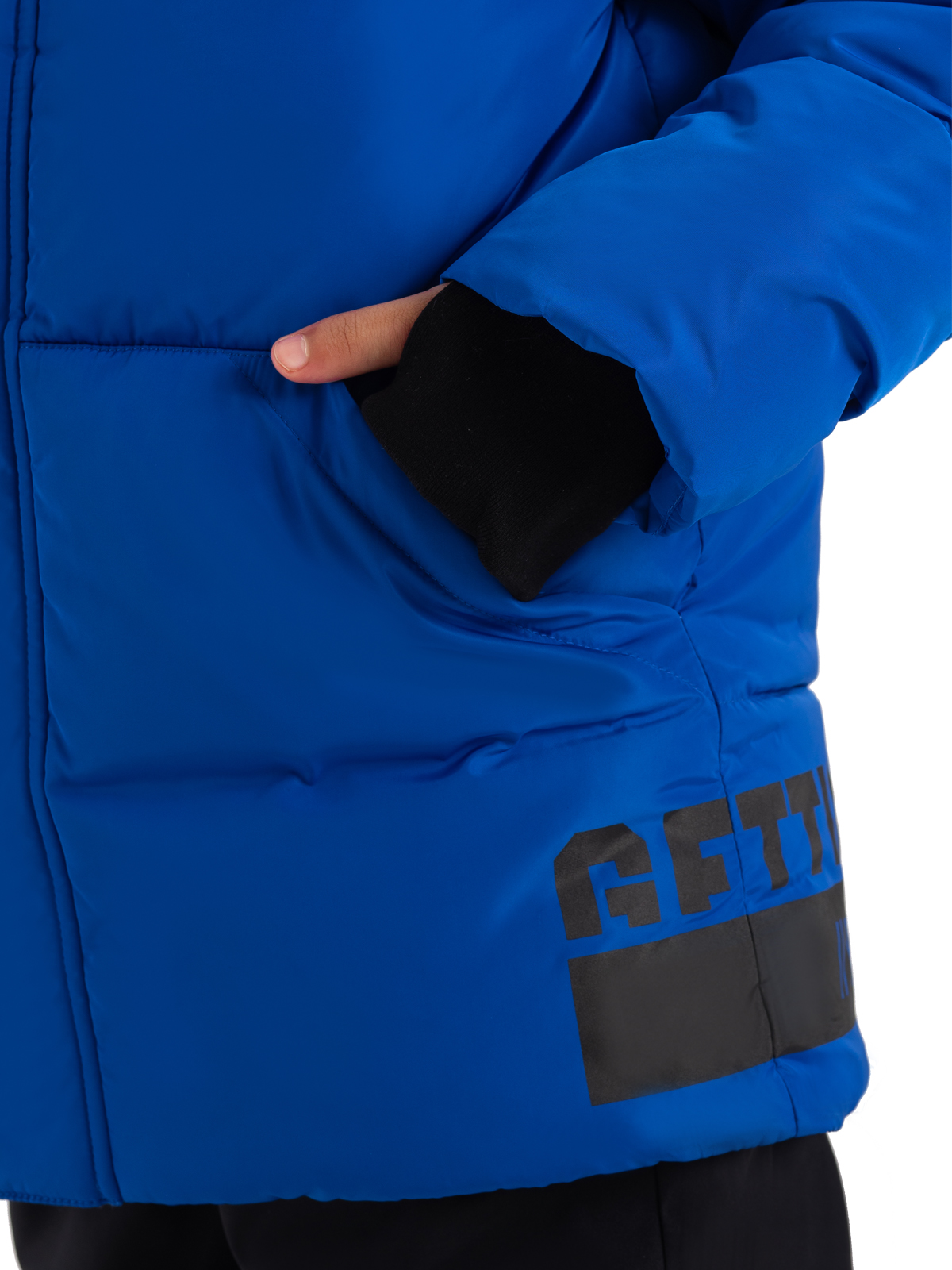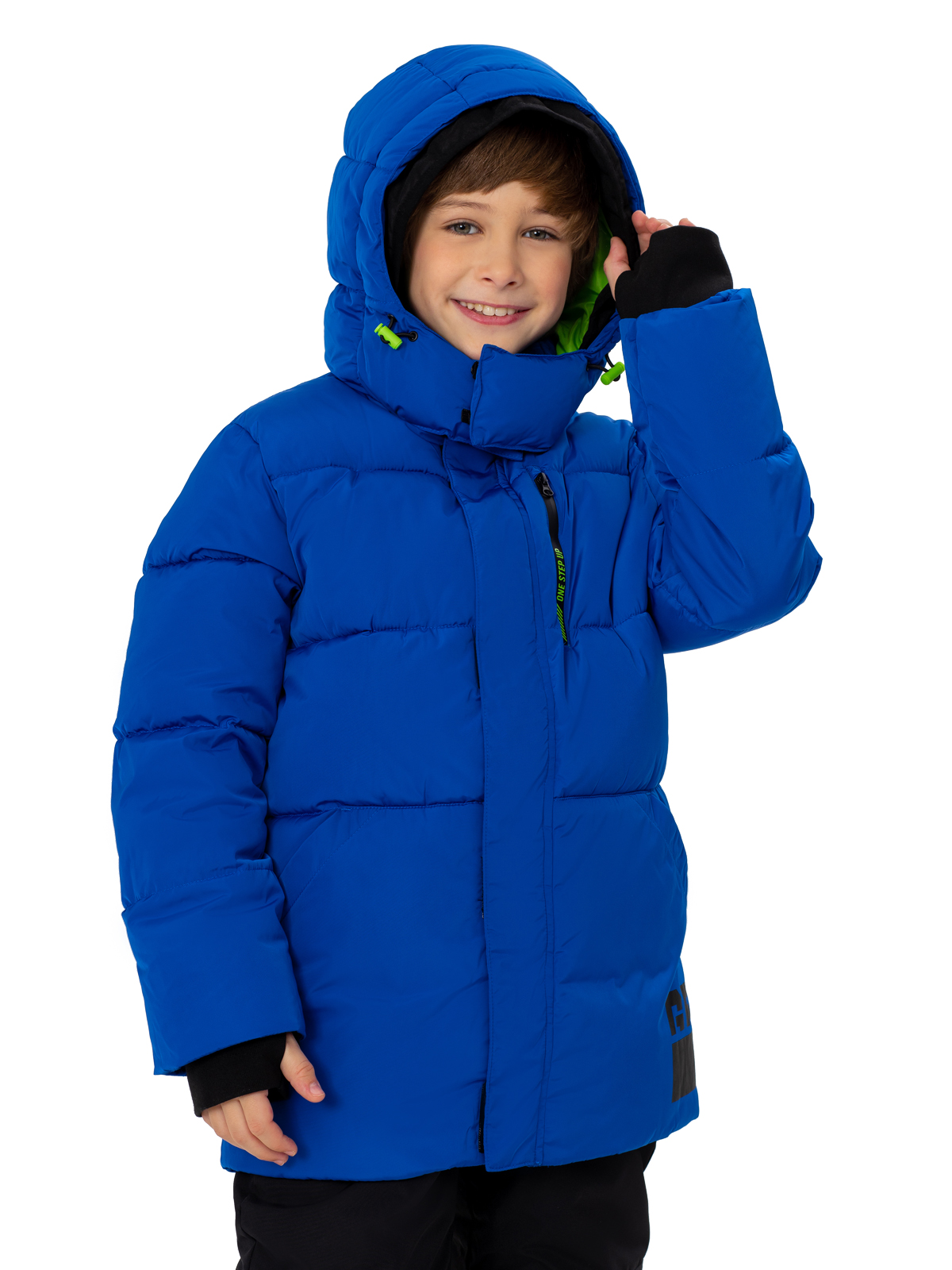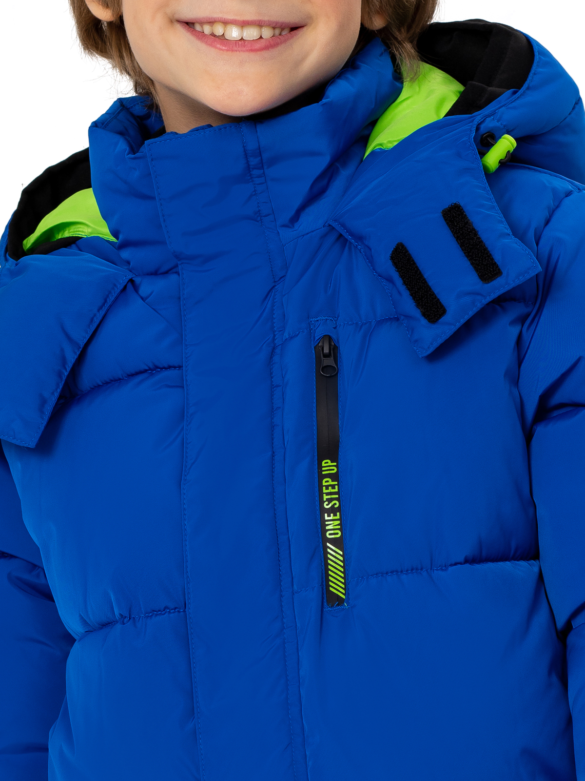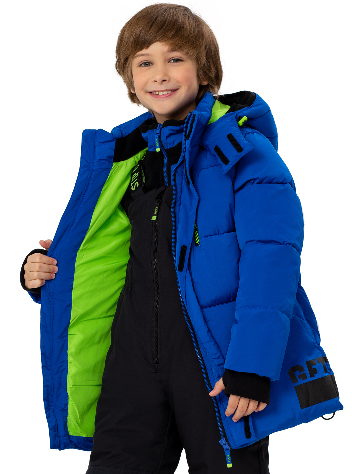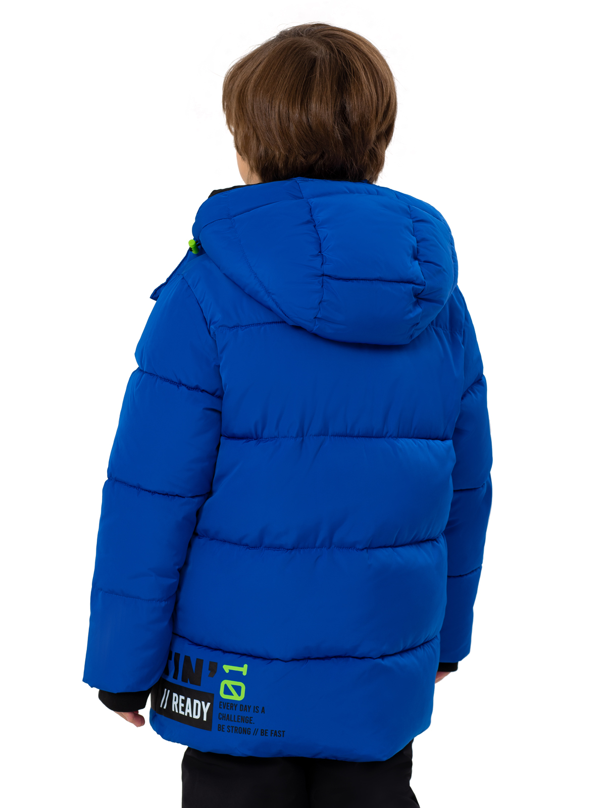 Яркая удлинённая зимняя куртка насыщенного синего цвета — отличный выбор для активного мальчика. Модель изготовлена из качественного 100% полиэстера с AC-покрытием, которое надёжно защищает от влаги и загрязнений. Утеплитель из искусственного пуха плотностью 350 г/м² обеспечивает комфорт даже в сильные морозы. Практичная застёжка-молния дополнена ветрозащитной планкой для надёжной защиты от холода. Стильный дизайн подчёркивают яркие жёлтые декоративные элементы и подкладка, создающие контрастный акцент. Функциональные детали включают удобные передние карманы, нагрудный карман с водозащитной молнией и регулируемый капюшон. Эластичные манжеты с отверстиями для больших пальцев и утяжка по низу изделия обеспечивают дополнительную защиту от ветра и снега. Боковой принт придаёт куртке современный вид.