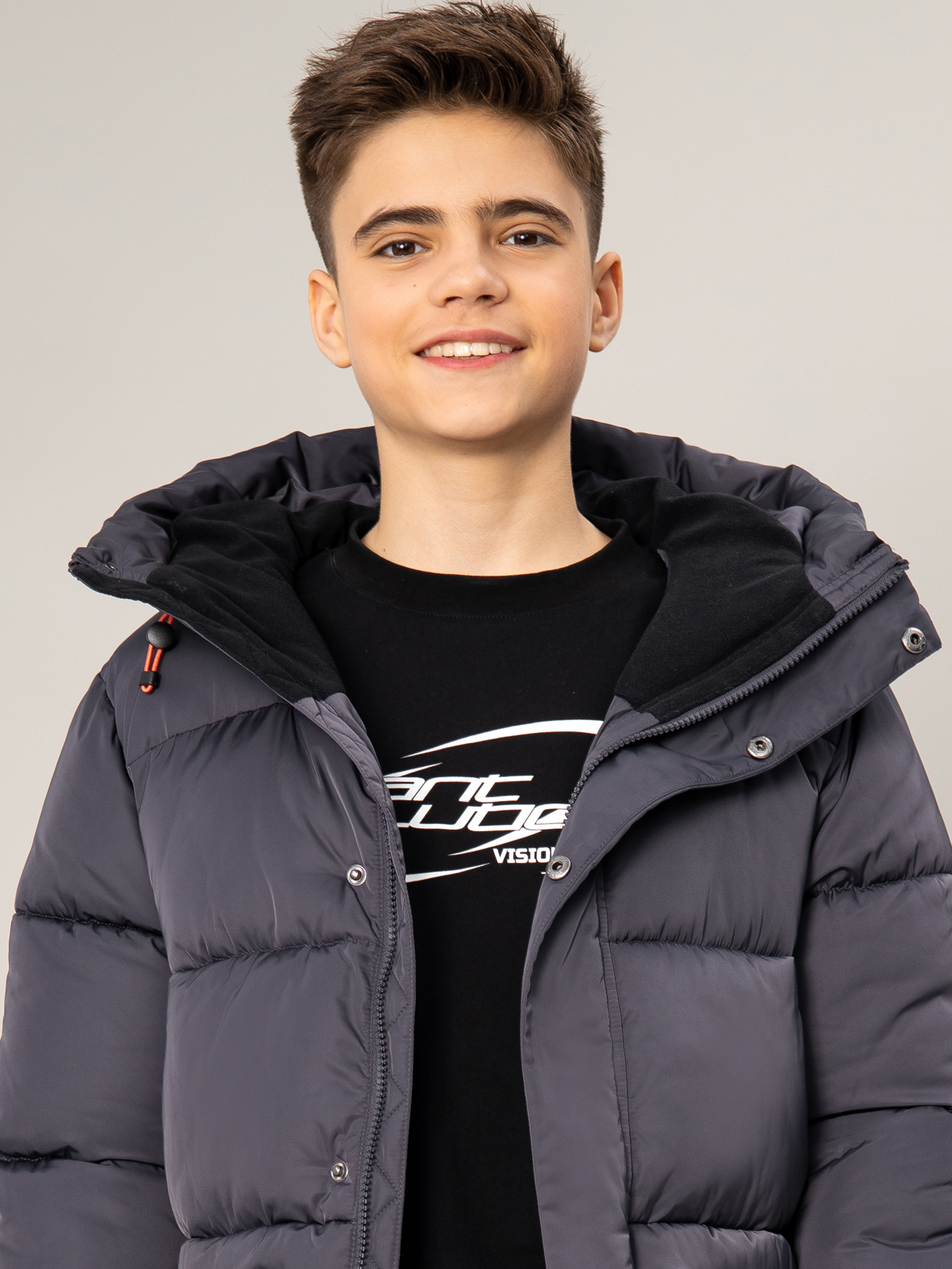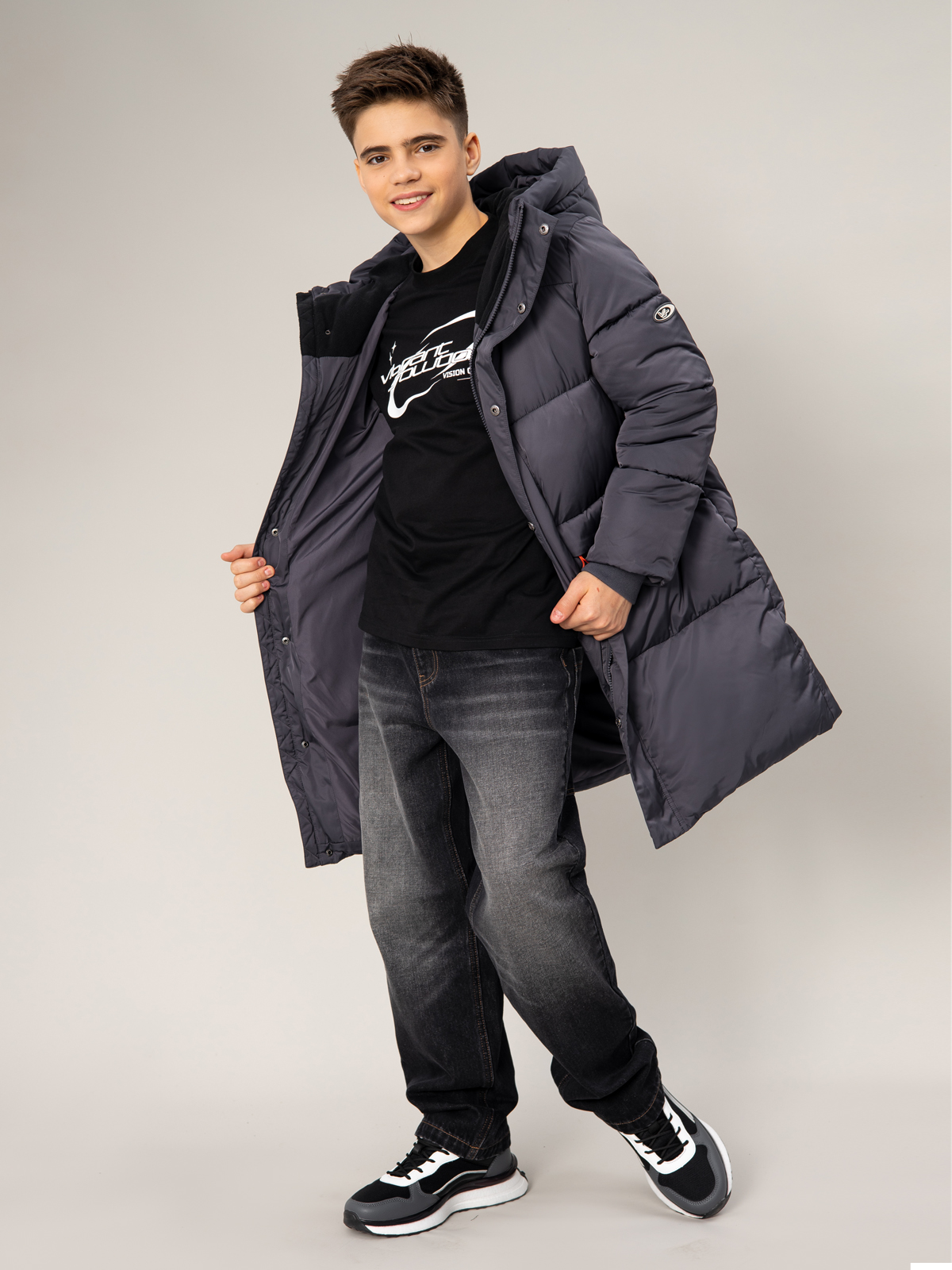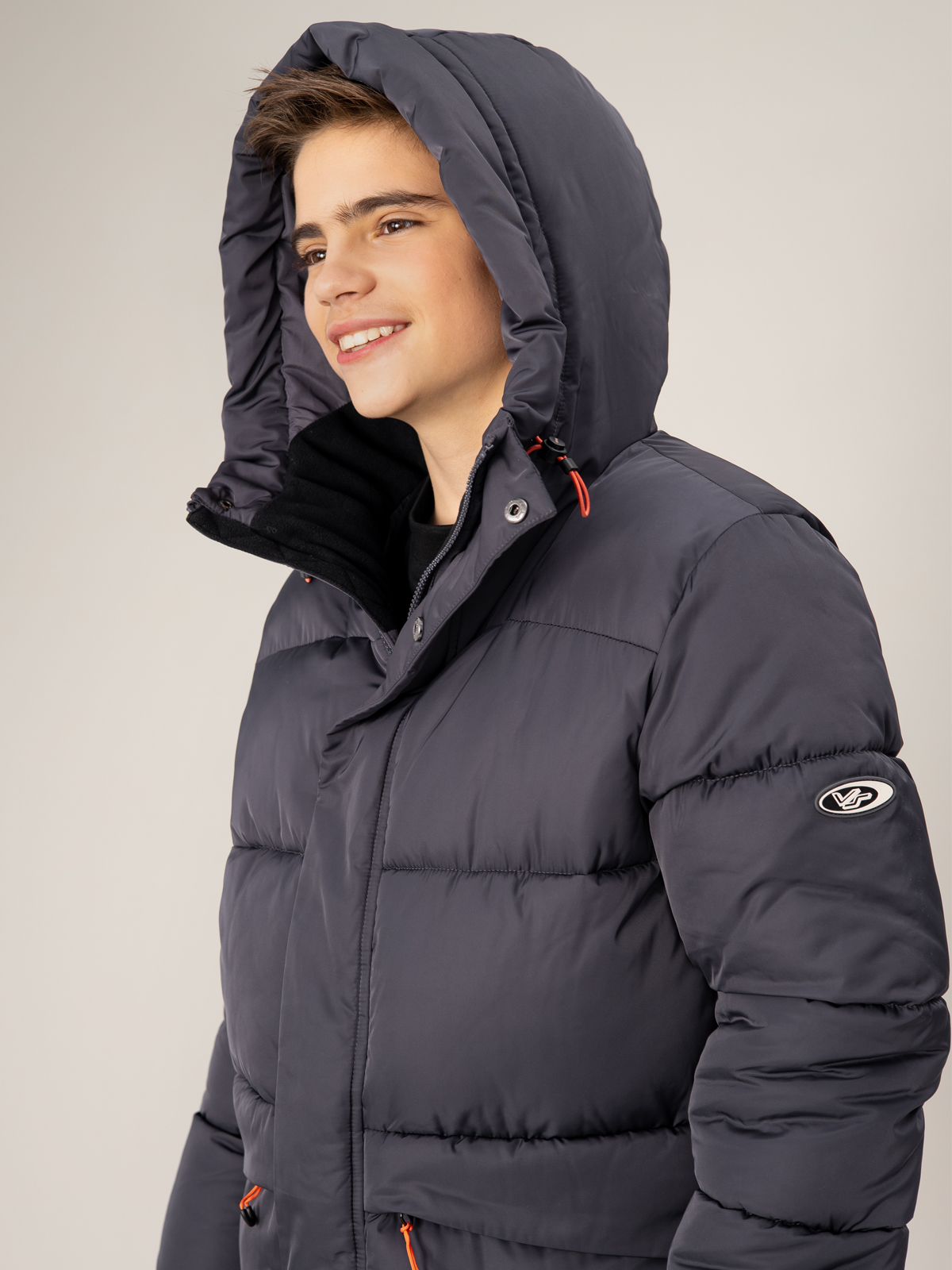Тёплый стёганый пуховик для мальчика в тёмно-сером цвете — надёжная защита от холода в зимний период. Утеплитель из искусственного пуха плотностью 350 г/м² обеспечивает превосходную теплоизоляцию, а водоотталкивающая АС пропитка надежно защищает от влаги. Модель оснащена практичными элементами: регулируемым капюшоном, застёжкой-молнией с ветрозащитной планкой и двумя удобными карманами. Эластичные манжеты надёжно защищают от проникновения холодного воздуха. Яркая контрастная фурнитура добавляет изделию современный вид и делает его заметным в толпе. Удлинённый крой обеспечивает дополнительную защиту от холода, что особенно важно в зимнее время.