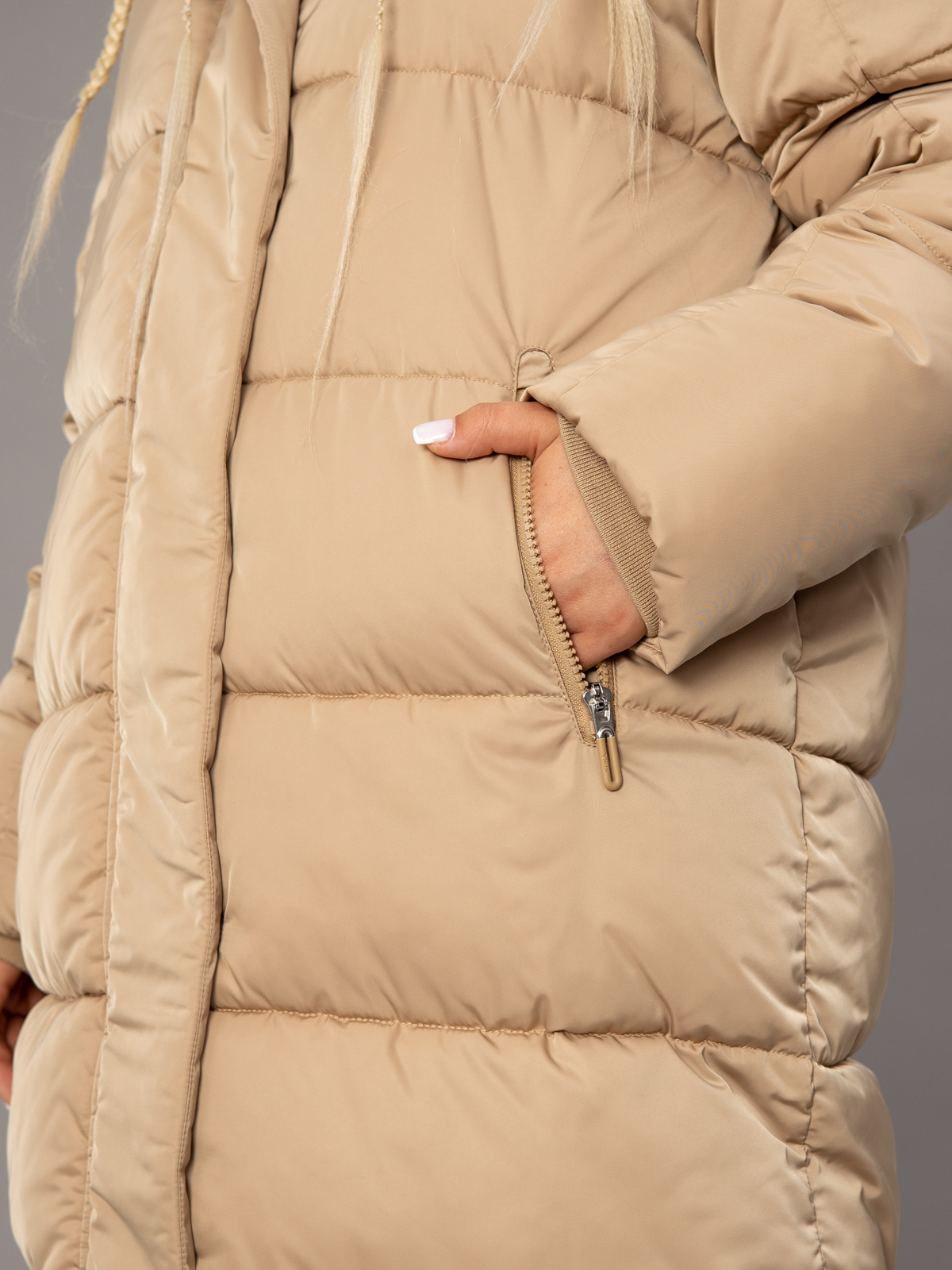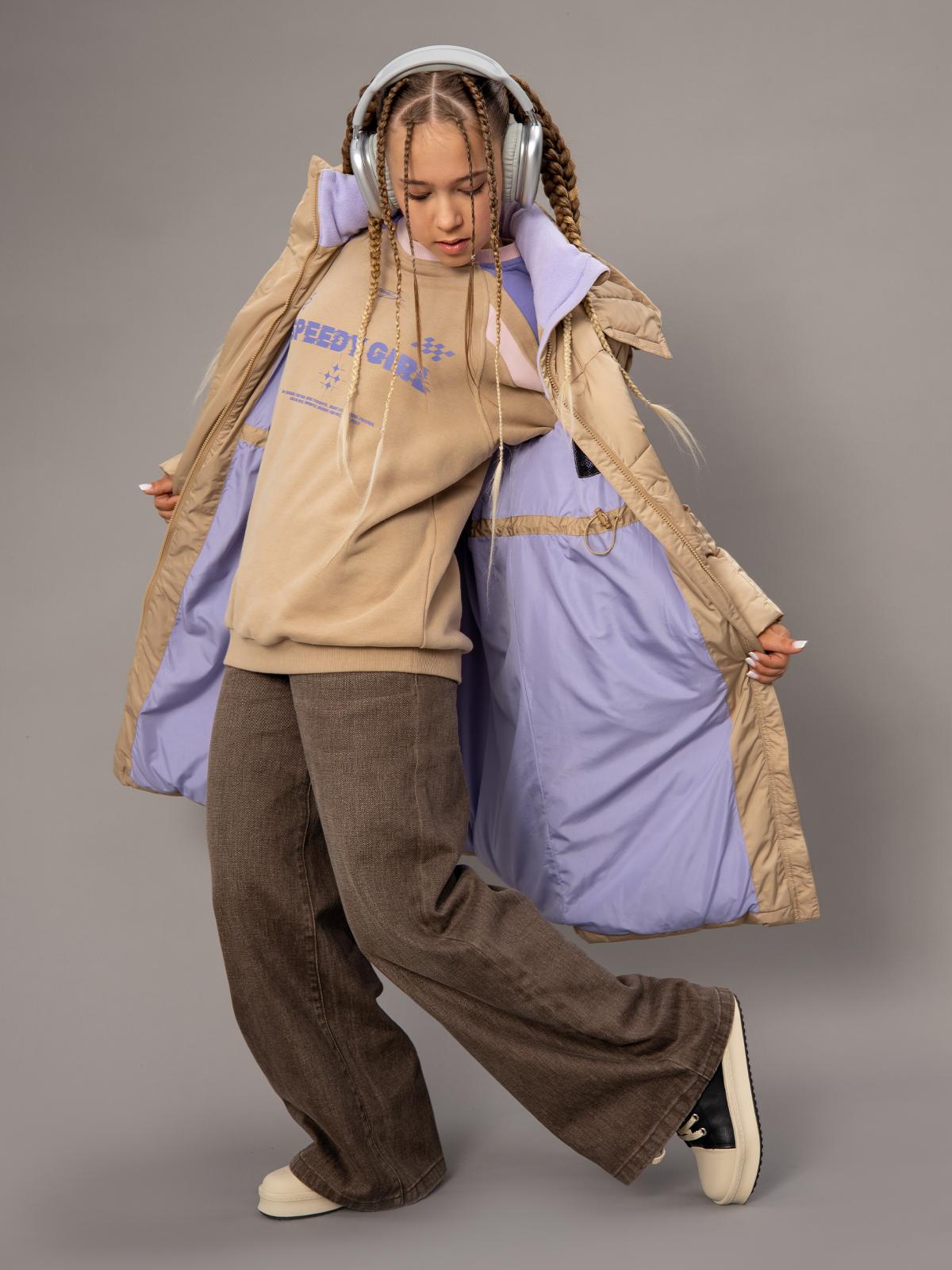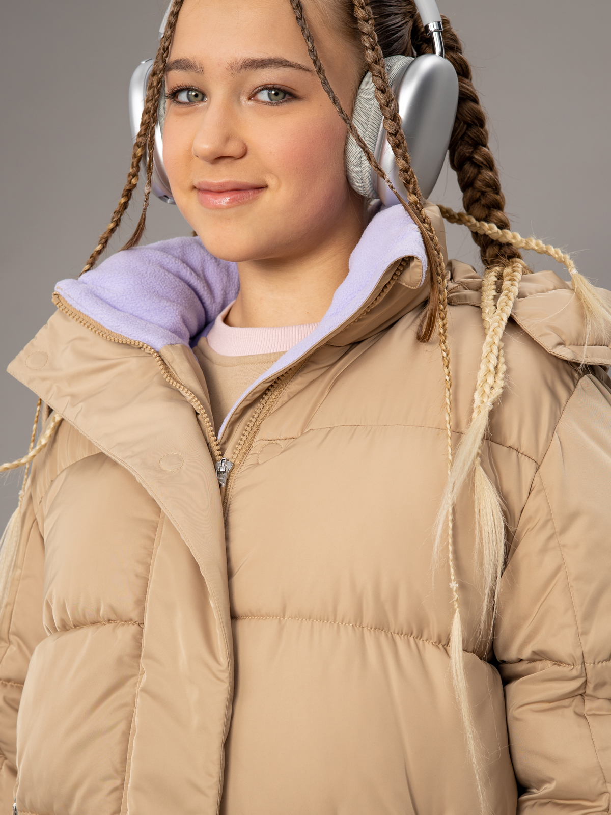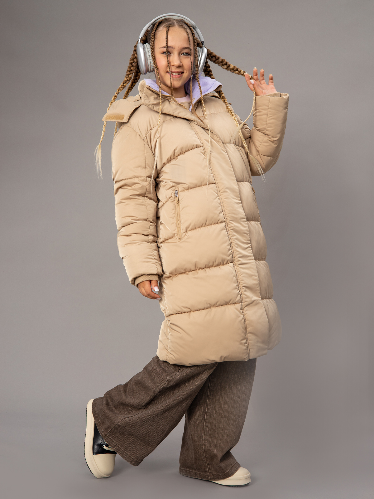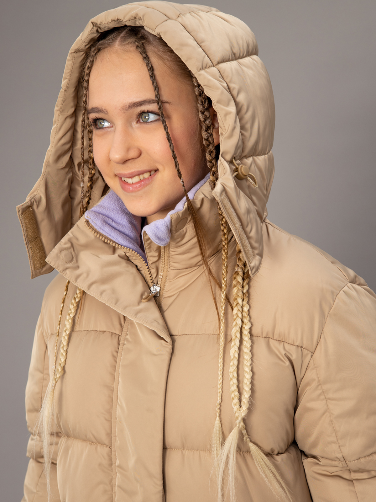 Тёплый удлинённый стёганый пуховик для девочки в бежевом цвете — надёжная защита от холода. Утеплитель из искусственного пуха плотностью 350 г/м² обеспечивает отличную теплоизоляцию даже в сильные морозы, а водоотталкивающее АС покрытие надежно защищает от влаги. Функциональная модель оснащена съёмным капюшоном, который можно регулировать в зависимости от погодных условий. Застёжка-молния с ветрозащитной планкой надёжно защищает от проникновения холода. Практичные детали включают карманы на молнии для безопасного хранения вещей, внутреннюю утяжку по талии для идеальной посадки и эластичные манжеты из риба по низу рукавов. Контрастная сиреневая подкладка добавляет изделию стильный акцент.