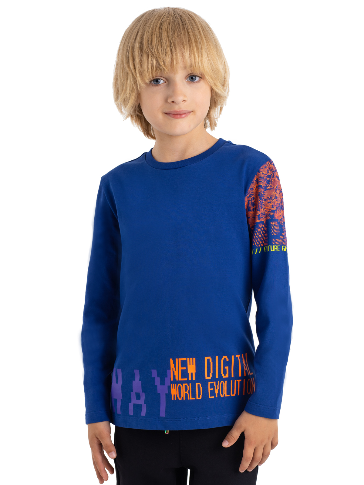 Лонгслив для мальчика в трендовом цвете выполнен из высококачественного мягкого хлопка. Модель свободного кроя и спущенной линией плеча дополнена горловиной из эластичного риба. Футболка с длинным рукавом имеет вставку контрастного цвета по спине изделия, и акцентирована шрифтовыми принтами. Все швы аккуратно обработаны, и благодаря качественному хлопку лонгслив приятно носить и легко стирать.