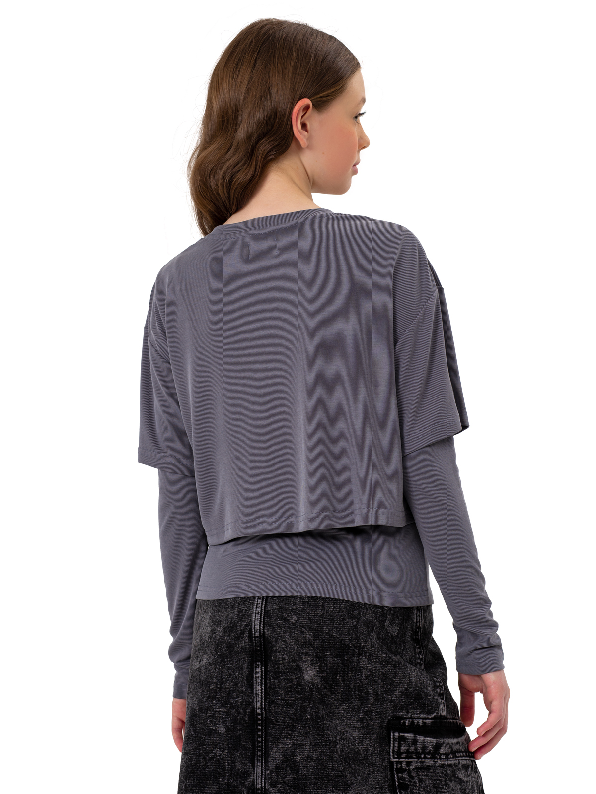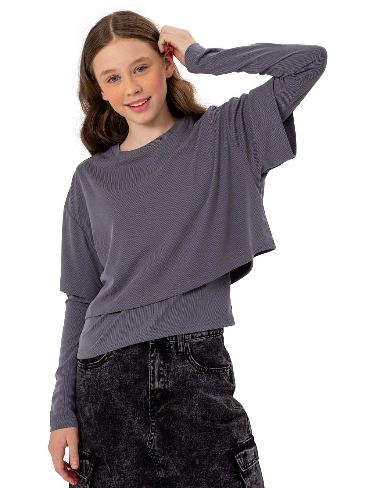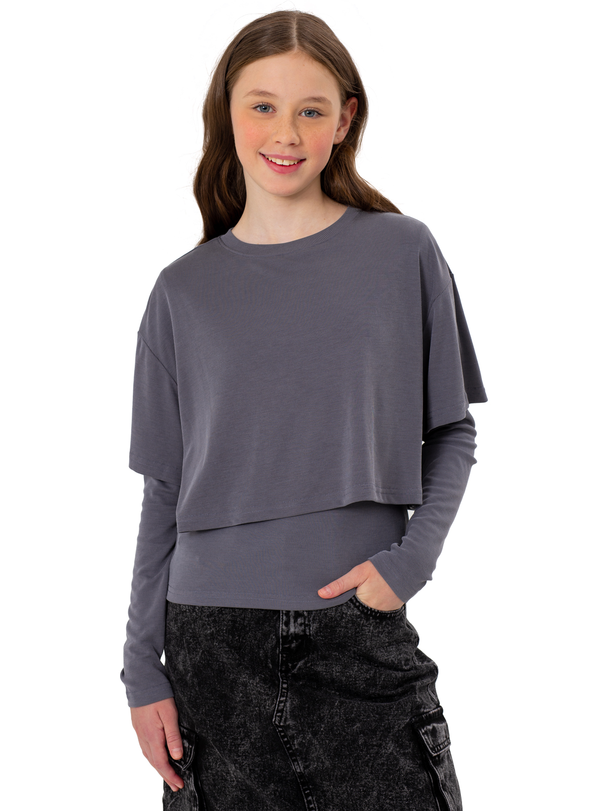 Оригинальный лонгслив для девочки-подростка с эффектным дизайном «два в одном» станет настоящим хитом в гардеробе. Модель выполнена из премиальной ткани с содержанием модала и полиэстера, что обеспечивает превосходную мягкость и долговечность. Особая конструкция, имитирующая надетую поверх футболку, создаёт модный многослойный силуэт, актуальный в подростковой моде. Материал приятен к телу, отлично держит форму и не теряет цвет после стирки. Практичная и стильная модель идеально подходит для создания модных образов и повседневной носки. Сочетание качества и дизайна делает этот лонгслив отличным выбором для современной девушки.