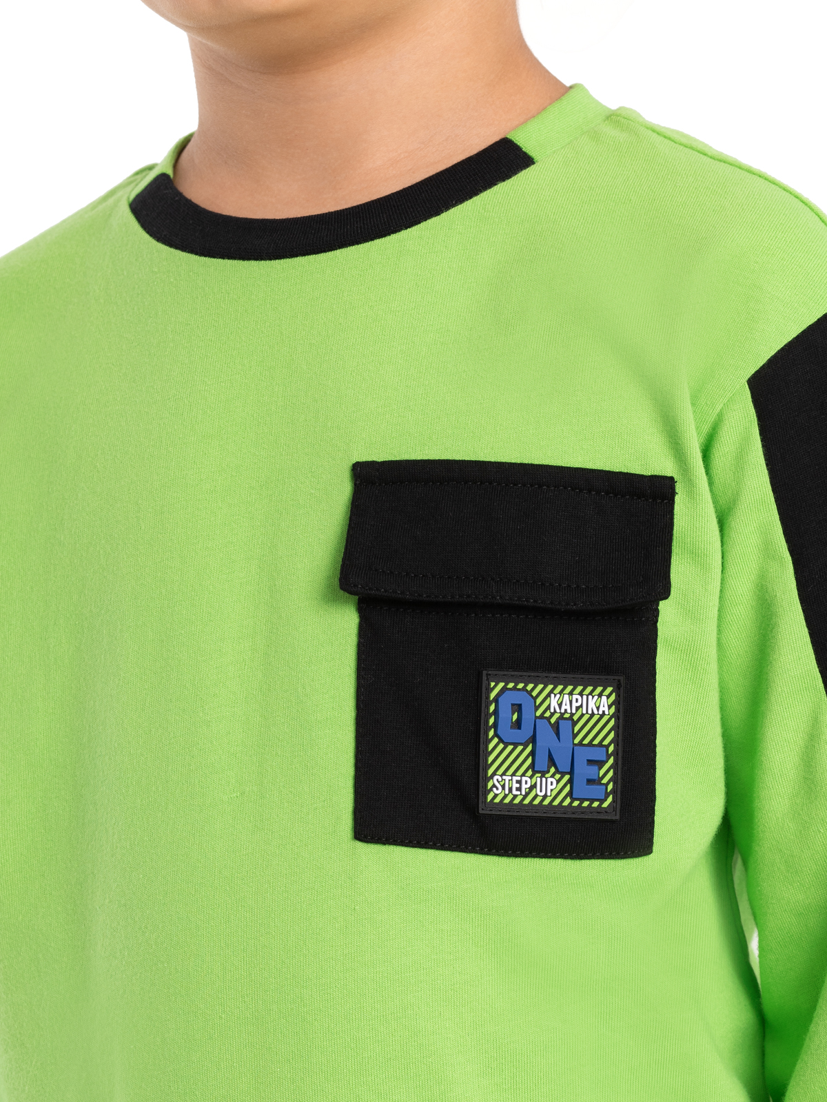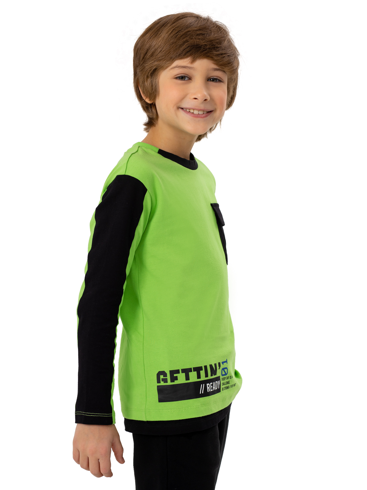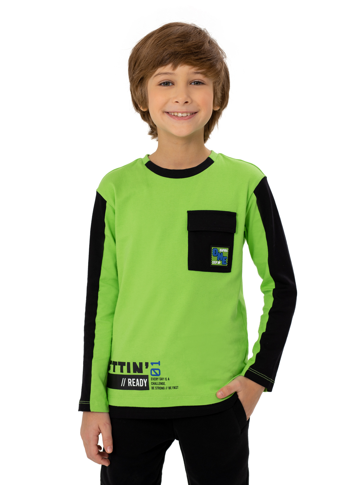 Яркий и стильный лонгслив в сочном салатовом цвете станет настоящей находкой для активного мальчика. Модель выделяется чёрными вставками, которые создают современный спортивный силуэт. Функциональный накладной карман на груди не только украшает изделие, но и делает его практичным. Оригинальный принт добавляет индивидуальности образу. Натуральный 100% хлопок обеспечивает комфорт при носке и отличную воздухопроницаемость.