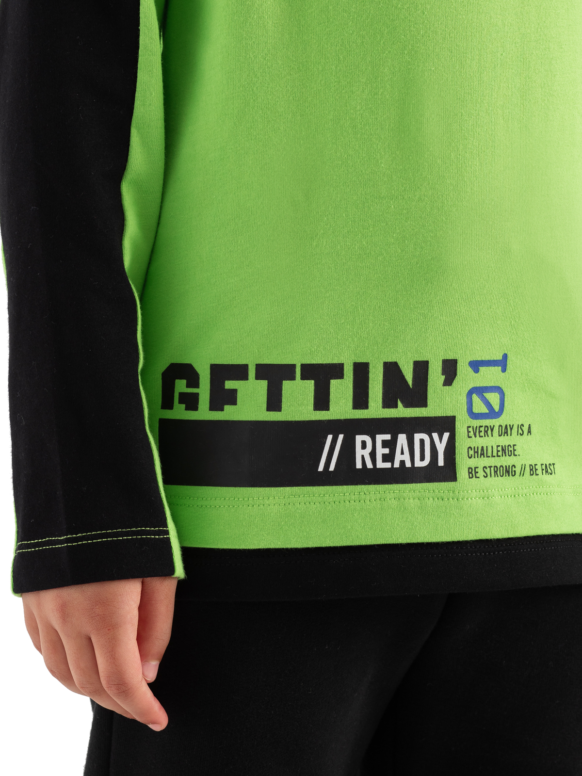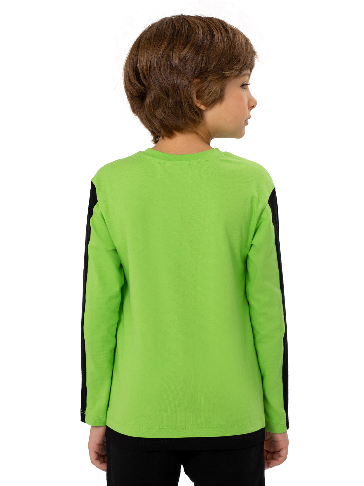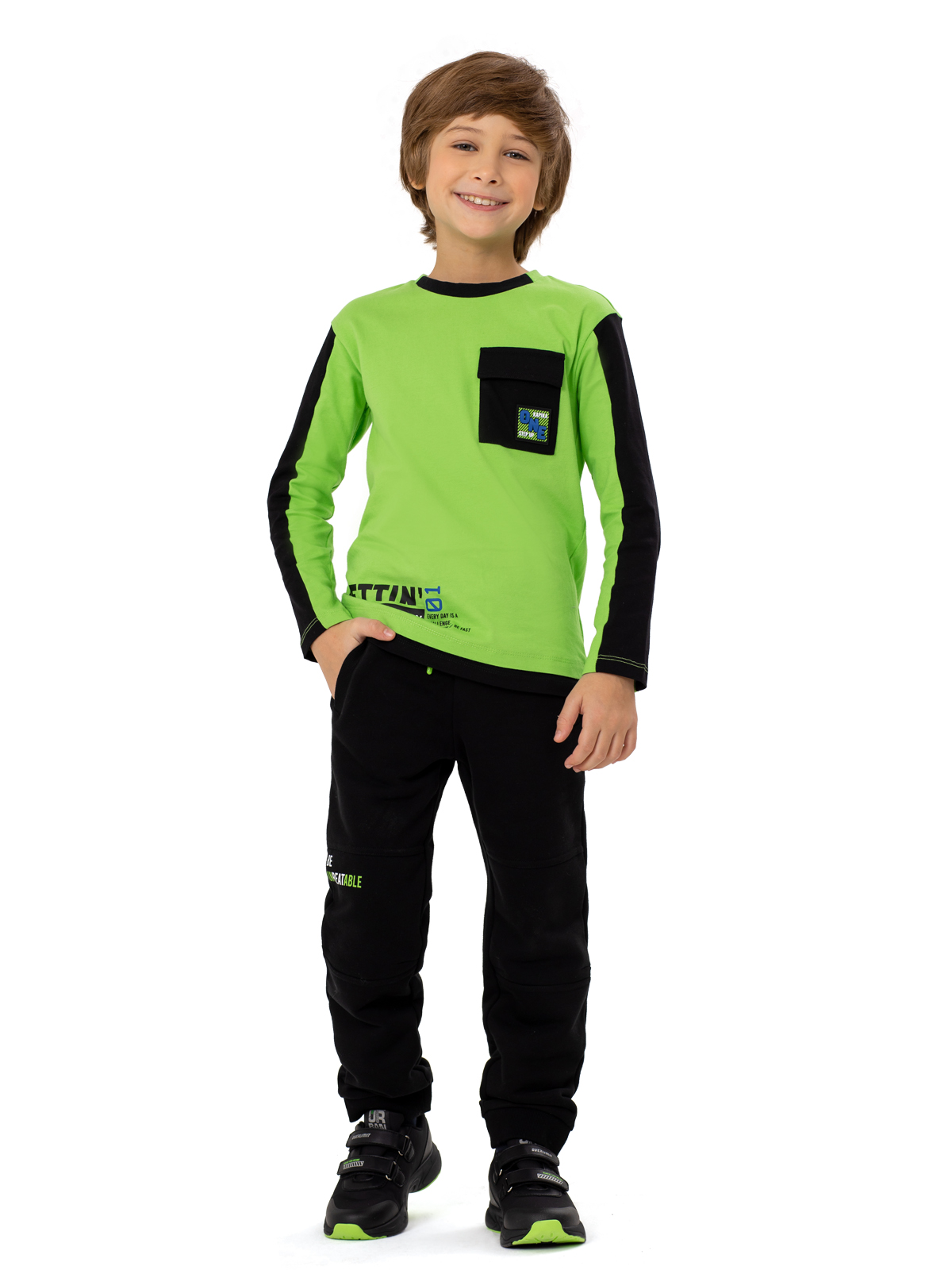 Яркий и стильный лонгслив в сочном салатовом цвете станет настоящей находкой для активного мальчика. Модель выделяется чёрными вставками, которые создают современный спортивный силуэт. Функциональный накладной карман на груди не только украшает изделие, но и делает его практичным. Оригинальный принт добавляет индивидуальности образу. Натуральный 100% хлопок обеспечивает комфорт при носке и отличную воздухопроницаемость.