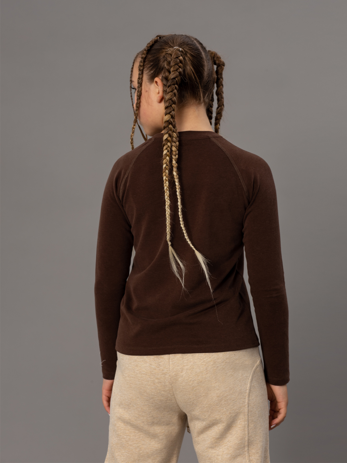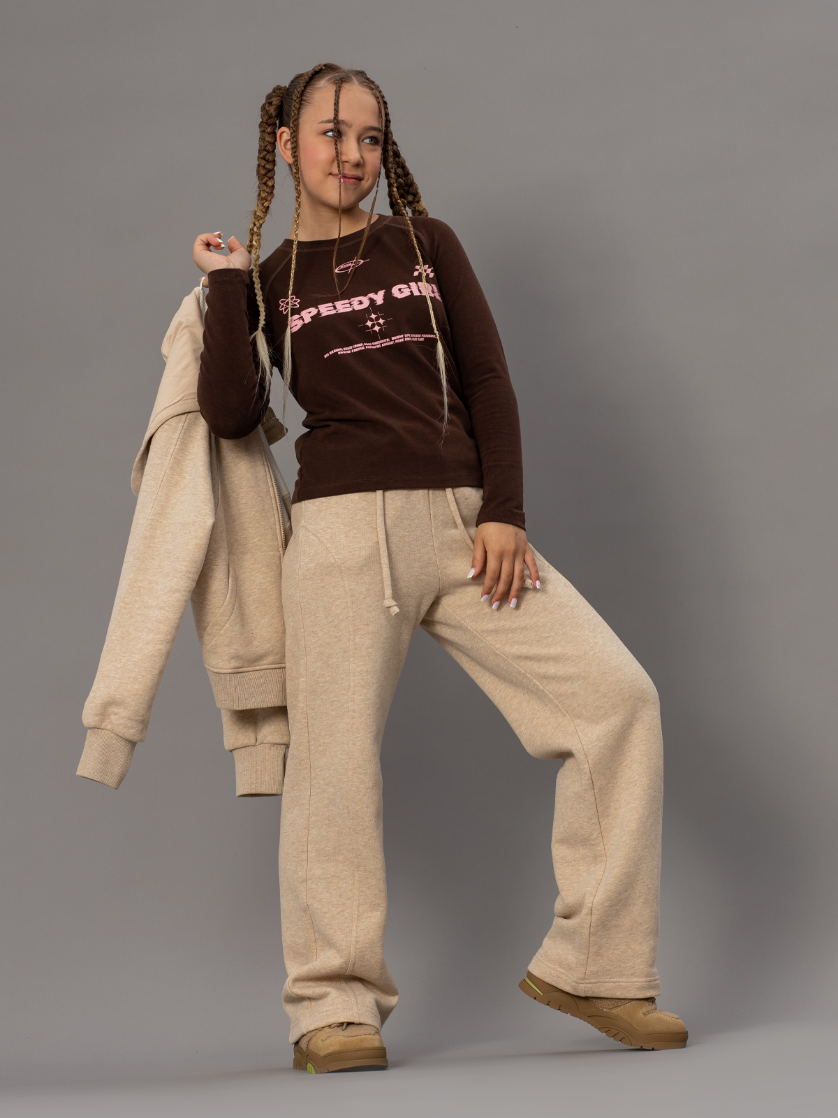 Лонгслив для девочки в коричневом цвете. Модель украшена контрастным принтом на груди и отличается удобной посадкой, которая не стесняет движений. Материал изделия — качественная смесь хлопка и вискозы с добавлением эластана. Такая комбинация делает лонгслив особенно комфортным в носке: ткань приятна к телу, хорошо тянется и отлично сохраняет форму после стирки. Благодаря универсальному дизайну и приятной ткани лонгслив подарит комфорт в течение всего дня и поможет создать множество стильных образов