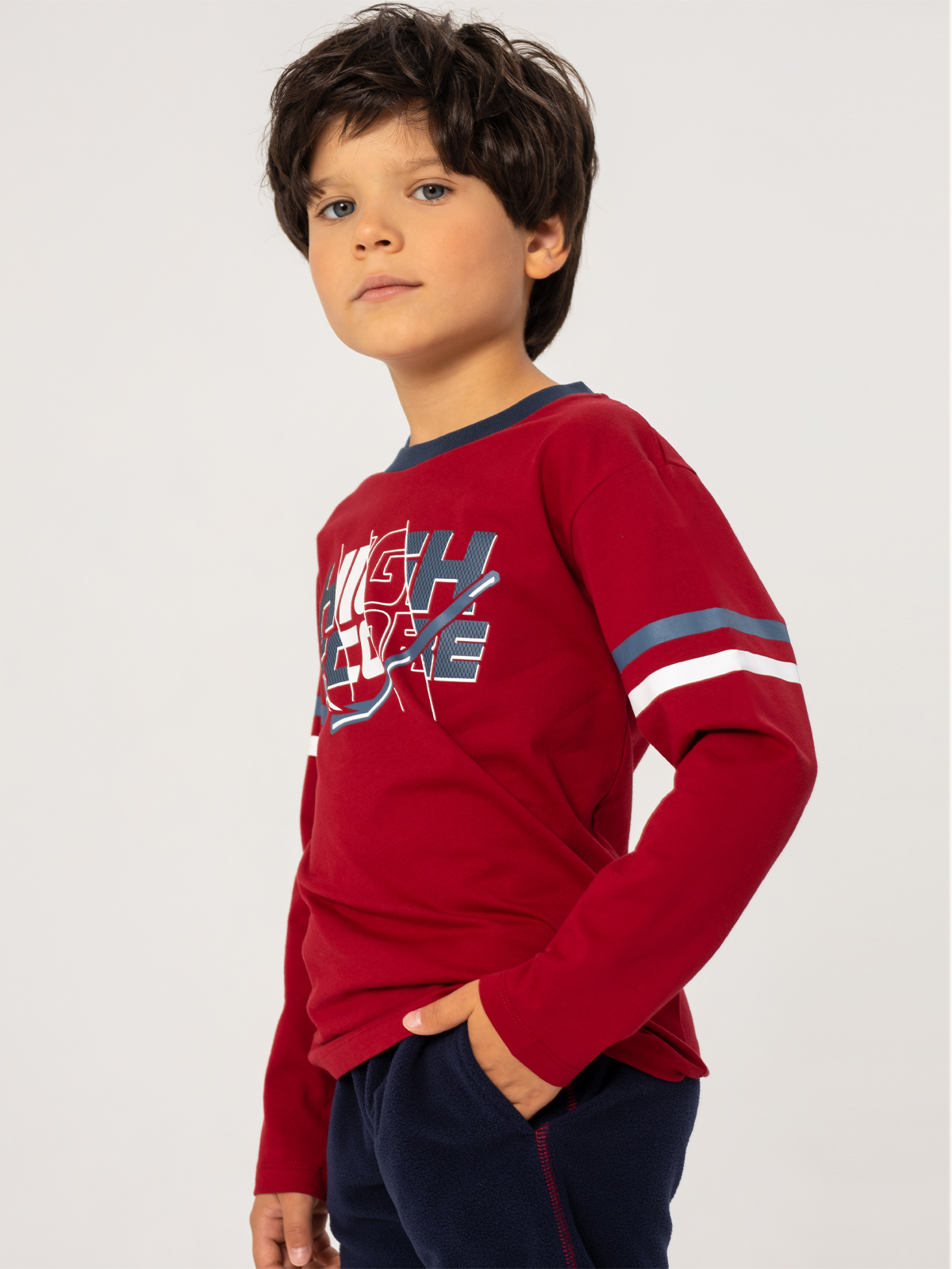 Лонгслив для мальчика насыщенного красного цвета создан из 100% натурального хлопка, который обеспечивает комфорт и гипоаллергенность. Модель привлекает оригинальным дизайном: на груди расположен стильный принт, дополненный полосками на рукавах, которые придают изделию игривый вид. Лонгслив идеально подходит для активных детей благодаря дышащим свойствам материала. Он комфортен как для повседневной носки, так и для занятий спортом. Оригинальный дизайн и высокое качество исполнения делают эту модель любимой вещью в гардеробе любого мальчика, ценящего стиль и удобство в одежде.