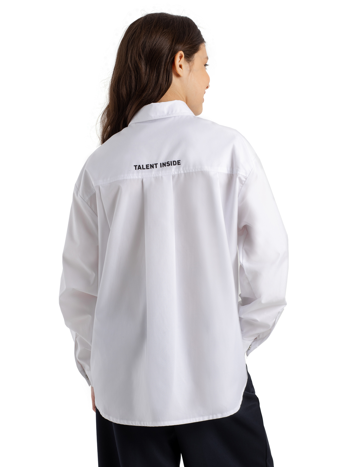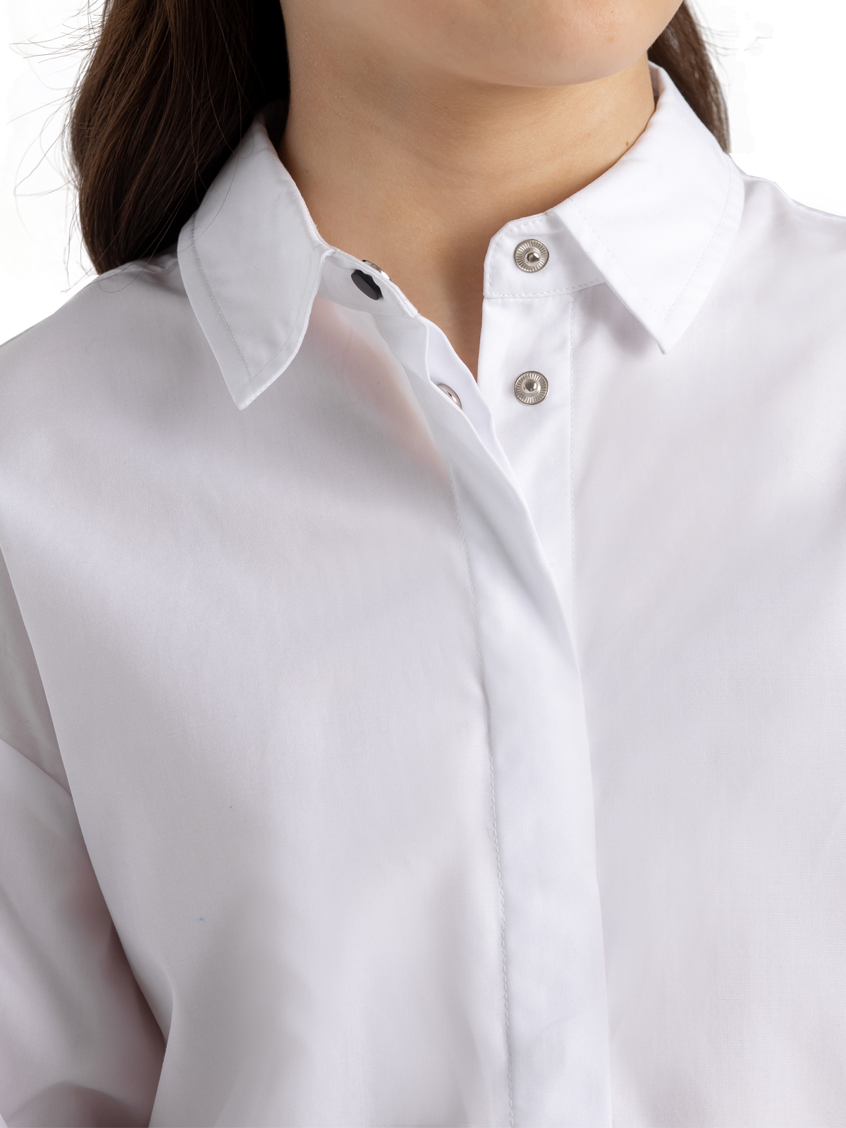 Школьная рубашка ассимитричного оверсайз силуэта с удлиненной спинкой для девочки в классическом белом цвете из высококачественного поликоттона. Рубашка застегивается на кнопки и дополнена контрастным шрифтовым принтом и декоративными складками на спине. Модель рубашки для школы хорошо сочетается с юбками, брюками или джинсами. Комфортная дышащая ткань легка в уходе, не скатывается, держит форму. Рубашка отлично подойдет как для школьных занятий, и торжественных мероприятий так и для ежедневной носки.