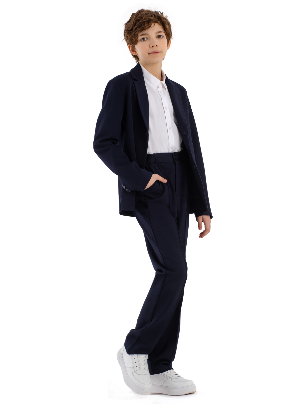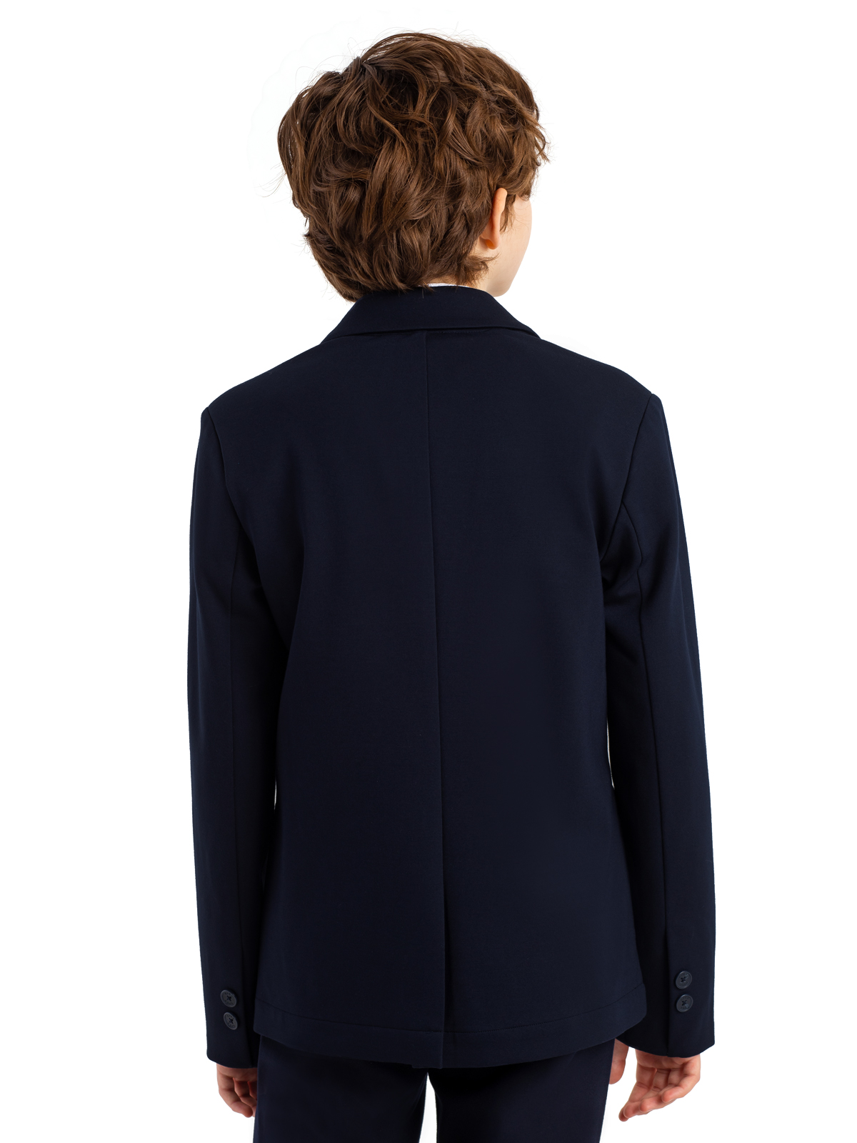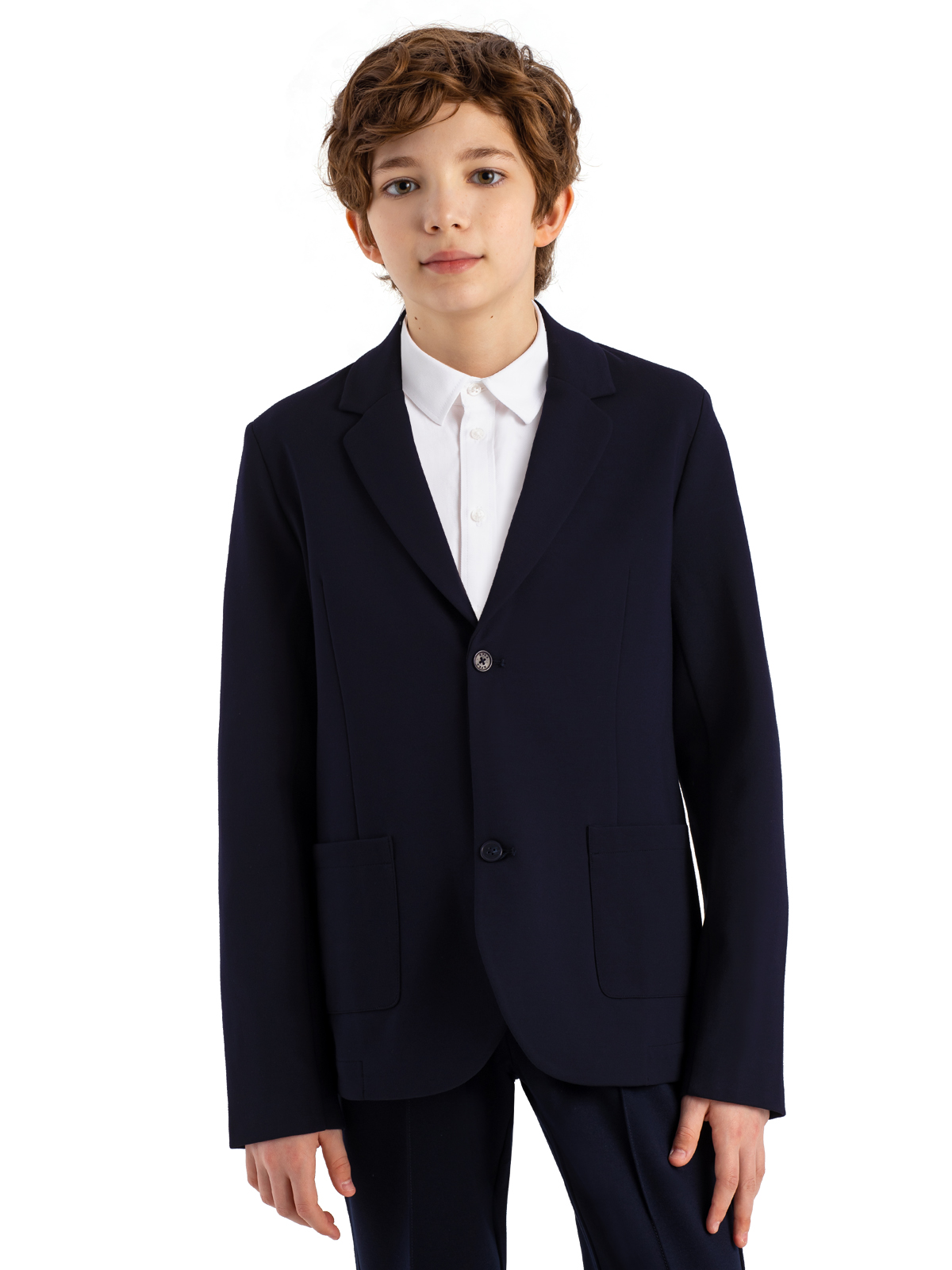 Трикотажный однобортный пиджак прямого кроя для мальчика подростка – непременный атрибут школьной формы. Выполненный из поливискозы темно-синий пиджак позволит свободно двигаться и выглядеть стильно. Тщательно выверенная конструкция, свободный крой и тянущаяся ткань, позволяют ребенку комфортно находиться в школе длительное время и не чувствовать себя скованно. Накладные карманы добавляют функциональности.