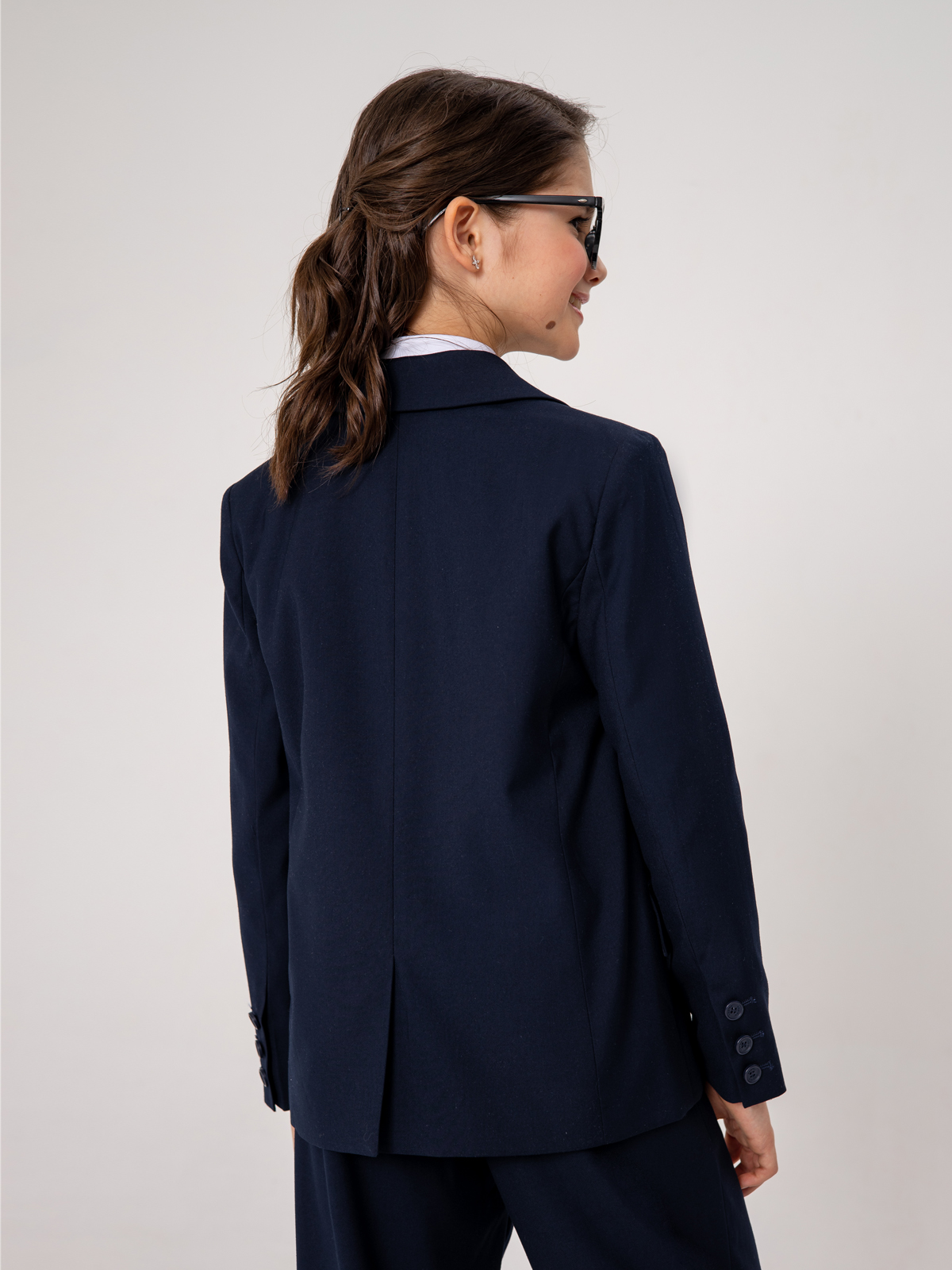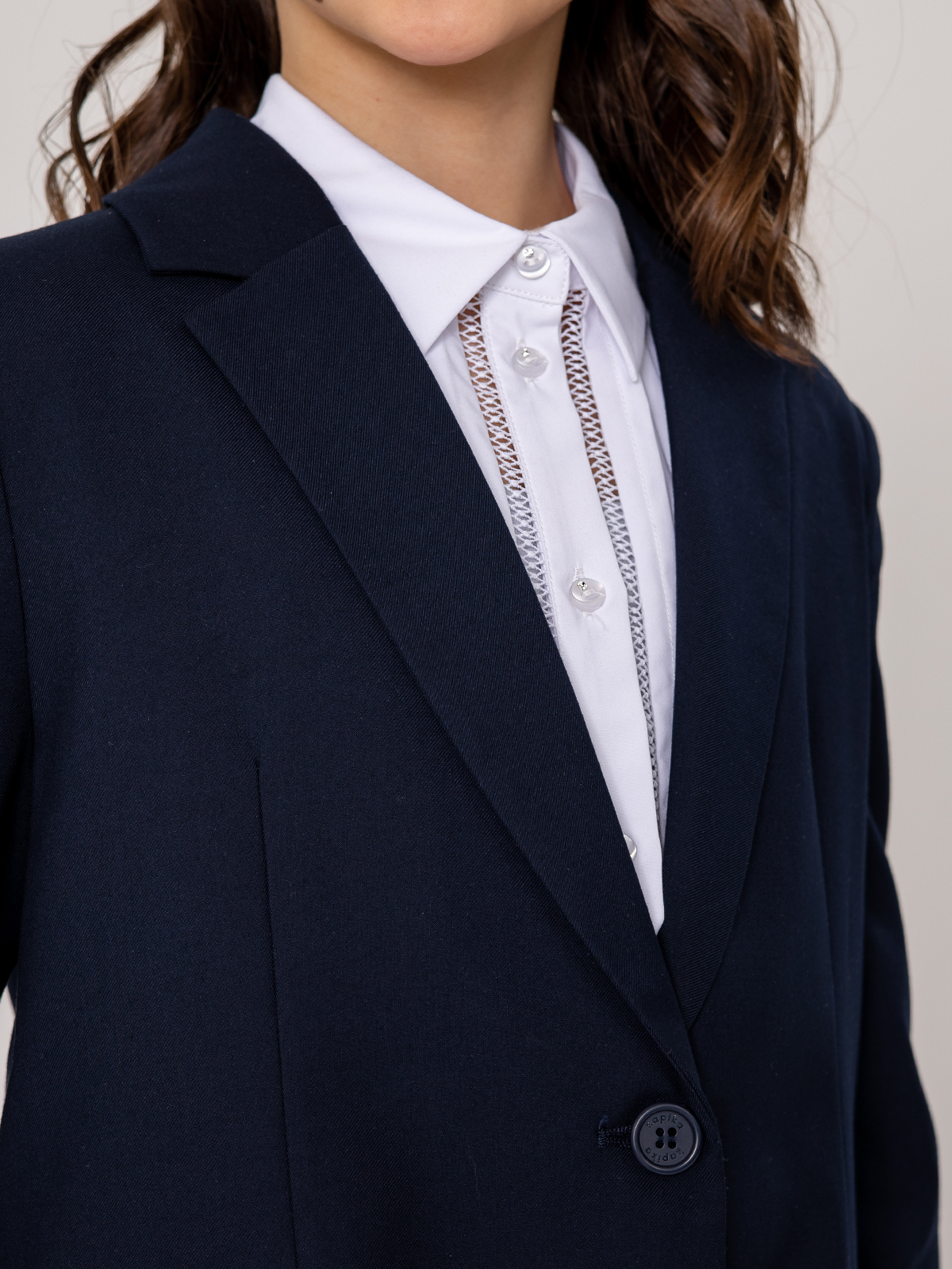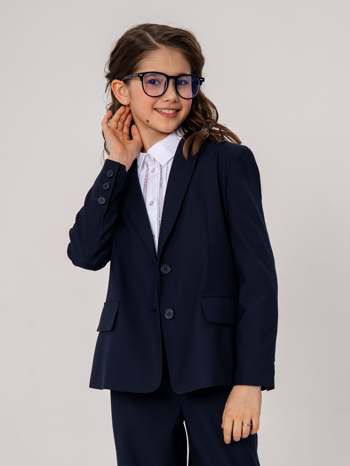 Удлиненный пиджак для школы свободного кроя выполнен из гладкой костюмной ткани. Материал формоустойчив, приятен тактильно, не скатывается, прост в уходе и эксплуатации. Пиджак имеет мягкую шелковистую подкладку из поливискозы, создающую комфортное скольжение при взаимодействии с изделиями первого слоя.