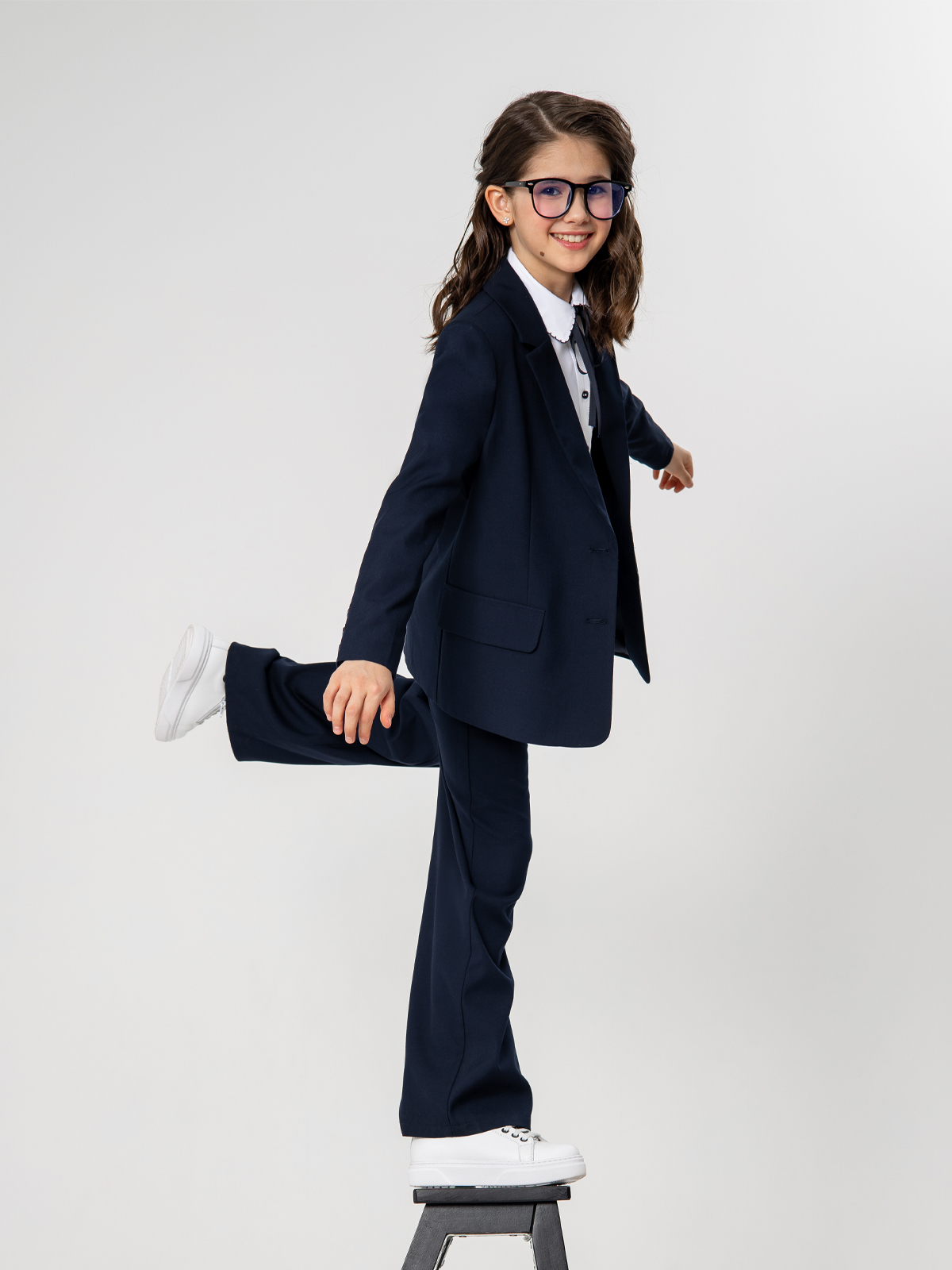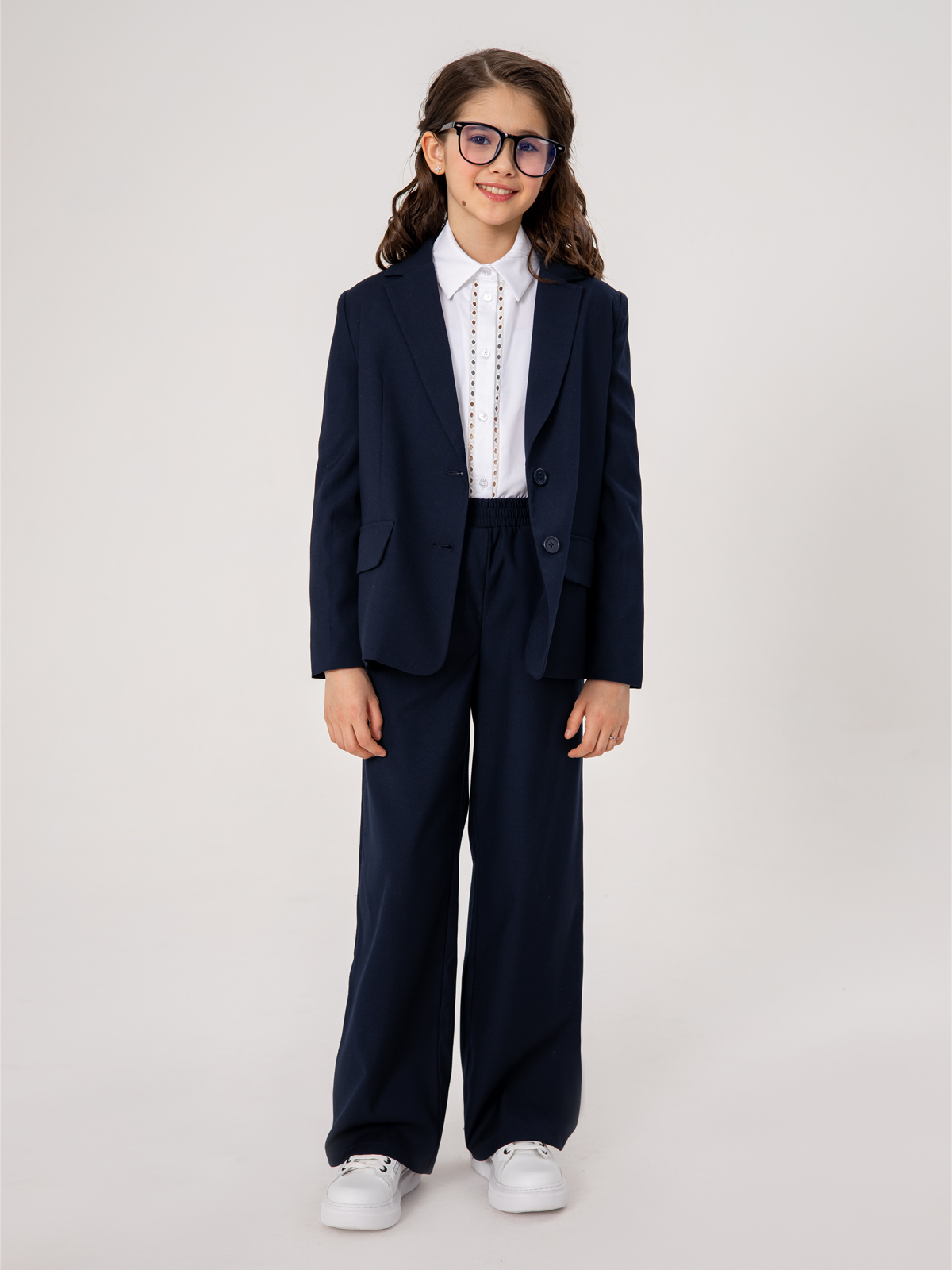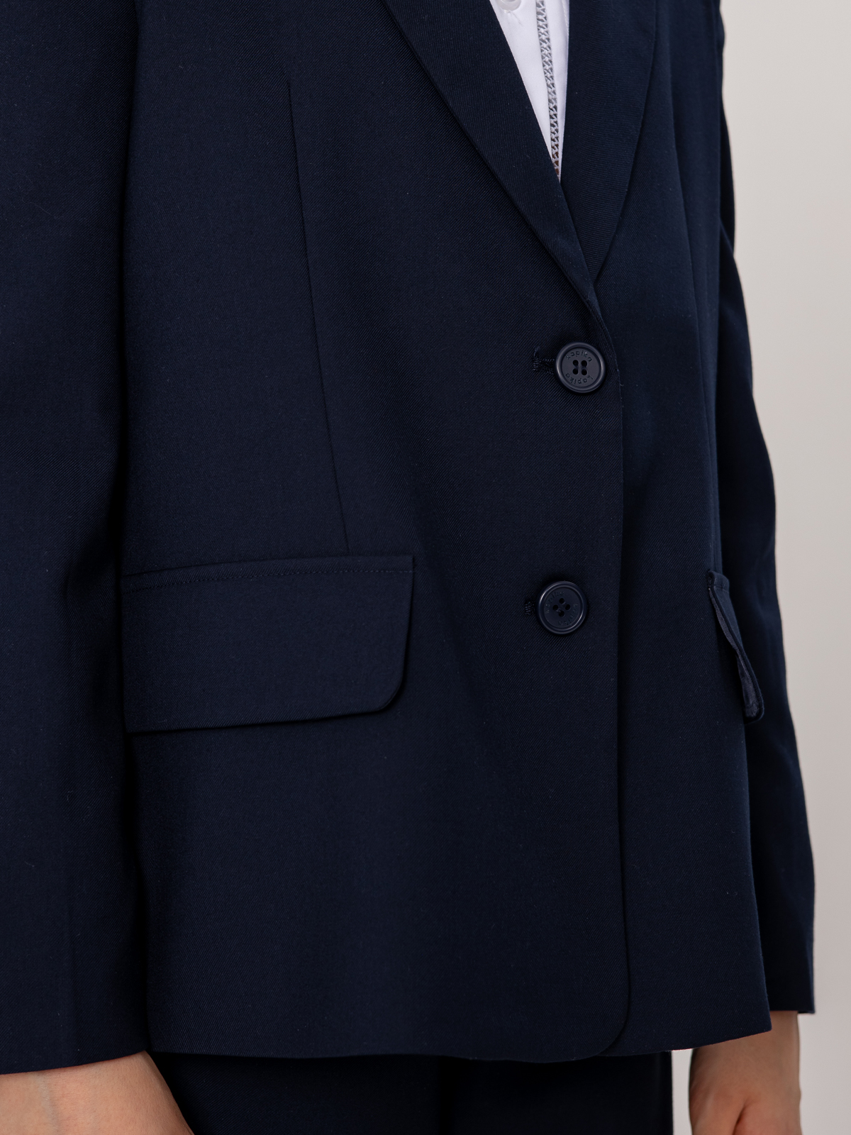 Удлиненный пиджак для школы свободного кроя выполнен из гладкой костюмной ткани. Материал формоустойчив, приятен тактильно, не скатывается, прост в уходе и эксплуатации. Пиджак имеет мягкую шелковистую подкладку из поливискозы, создающую комфортное скольжение при взаимодействии с изделиями первого слоя.