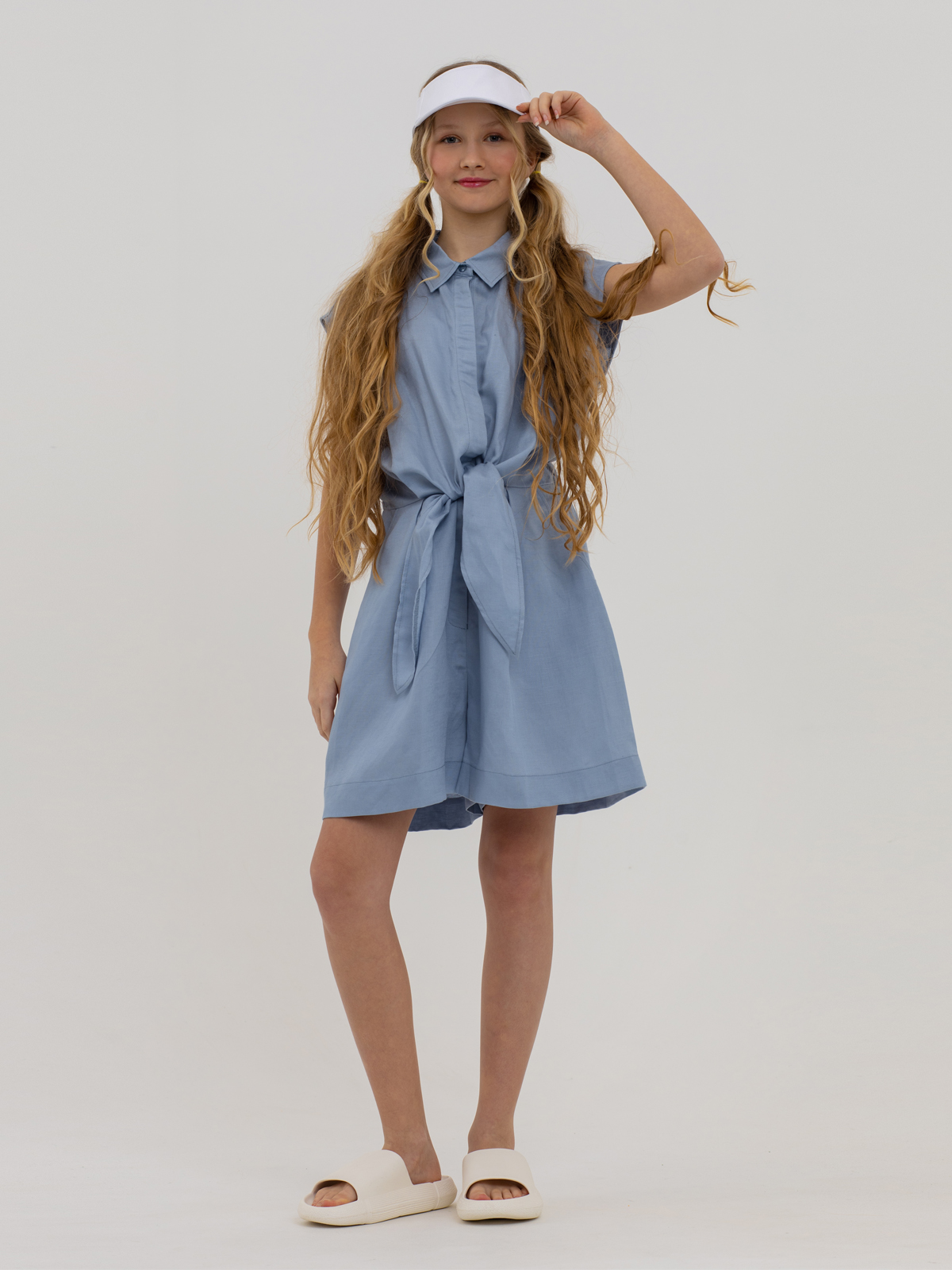Короткий комбинезон для девочек — практичный и стильный повседневный фаворит, сочетающий нежный дизайн с удобством. Свободный прямой крой гарантирует свободу движений. Отложной воротник добавляет изысканности и аккуратно обрамляет шею, фронтальная скрытая застежка под планкой облегчает надевание. Декоративный узел на талии добавляет стильный акцент. Боковые карманы с отрезным бочком для хранения гаджетов и полезных мелочей.