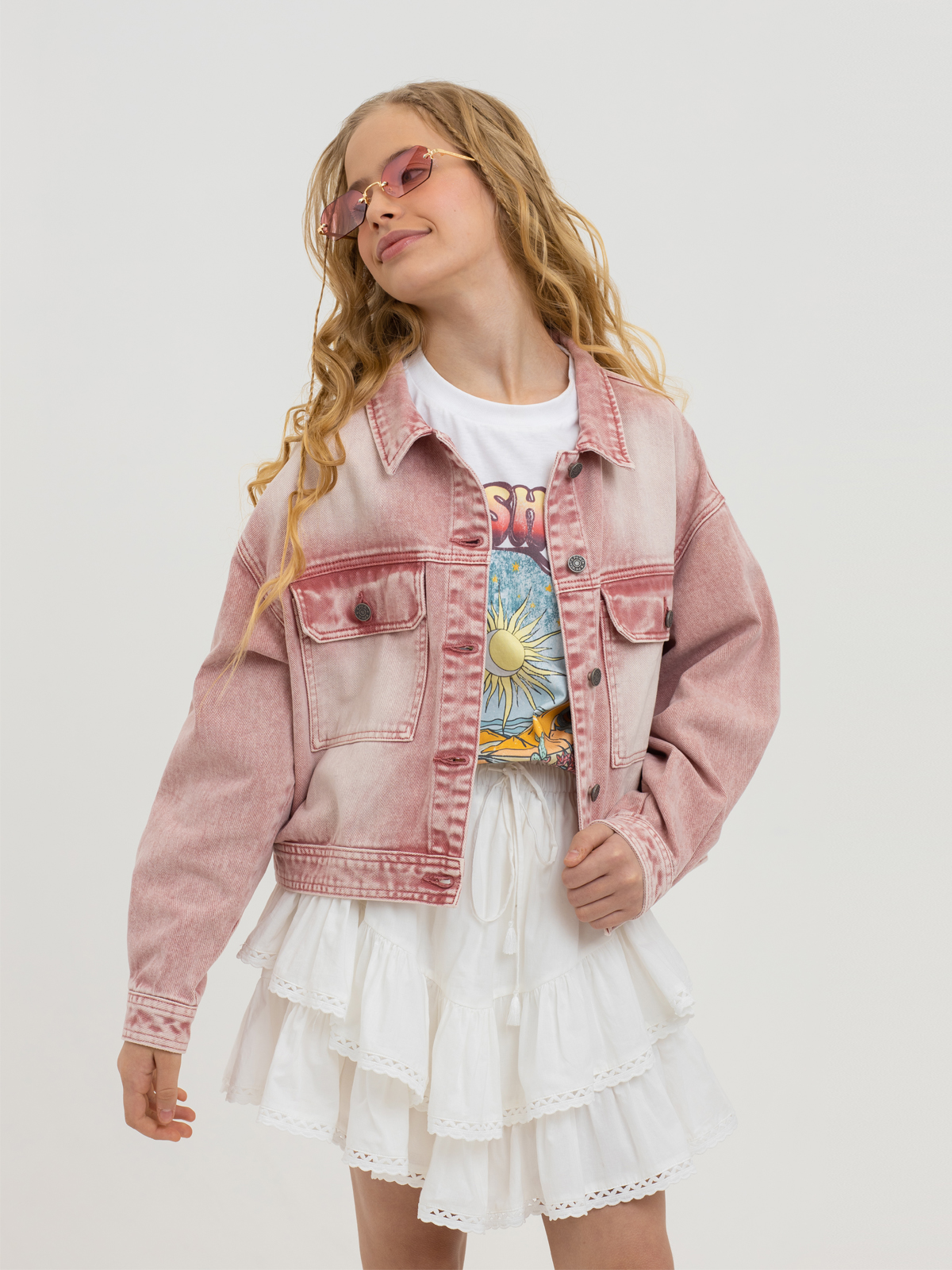 Джинсовая куртка с эффектом винтажной стирки для девочек - стильный предмет гардероба. Свободный прямой крой с заниженной линией плеча не стесняет движений. Отложной воротник, длинный рукав, манжеты на кнопках и хлястики для регулировки объем по низу изделия удобны в эксплуатации. Два накладных кармана для хранения полезных мелочей.