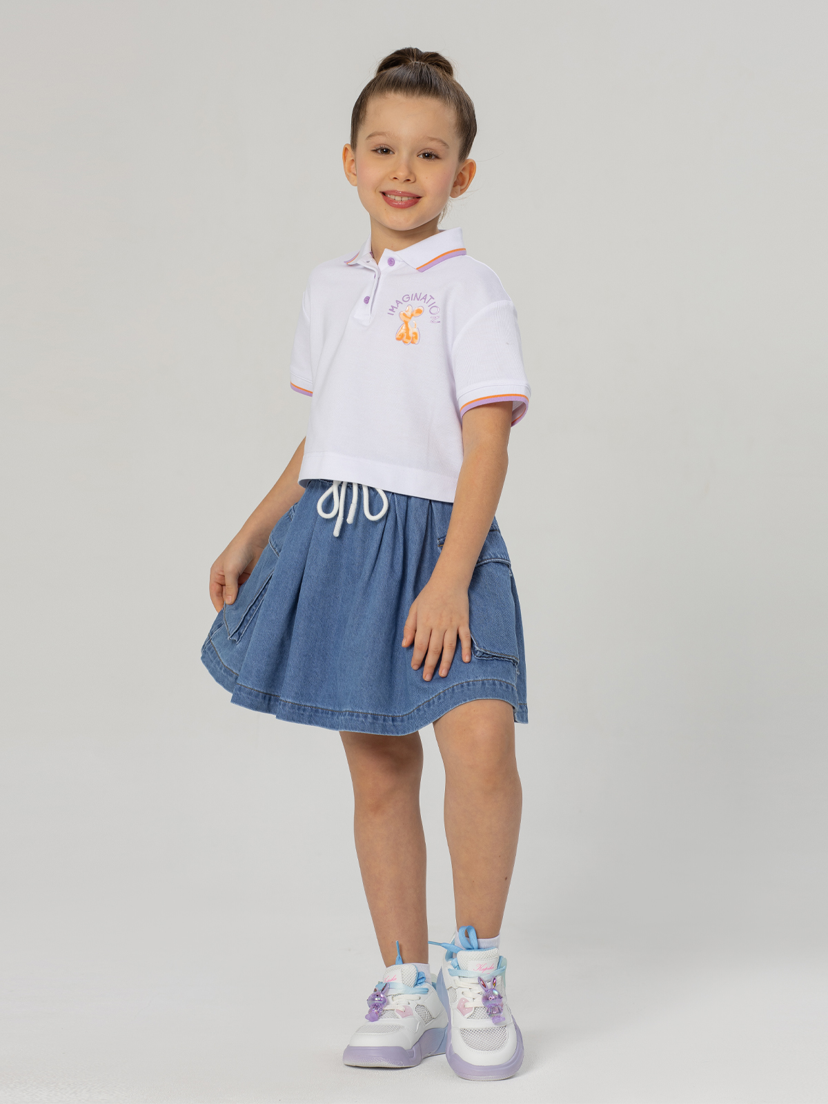 Джинсовая юбка с карманами для девочек сочетает стильный повседневный вид и комфорт. Изделие выполнено из мягкого хлопкового денима — дышащего и приятного к телу материала, который не вызывает раздражений. Комфортная средняя посадка гарантирует естественное прилегание, позволяя свободно двигаться. Накладные карманы с клапанами на бедрах удобны для мелочей, а эластичный регулируемый пояс легко подстраивается под фигуру, обеспечивая надёжную фиксацию без давления.
