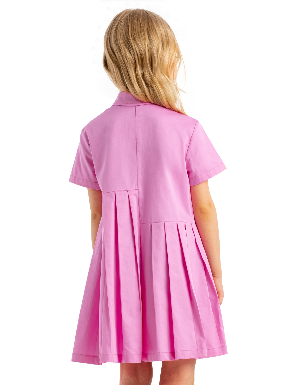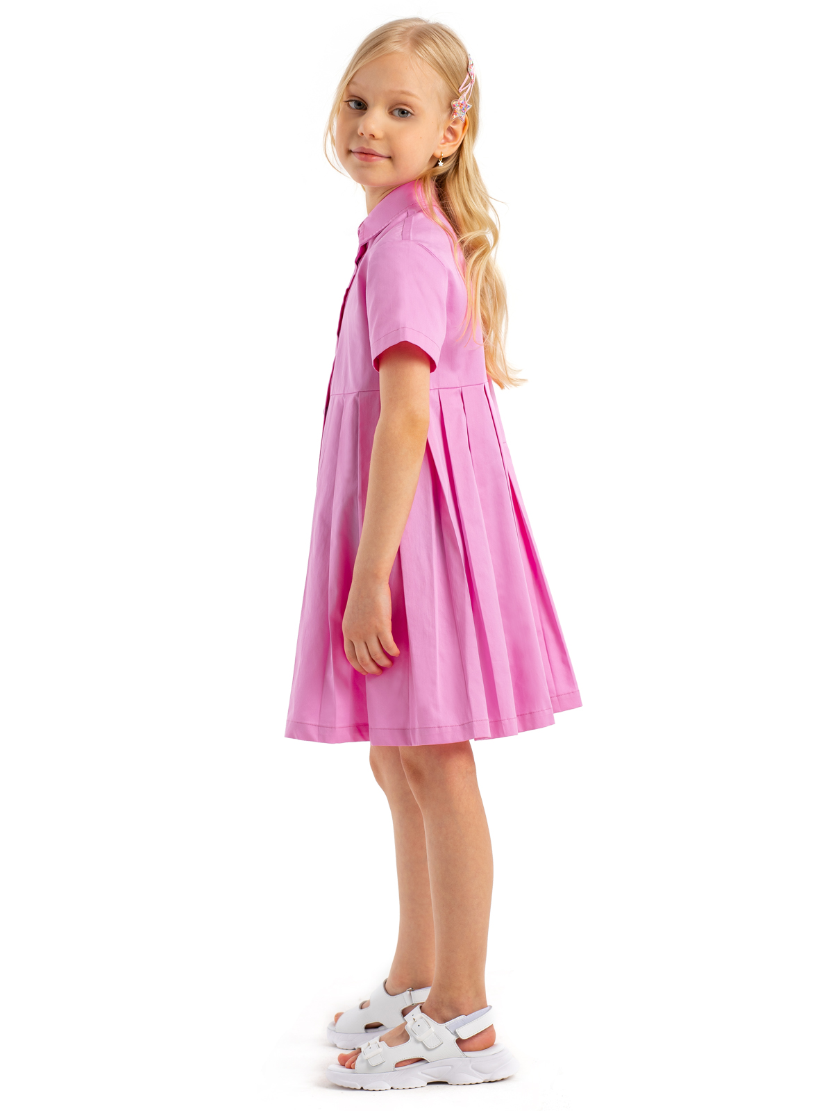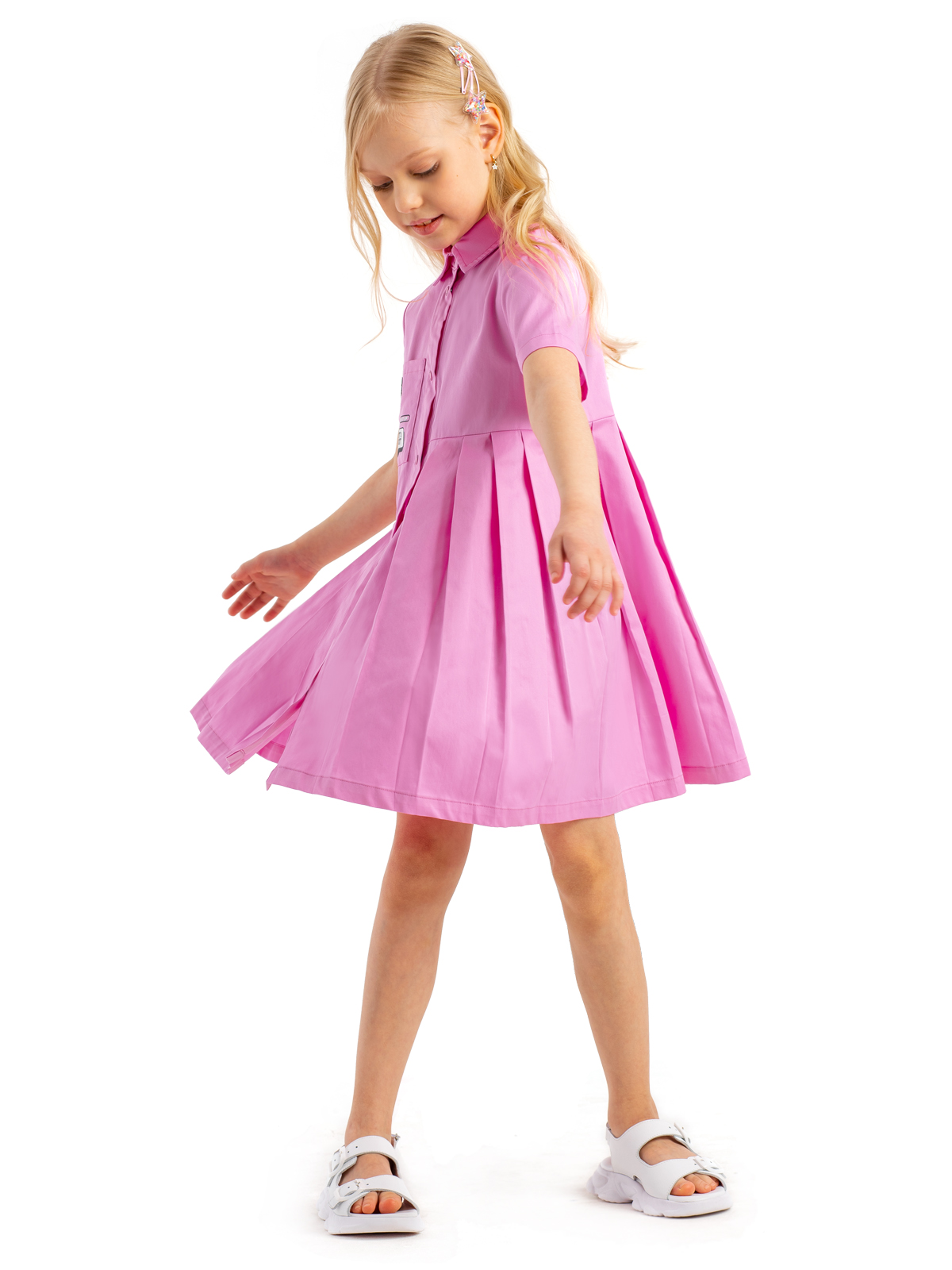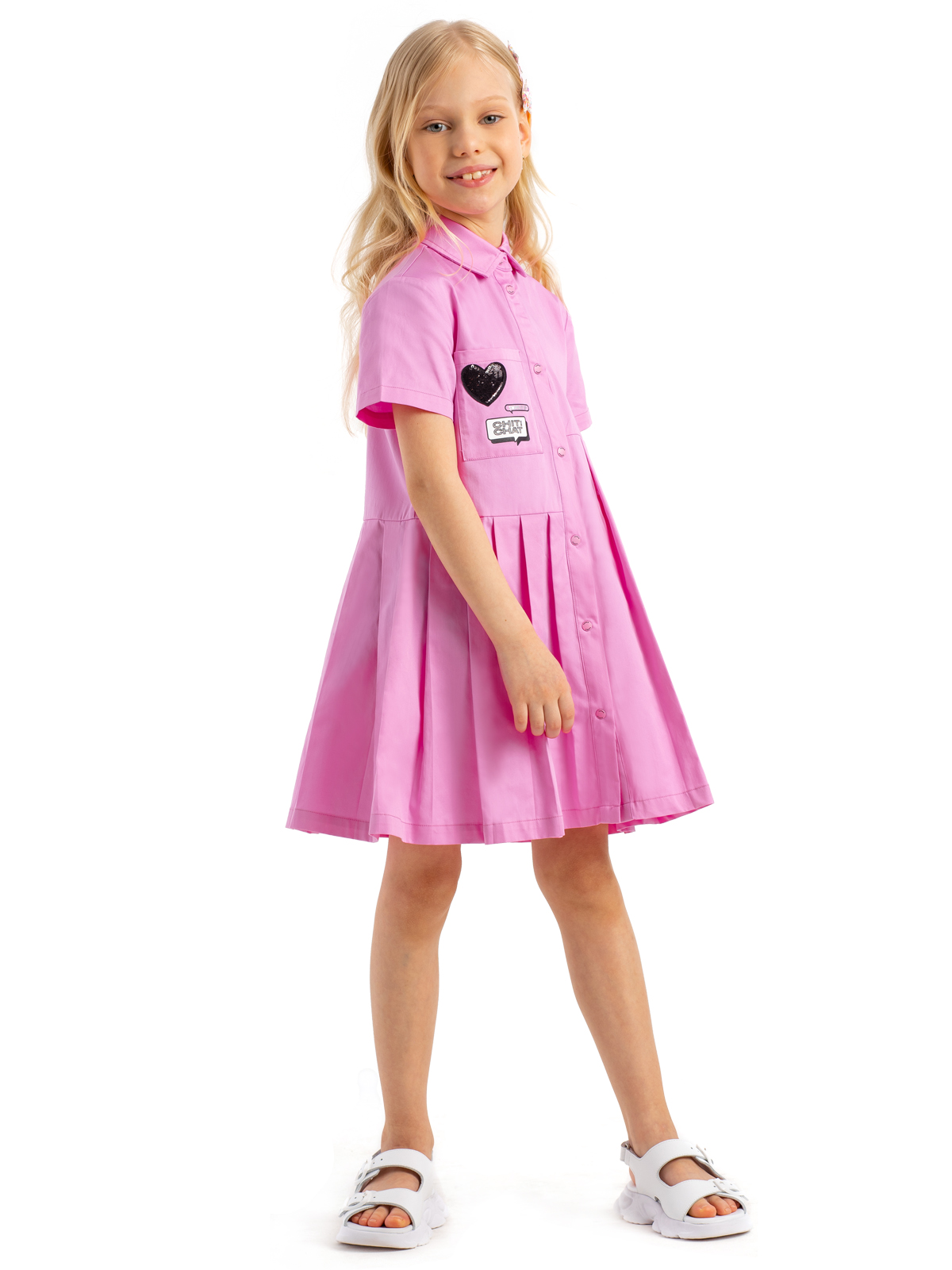 Платье-рубашка создано специально для девочек и выполнено в ярком неоновом розовом цвете. Центральная планка с кнопками позволяет легко надевать платья, а ассиметричные складки на юбке не будут сковывать движения. На груди располагается карман с оригинальным принтом и патчем изпайеток. Платье отлично подойдет для девочек, которые ценят комфорт и хотят выглядеть стильно и модно.