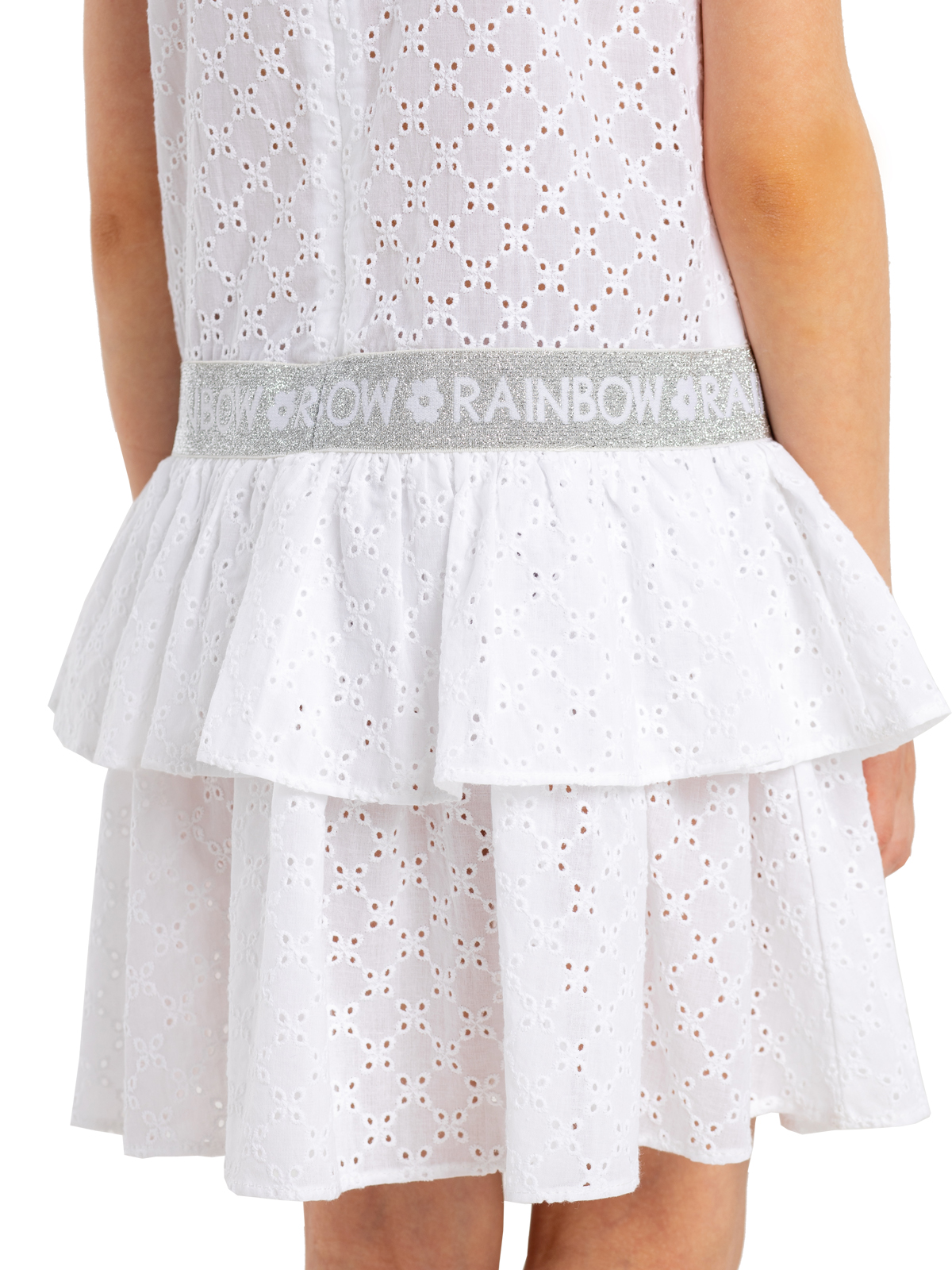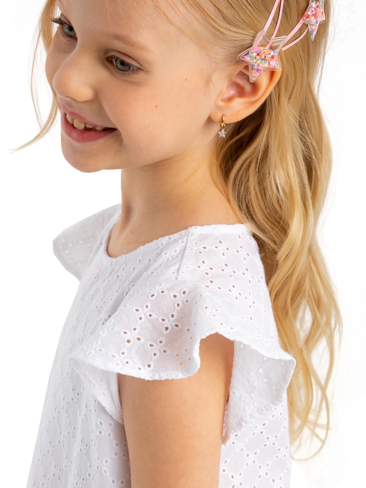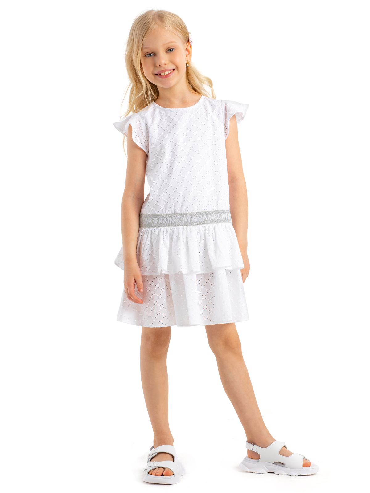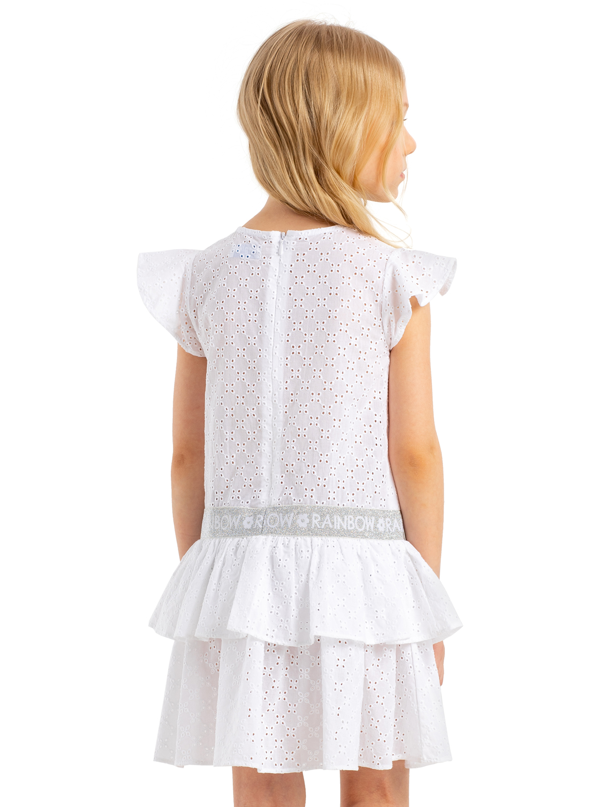 Белое платье для девочки изготовлено из хлопкового шитья и украшено прорезным узором. Серебристая люрексная резинка на талии обеспечивает идеальную посадку, а скрытая молния сзади облегчает процесс надевания. Хлопковая подкладка на передней части платья обеспечивает дополнительный комфорт, а рукава-крылышки добавляют образу воздушности.