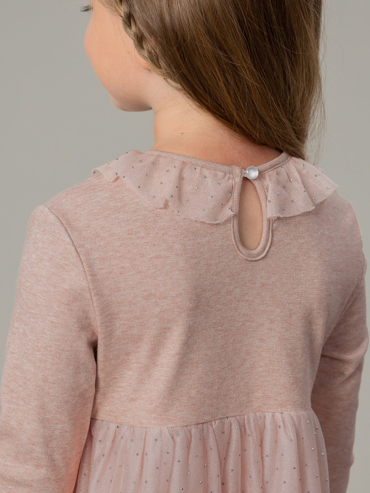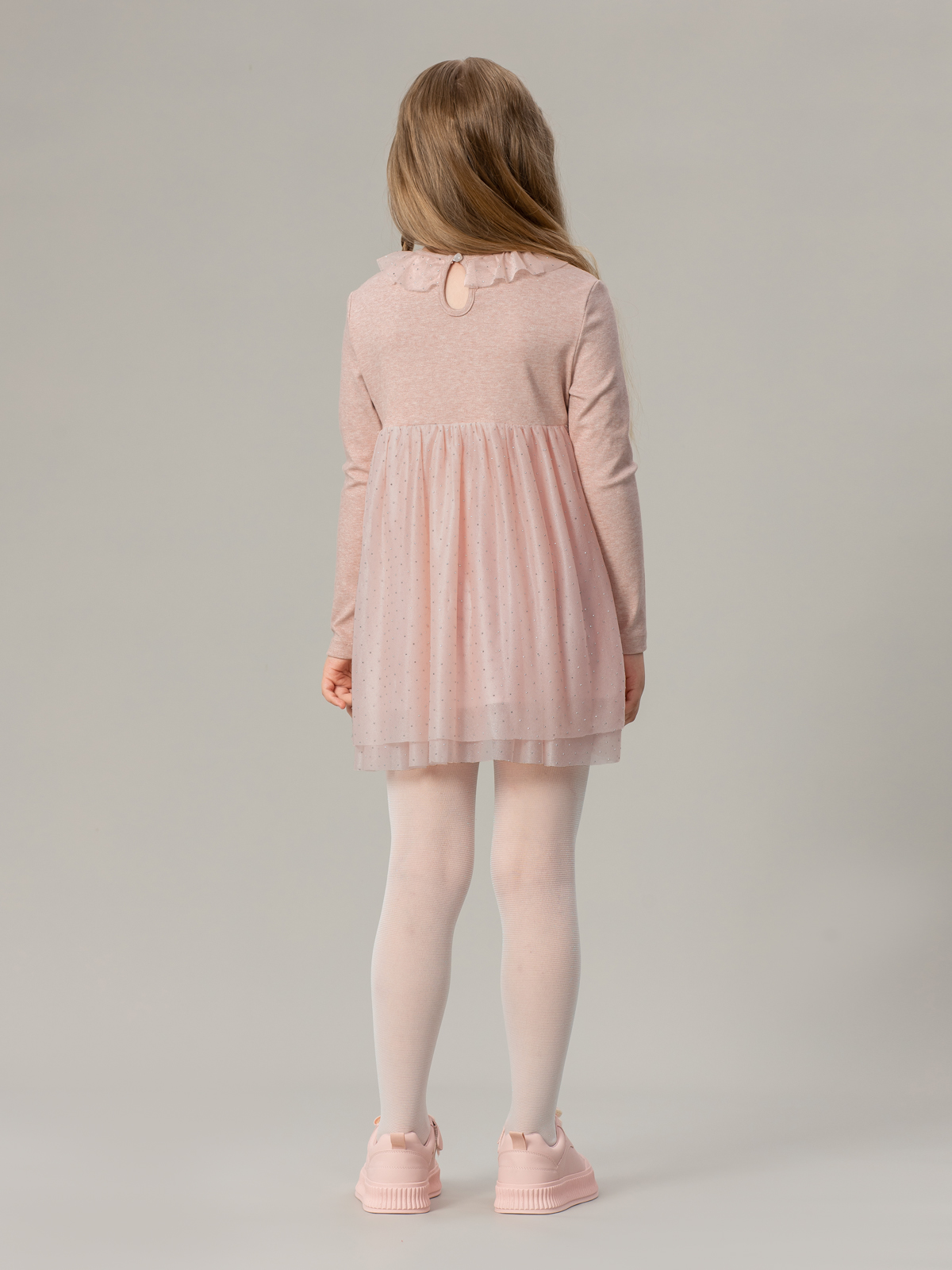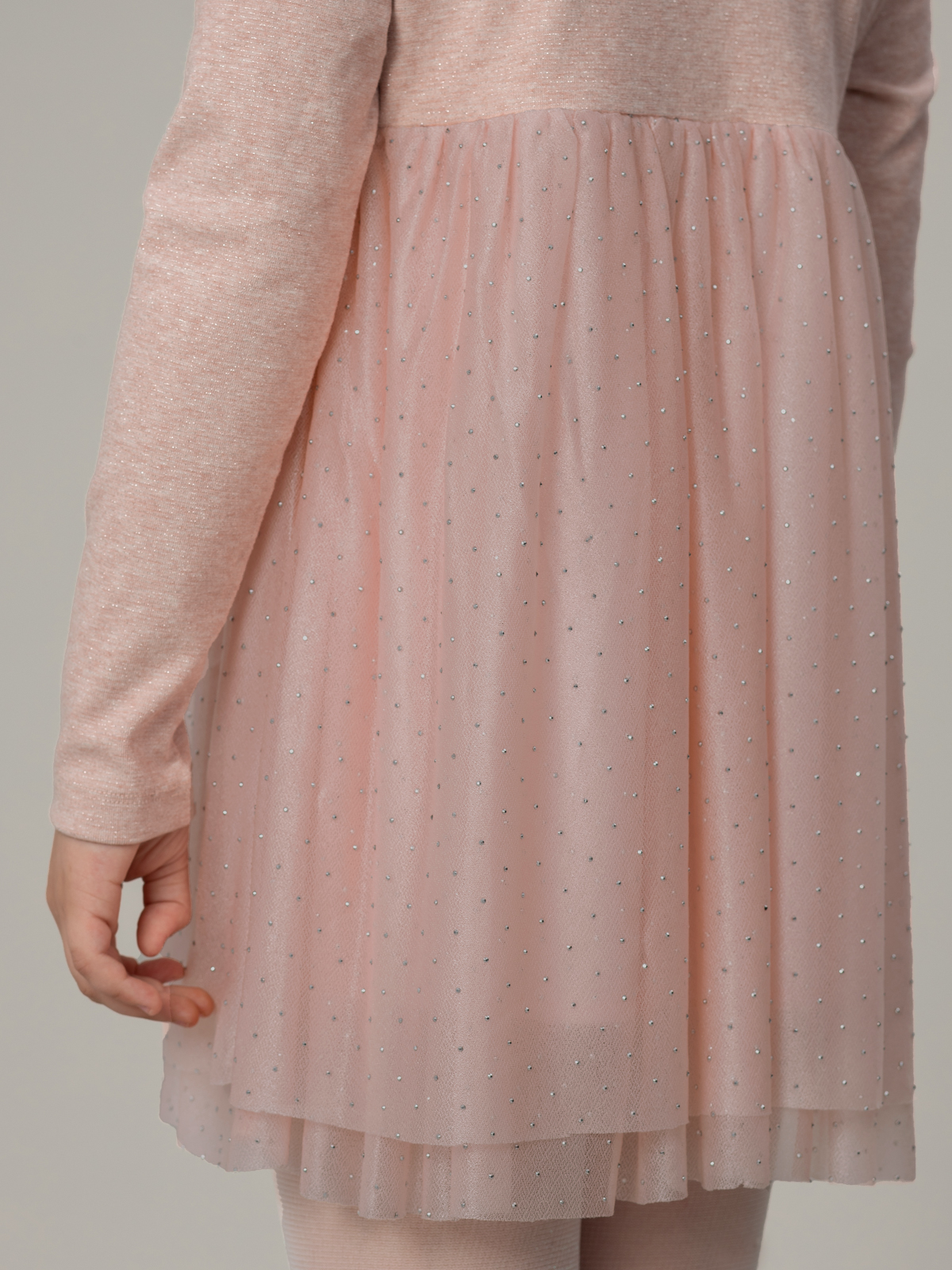 Изящное розовое платье для девочек, создающее атмосферу легкости и воздушности. Главная особенность модели — элегантная верхняя юбка из воздушной сетки, которая придаёт образу особую невесомость и романтичность. Основная ткань платья представляет собой изысканное сочетание вискозы, полиэстера и люрекса. Вискоза дарит мягкость и приятные тактильные ощущения, полиэстер гарантирует прочность, а люрекс добавляет деликатный блеск. Юбка платья украшена стразами, которые создают мерцающий эффект и добавляют образу торжественность. Свободный силуэт платья обеспечивает комфорт и свободу движений, делая платье универсальным и подходящим как для повседневной носки, так и для особых случаев.