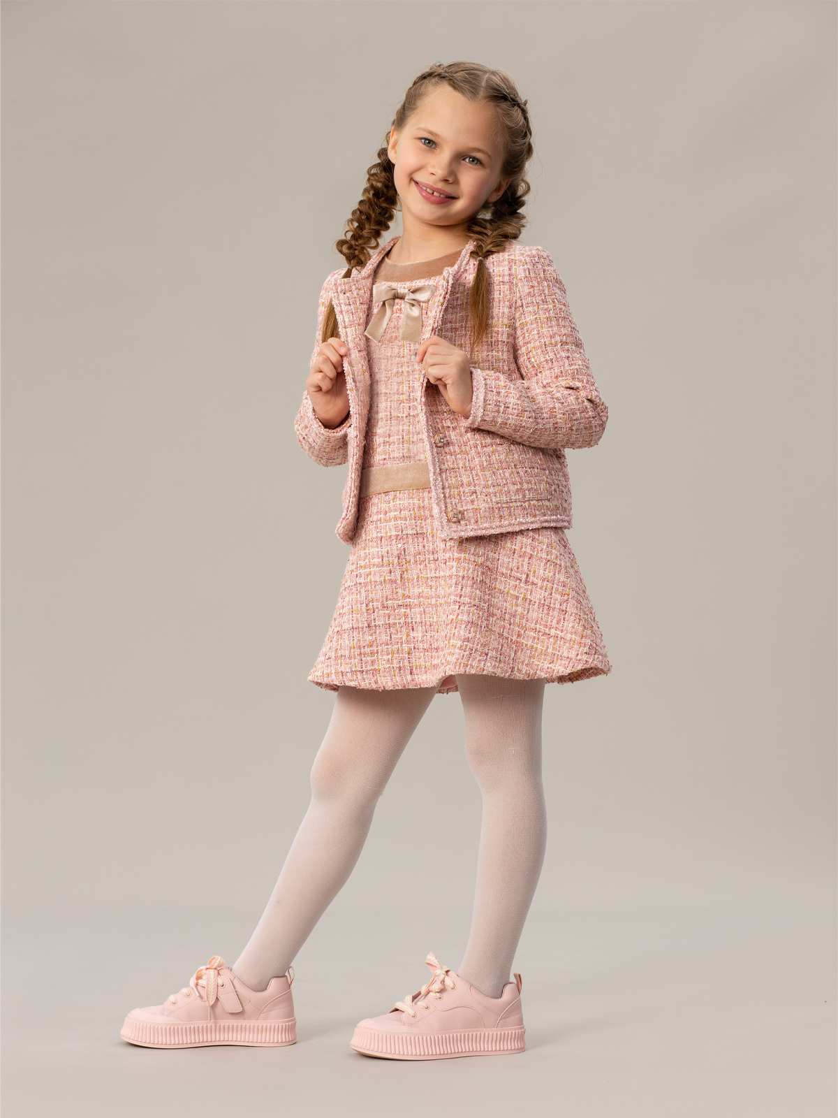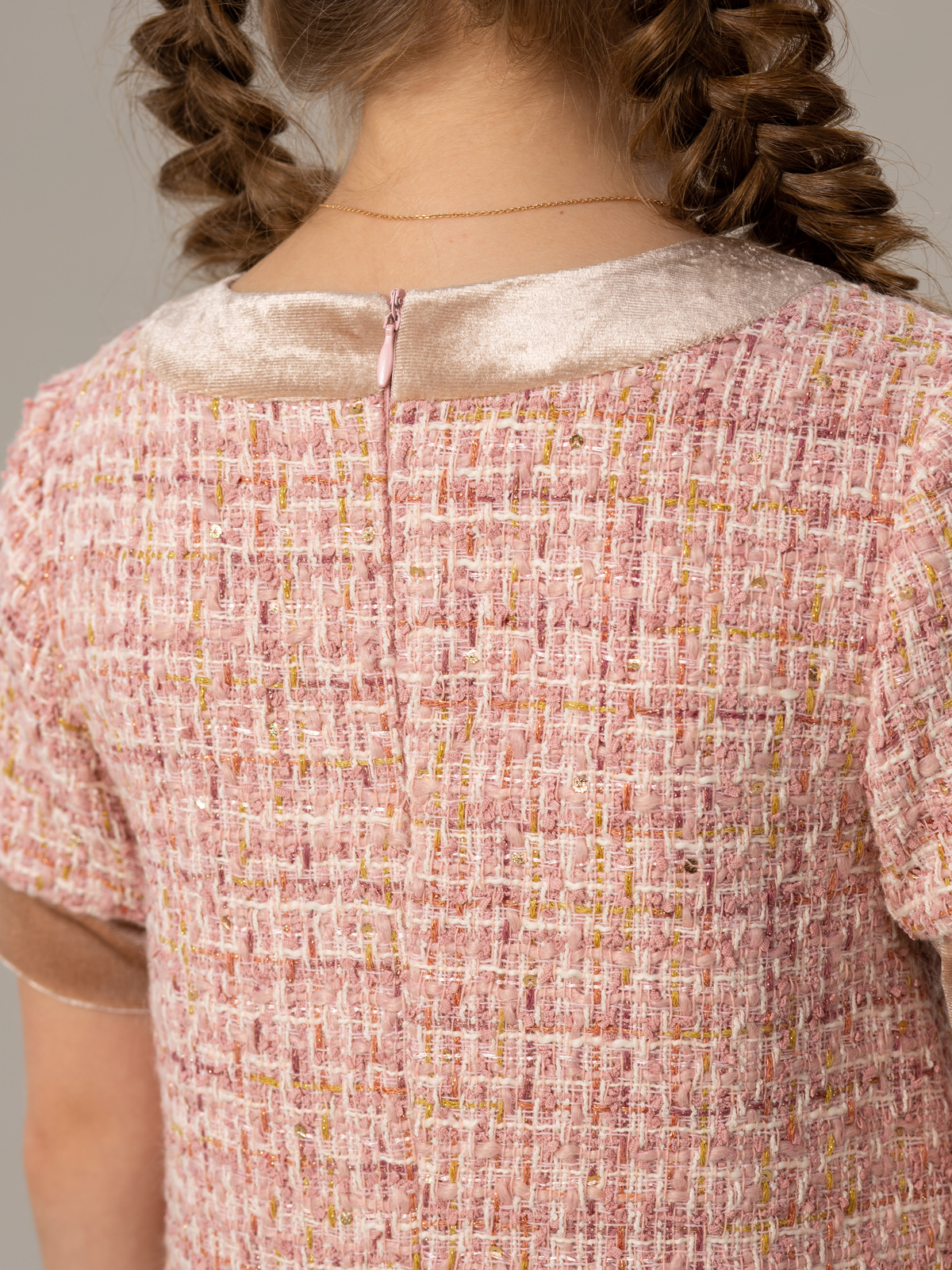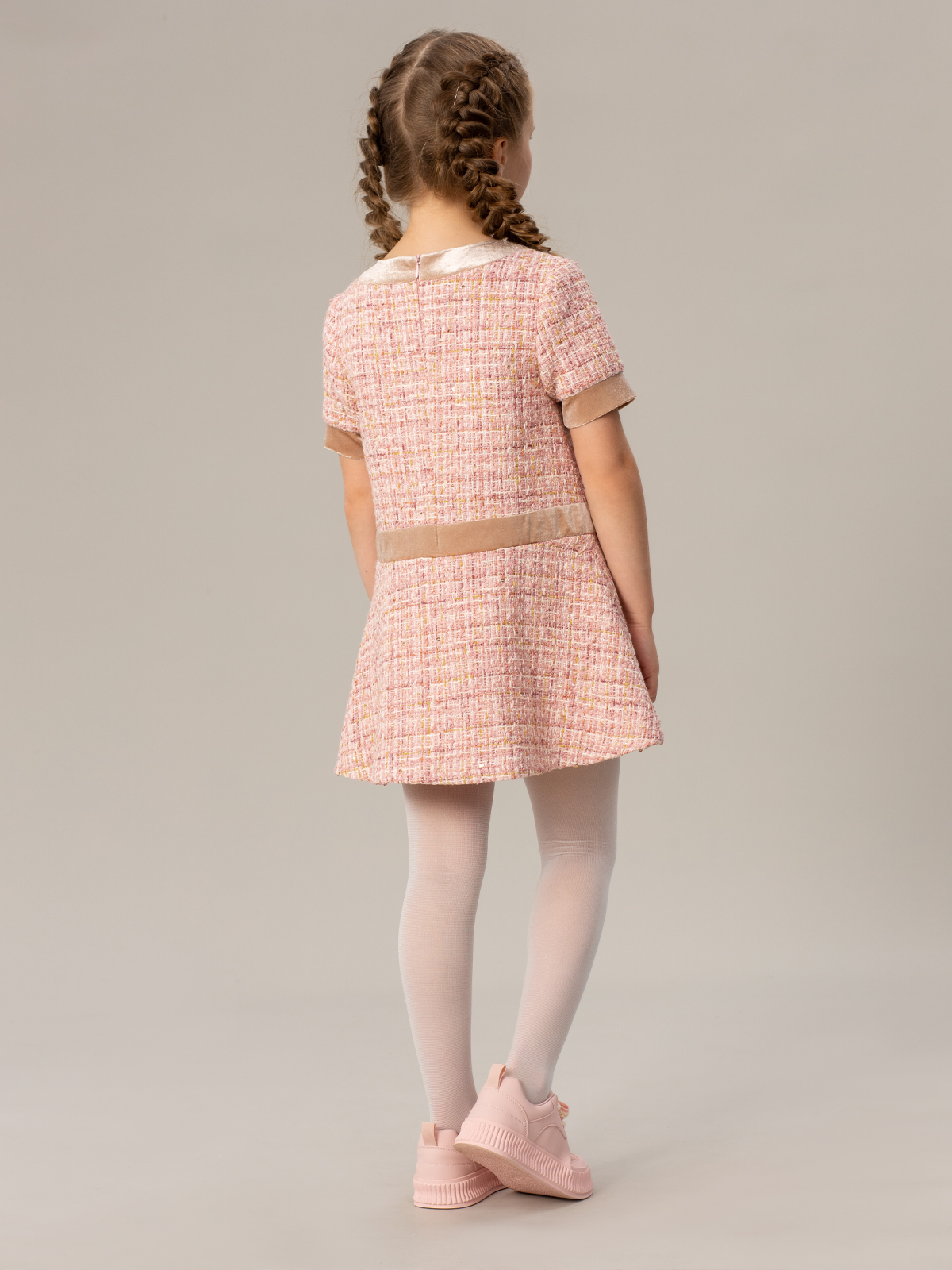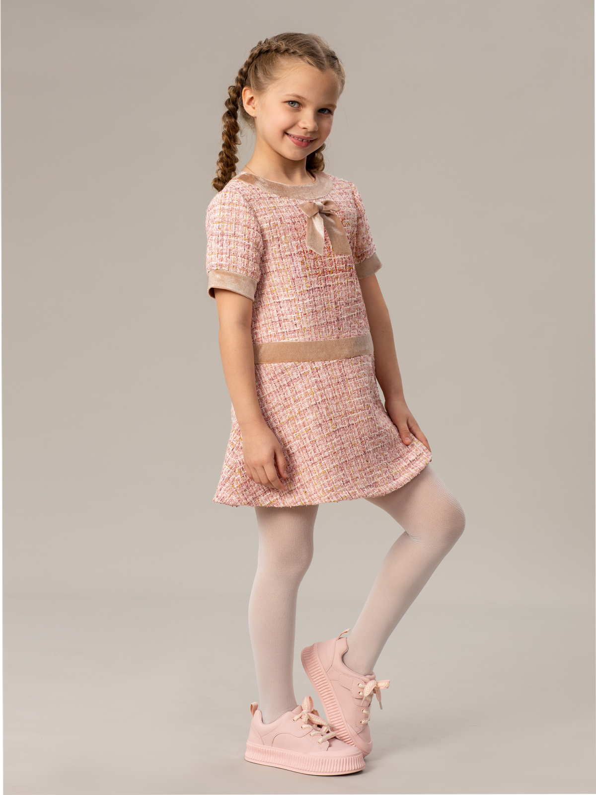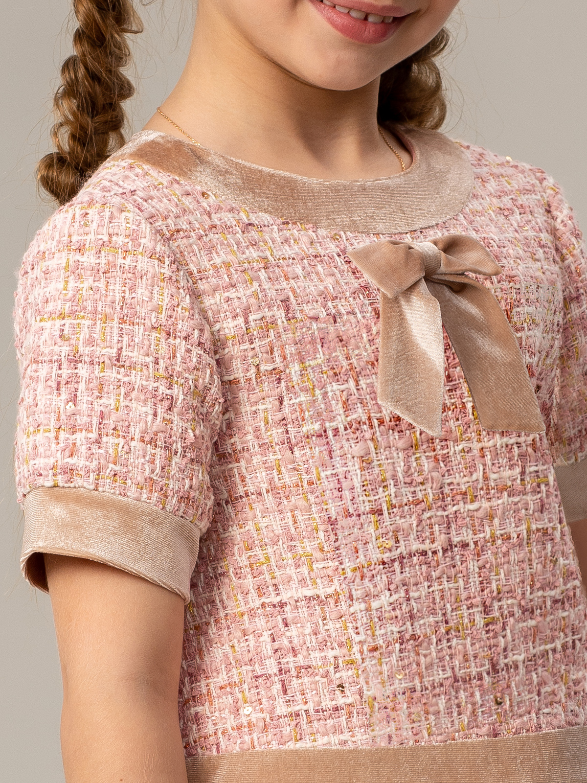 Изящное розовое платье из твида — идеальный выбор для модной девочки, сочетающее в себе классику и утончённый стиль. Модель выполнена из высококачественного материала с содержанием шерсти, который дарит комфорт и приятные тактильные ощущения.Особый шарм платью придают декоративные элементы из бархата: элегантная отделка по талии и краям изделия и очаровательный бант из бархатной тесьмы на груди. Этот акцент добавляет романтичности и делает образ подходящим как для праздничных мероприятий, так и для повседневной носки.Платье прекрасно сочетается с жакетом из той же ткани, создавая гармоничный ансамбль. Модель имеет классический крой, который подчёркивает достоинства детской фигуры.