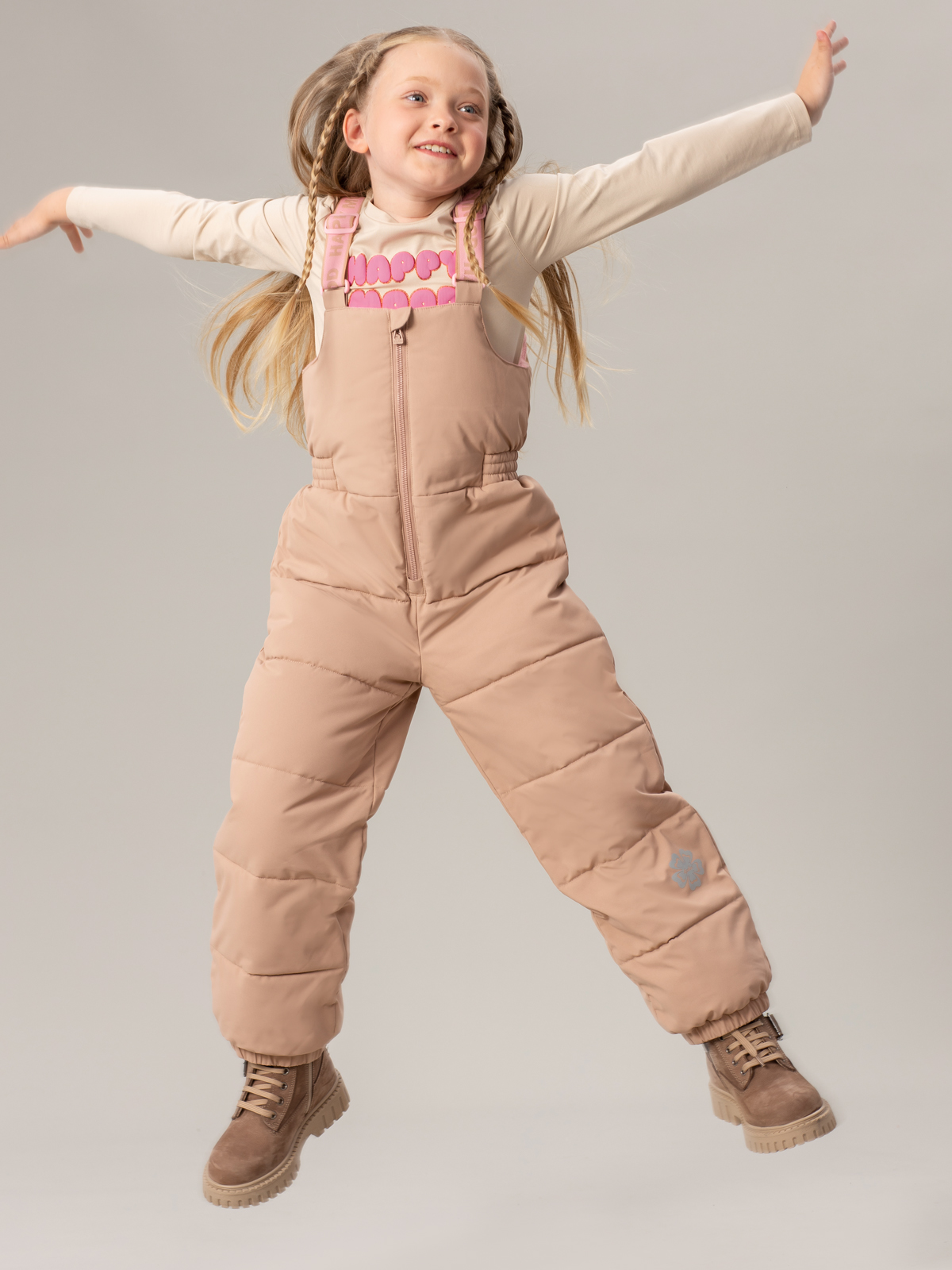 Утеплённый бежевый полукомбинезон для девочки — идеальное решение для зимних прогулок. Выполнен из мембранной ткани 5000/5000, которая надёжно защищает от ветра и осадков. В качестве утеплителя используется искусственный пух плотностью 200 г/м² в сочетании с синтепоном 100 г/м², что обеспечивает отличную теплоизоляцию.Для максимального комфорта внутренняя подкладка изготовлена из мягкого микрофлиса. Регулируемые эластичные лямки обеспечивают удобную посадку, а резинки по низу брючин эффективно защищают от попадания снега.Практичная застёжка на молнию позволяет быстро надевать и снимать изделие. Этот полукомбинезон станет незаменимым элементом гардероба ребенка в холодное время года.
