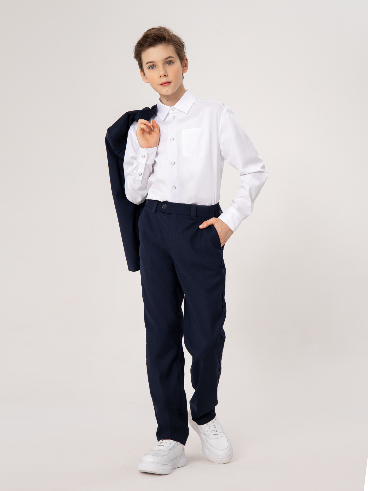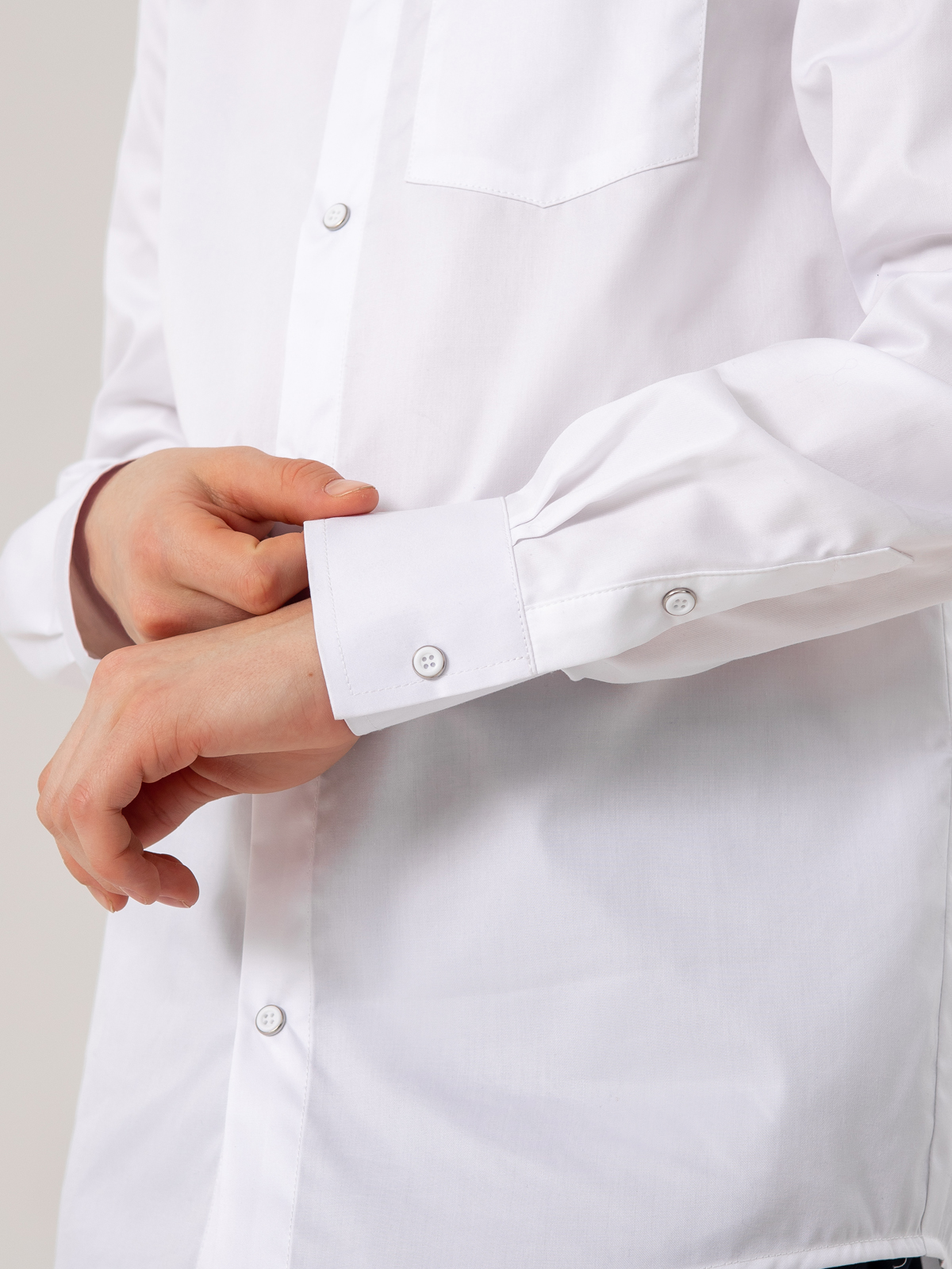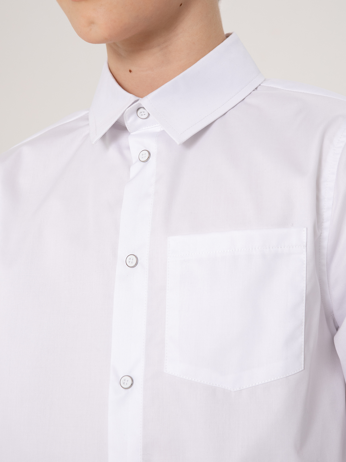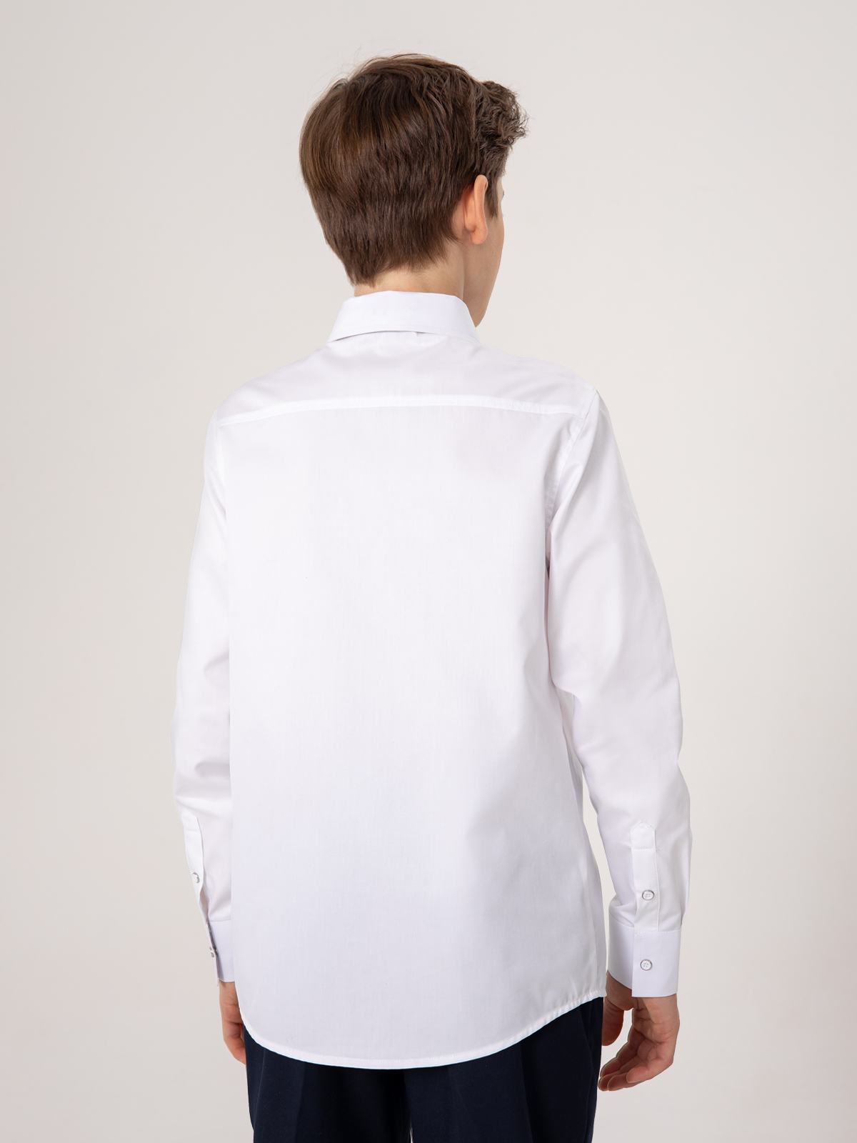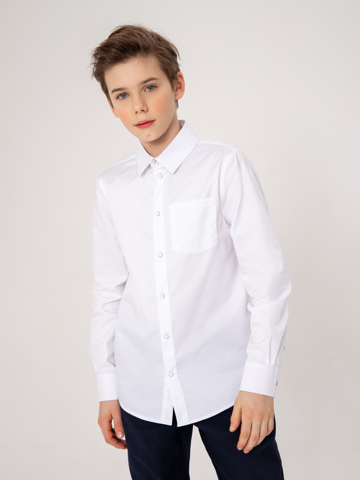 Классическая рубашка с длинным рукавом выполнена из плотного хлопка. Ткань отлично держит форму, позволяет коже дышать, небольшое добавление полиэстра уменьшает сминаемость ткани и облегчает глажку. Удобная застежка на кнопки, имитирующие пуговицы, позволяет быстро застегнуть рубашку.