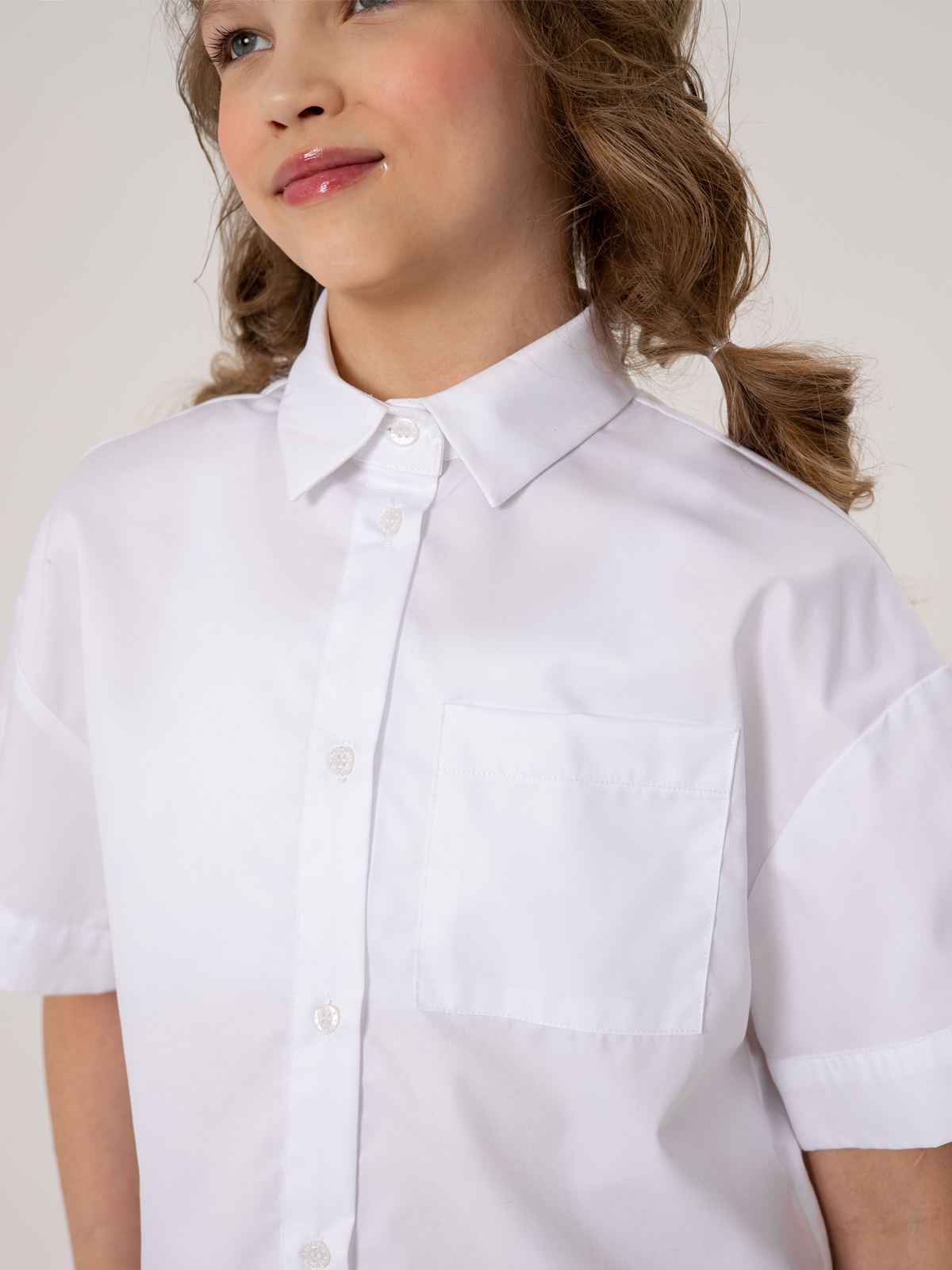 Белая школьная рубашка с коротким рукавом. Укороченная рубашка силуэта умеренный оверсайз с заниженной линией спинки выполнена из легкого хлопкового текстиля, комфортного в эксплуатации и уходе. Форма модели обеспечивает свободу движений, создает современные пропорции в образе. Крупный накладной карман подчеркивает минималистичность дизайна, делая блузку образцом стильной вещи для школы и свободного времени.