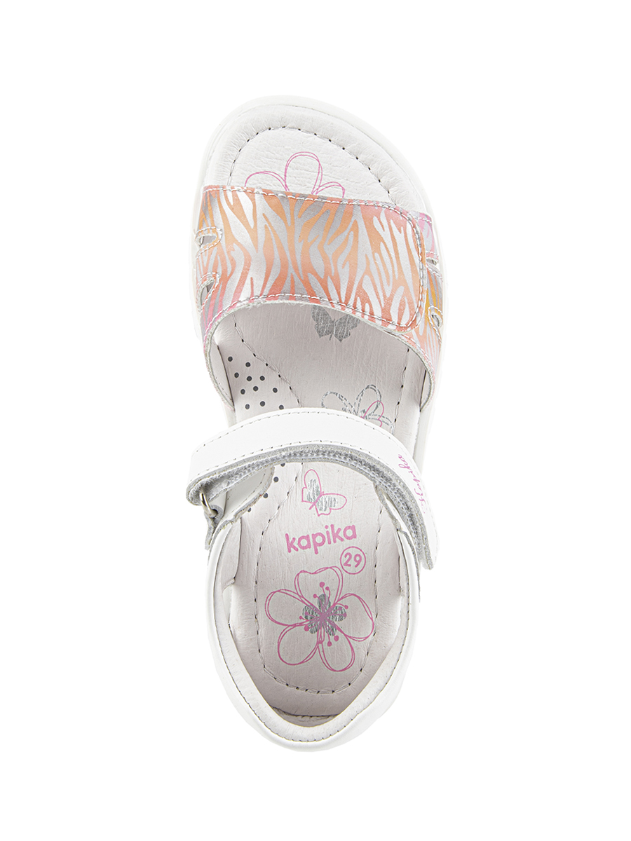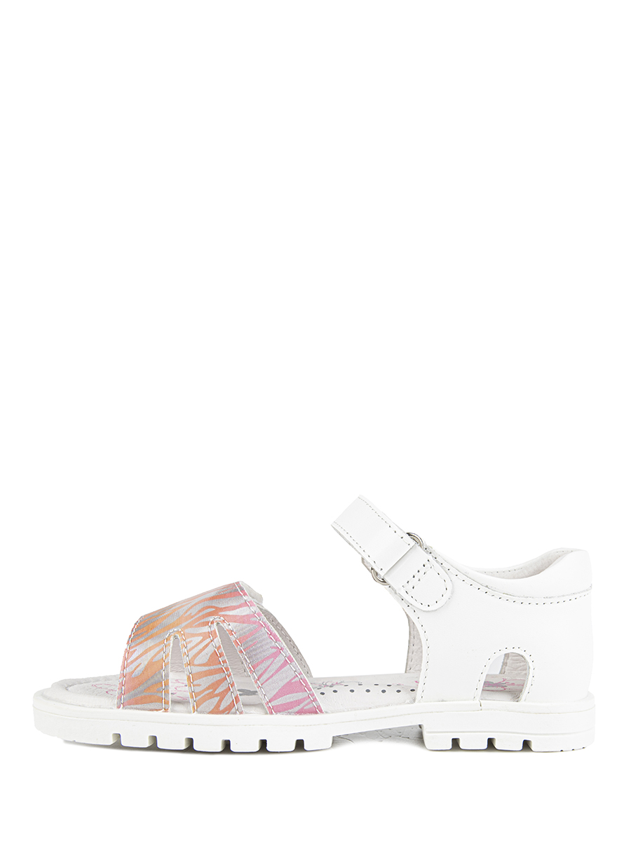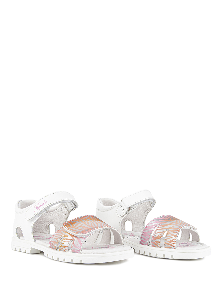 Сандалии для девочки с комбинированным материалом верха. Подкладка и стелька из натуральной кожи. Жесткий задник и подсводник обеспечивают правильную постановку стопы и комфорт. Долговечная ТЭП подошва продлевает срок службы обуви.