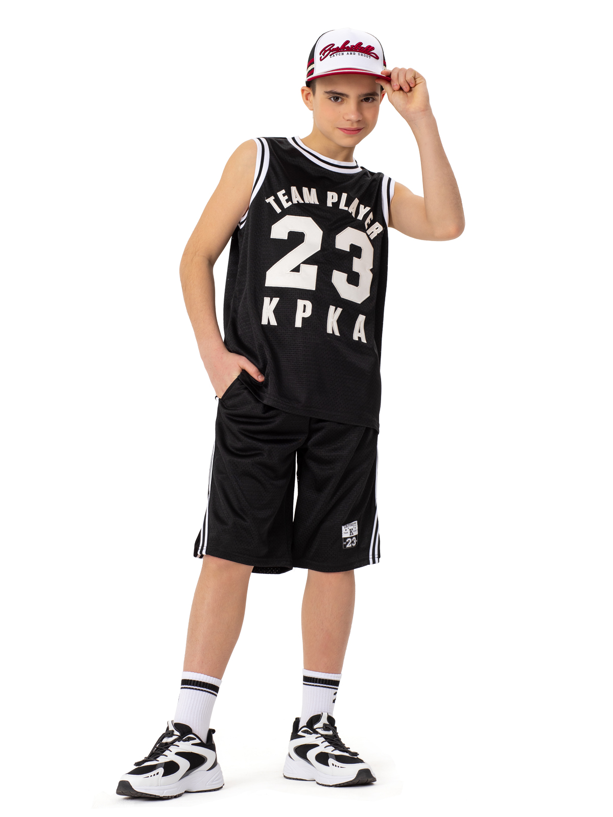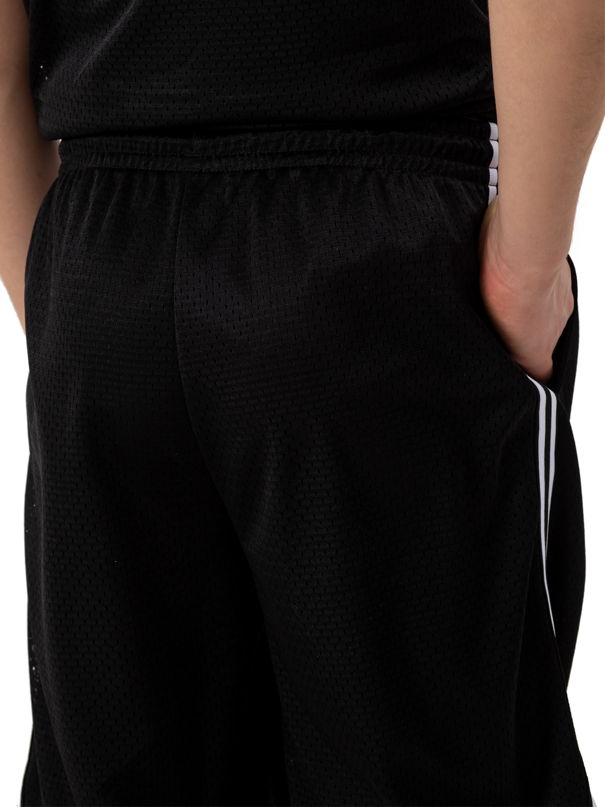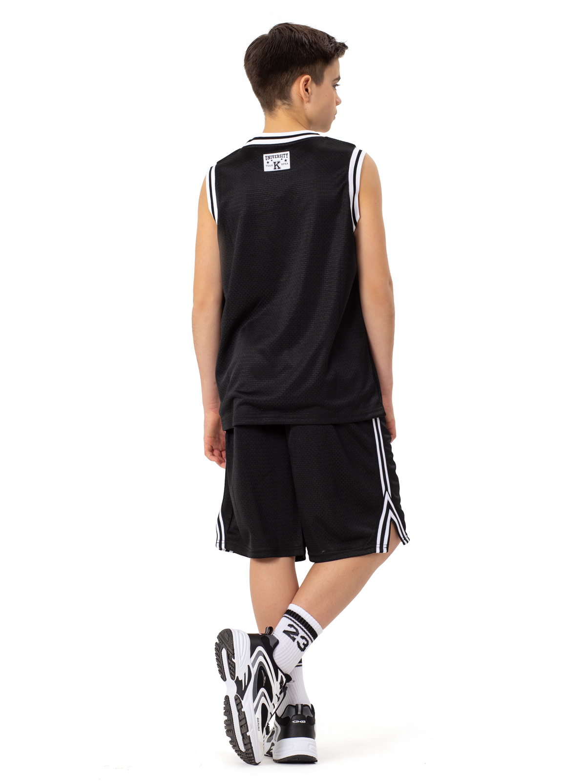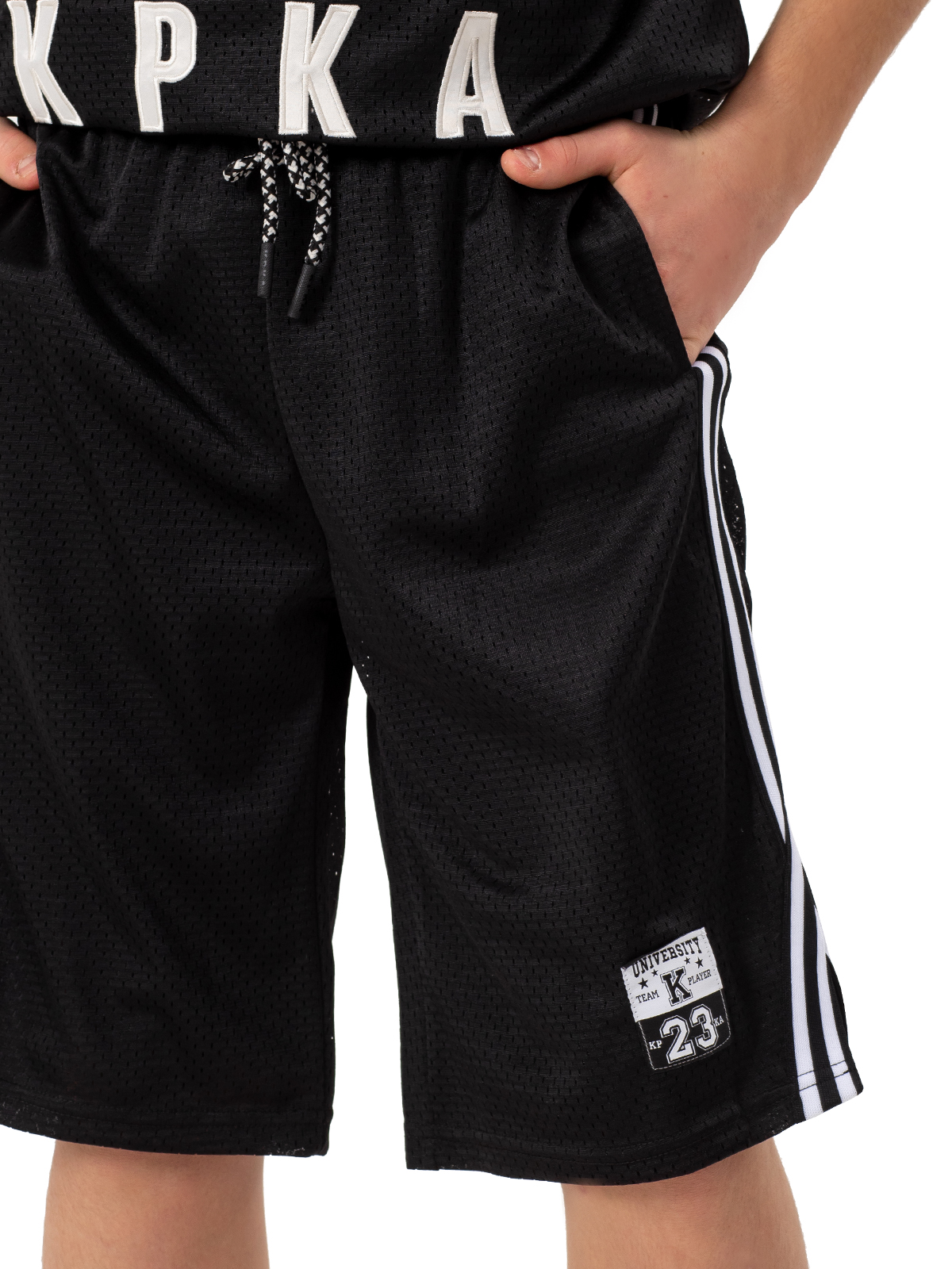 Тренировочные сетчатые шорты черного цвета с контрастными лампасами выполнены из материала премиум класса. Благодаря подкладу, шорты не просвечиваются. Изделие дополнено карманами. Акцент изделию придает патч с номером легендарного баскетболиста - Майкла Джордана. Шорты представлены в комплекте с майкой арт. NJBCM02-99