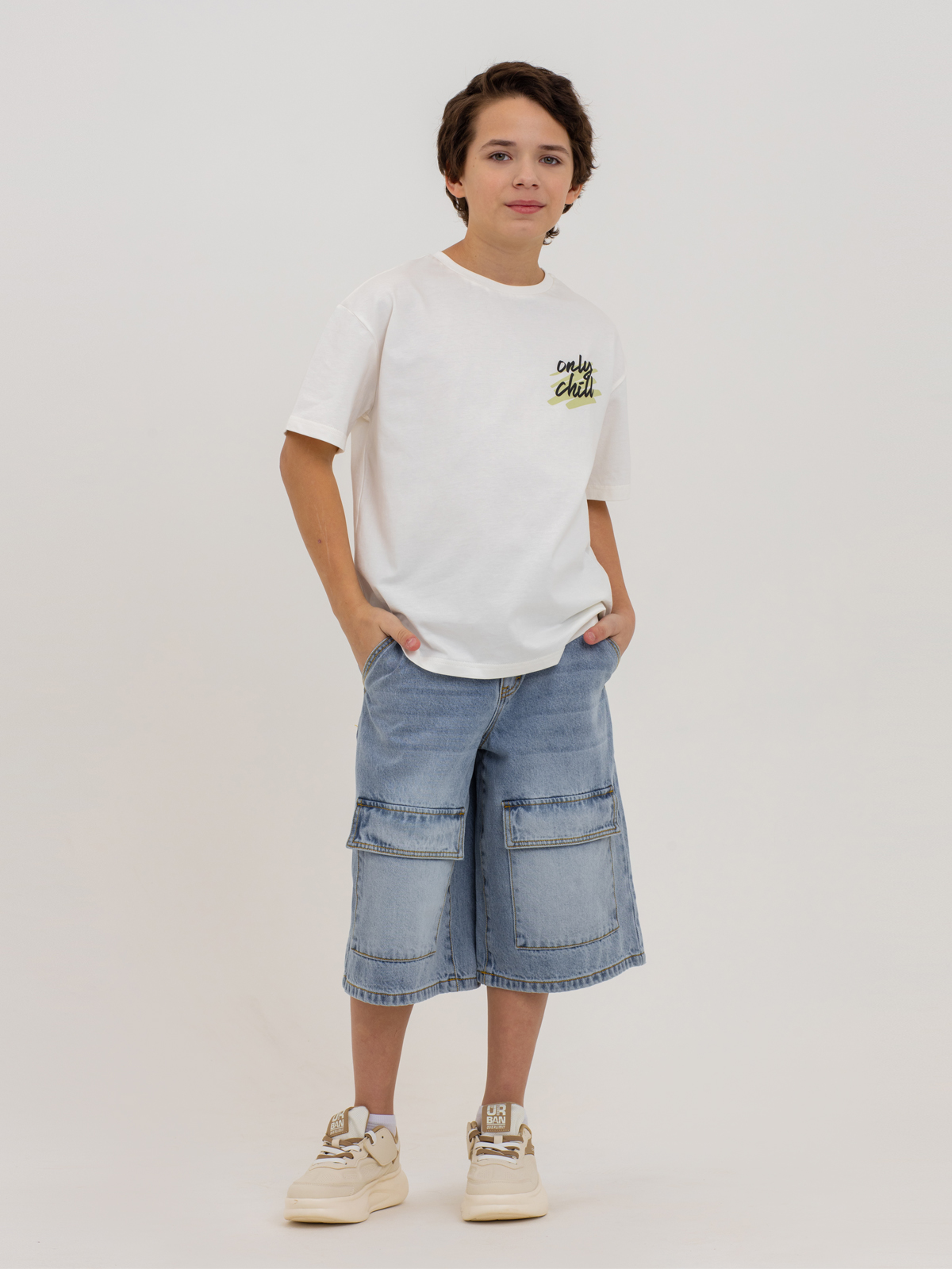 Джинсовые шорты с карманами для мальчиков. Плотный хлопковый деним с выбеленным эффектом не раздражает кожу. Прямой крой с комфортной средней посадкой не стесняет движений. Пояс со шлевками для ремня и классическая застежка на молнию и пуговицу удобны в эксплуатации. Карманы удобны для хранения гаджетов и полезных мелочей.