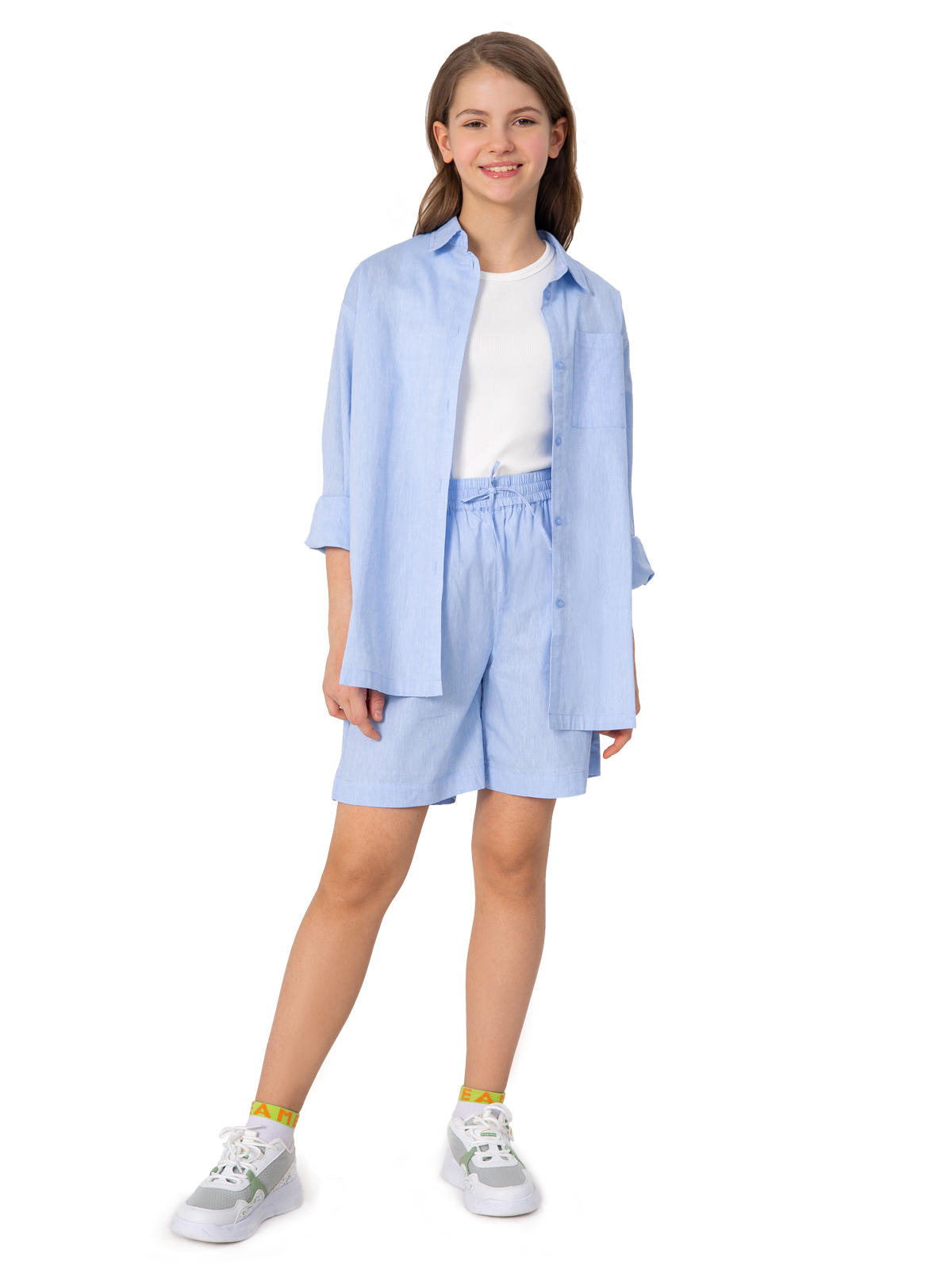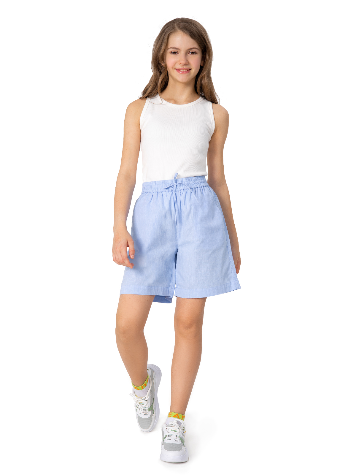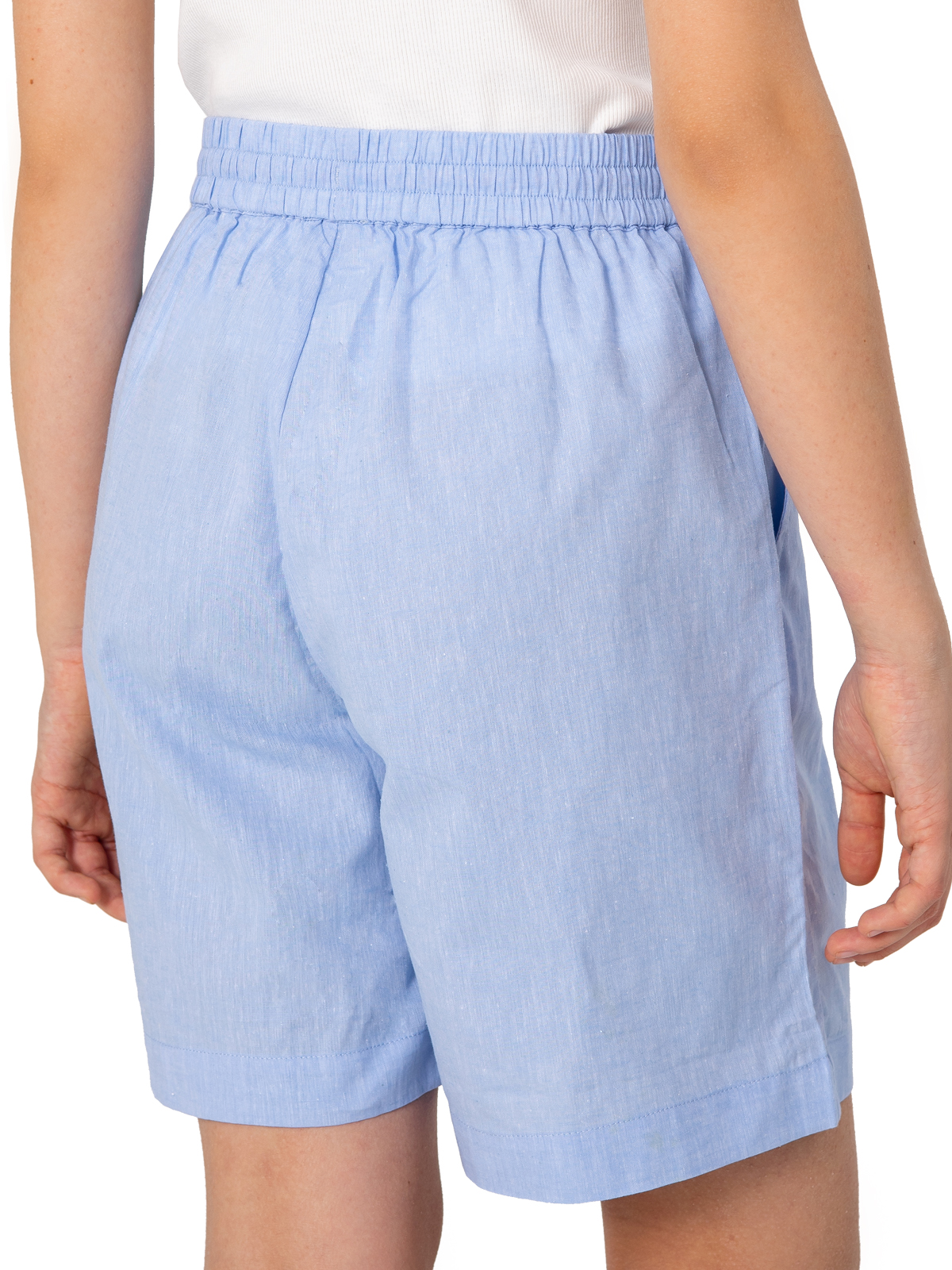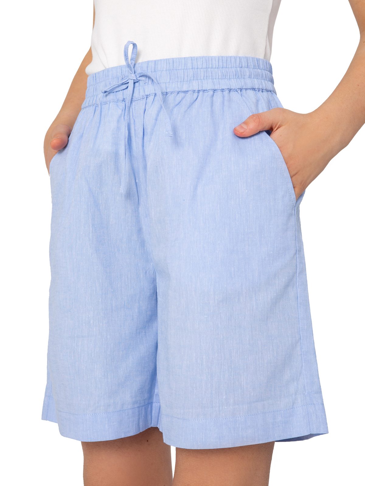 Льняные шорты небесного цвета. Мягкий шнурок помогает регулировать посадку, а эластичная резинка в поясе нежно прилегает к телу и не сдавливает кожу. Свободный прямой крой со средней посадкой талии. Данная модель отлично сочетается с различными верхами, создавая возможность для экспериментов с образами.