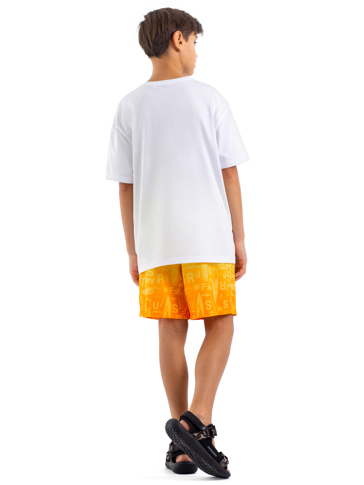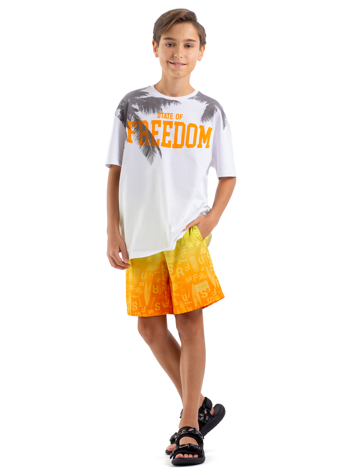 Летние широкие шорты для мальчика-подростка выполнены из быстросохнущего, эластичного материала с ярким градиентным принтом и дополнены силиконовым патчем. Шорты имеют внутренние плавки из мягкой сетки, вшивную резинку на талии, шнурок-завязку для регулировки. Благодаря дышащей и эластичной ткани не раздражающей кожу - шорты подойдут не только для плавания, но и для повседневной носки. Модель имеет два функциональных боковых кармана.