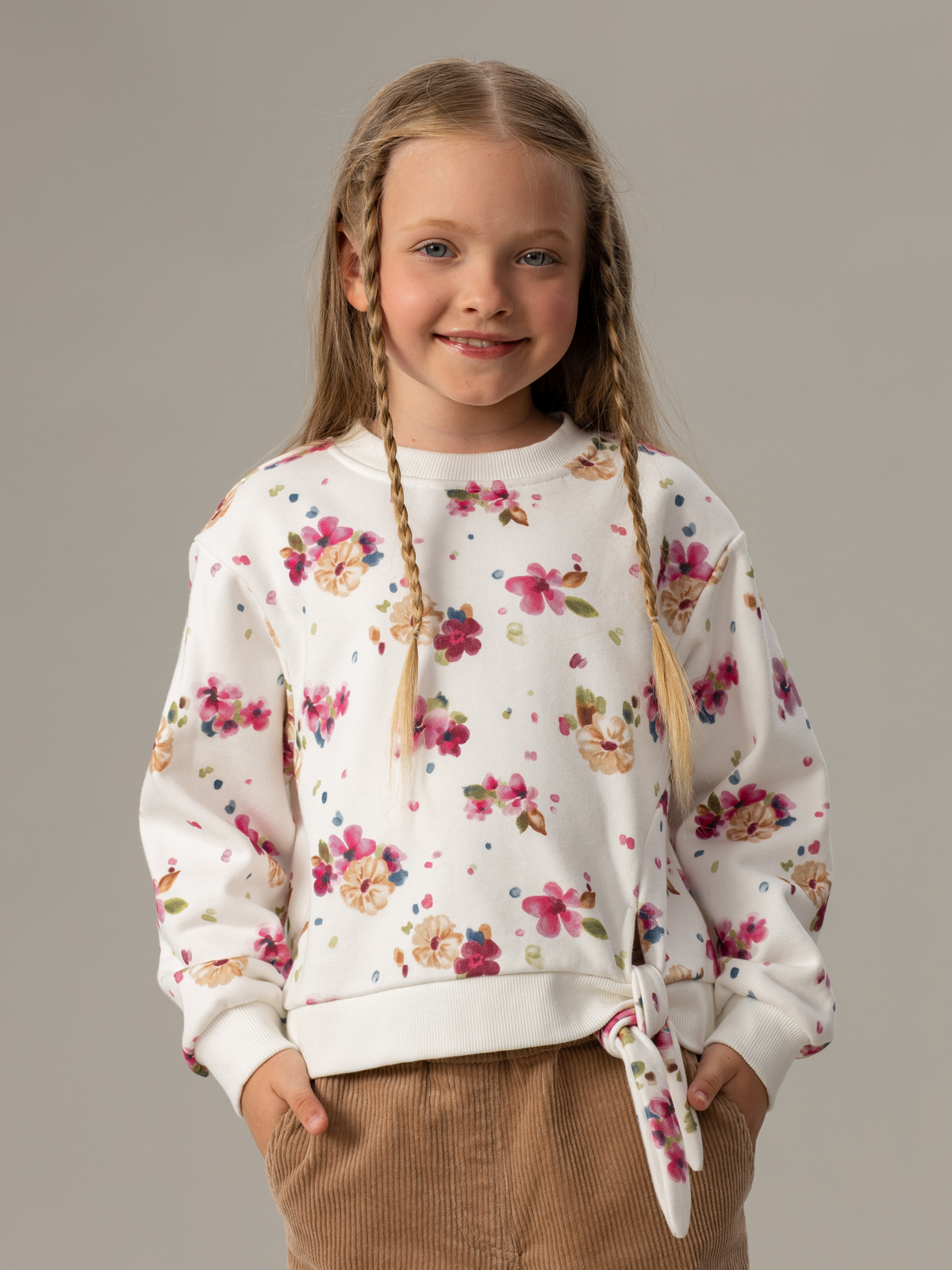 Очаровательный свитшот для девочки с ярким цветочным принтом станет настоящим украшением гардероба! Модель выполнена из смесового материала, состоящего из 89% хлопка и 11% полиэстера, что обеспечивает максимальный комфорт при носке. Натуральный хлопок позволяет коже дышать, а добавление полиэстера делает изделие практичным в уходе. Дизайн дополнен стильным декором: декоративной завязкой по низу, которая позволяет создавать разные образы, и элегантными рибамии по низу рукавов. Благодаря качественному составу и продуманному крою, свитшот отлично сидит по фигуре и подходит как для активных игр, так и для спокойных прогулок.