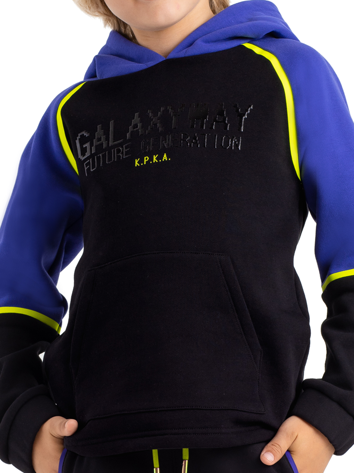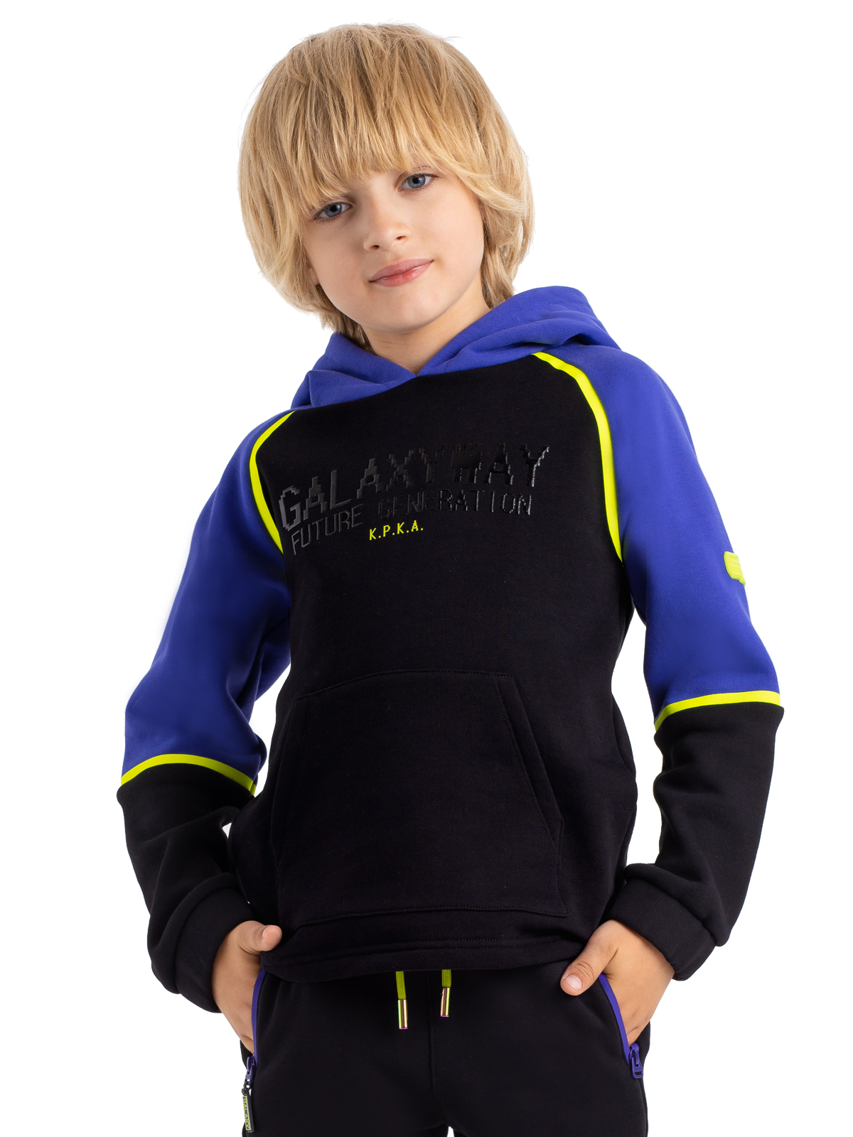 Удобная толстовка для мальчика выполнена из мягкого поликоттона в трендовом сочетании черного цвета с контрастными вставками. Толстовка с капюшоном согреет в прохладную погоду, стильные элементы силиконовый принт и патч на рукаве дополняют образ. Вместе с брюками создают крутой костюм. Все швы аккуратно обработаны, и благодаря качественной ткани толстовку приятно носить и легко стирать.