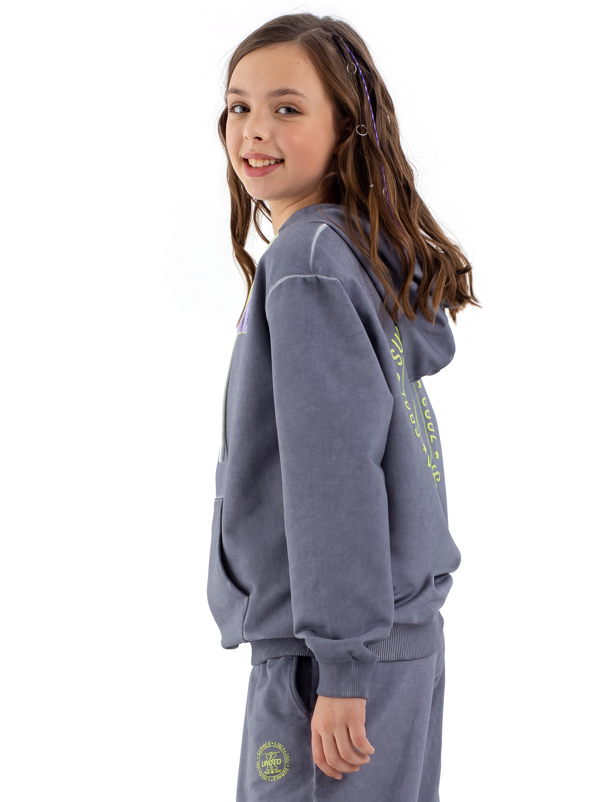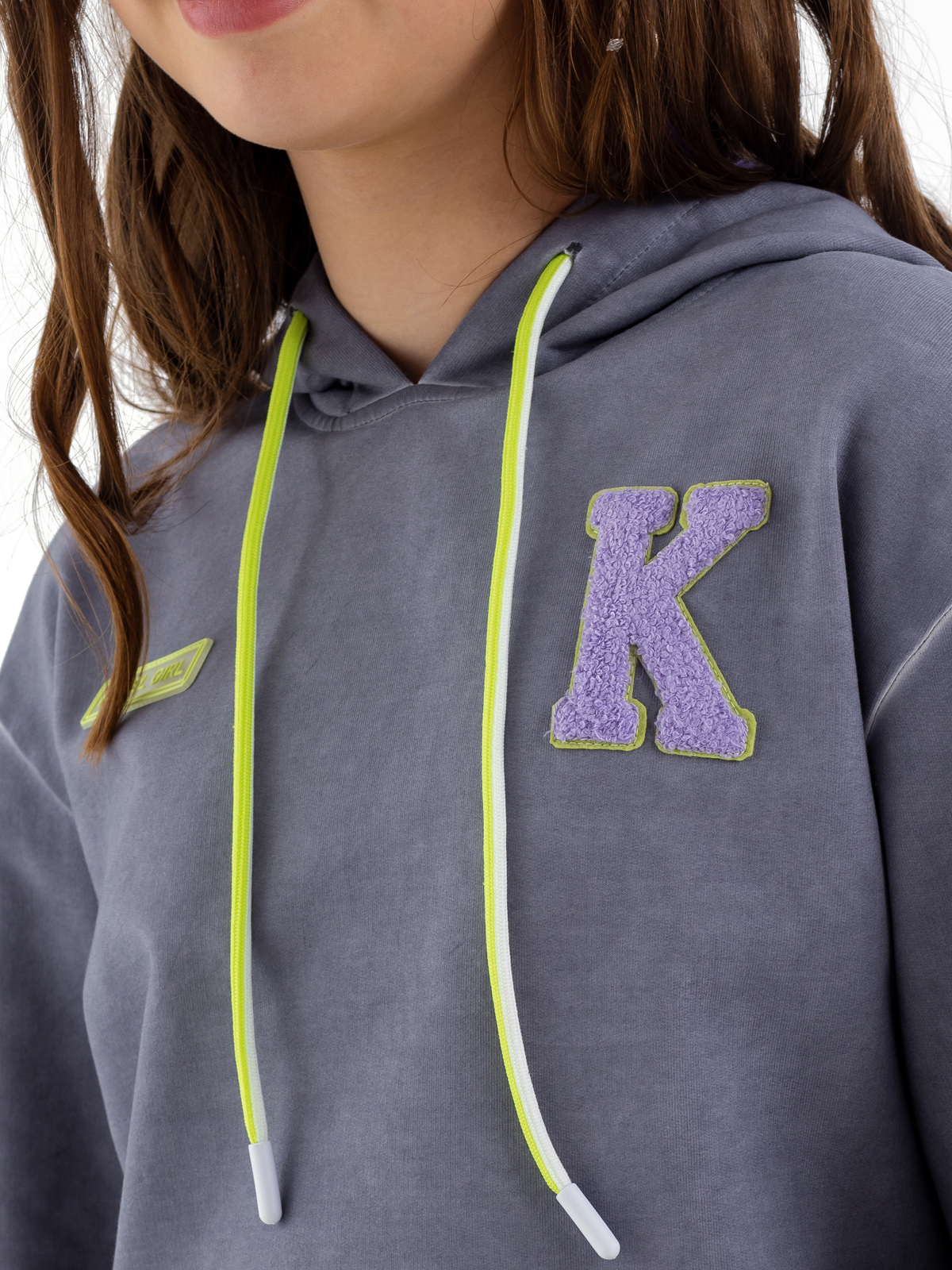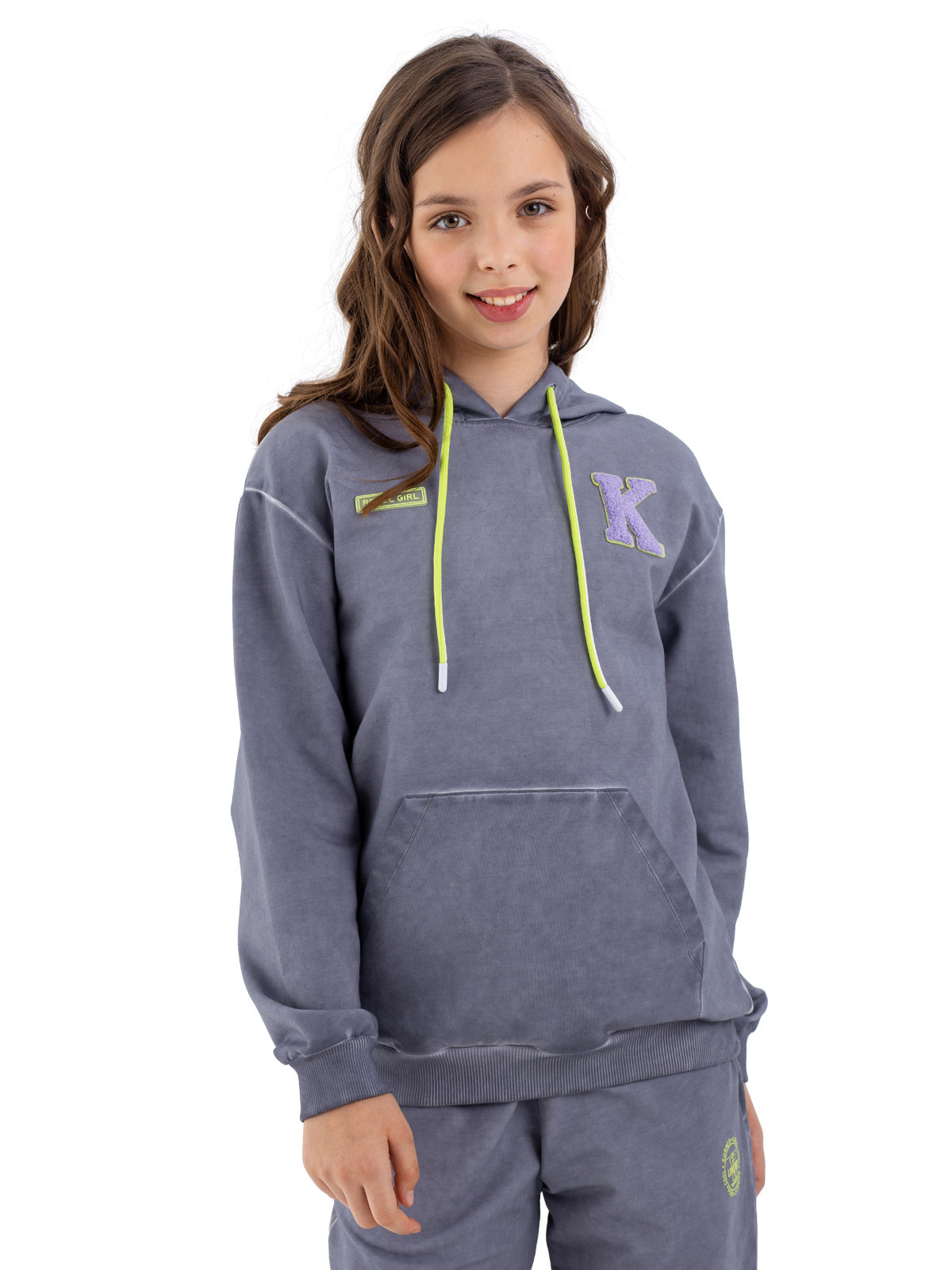 Стильная толстовка с капюшоном для девочки-подростка из высококачественного хлопка в технике "dirty wash". Дополнена нашивными патчами по полочке, стильным неоновым шнурком для регулировки капюшона, функциональным карманом и объемным шрифтовым принтом контрастного цвета на спинке.