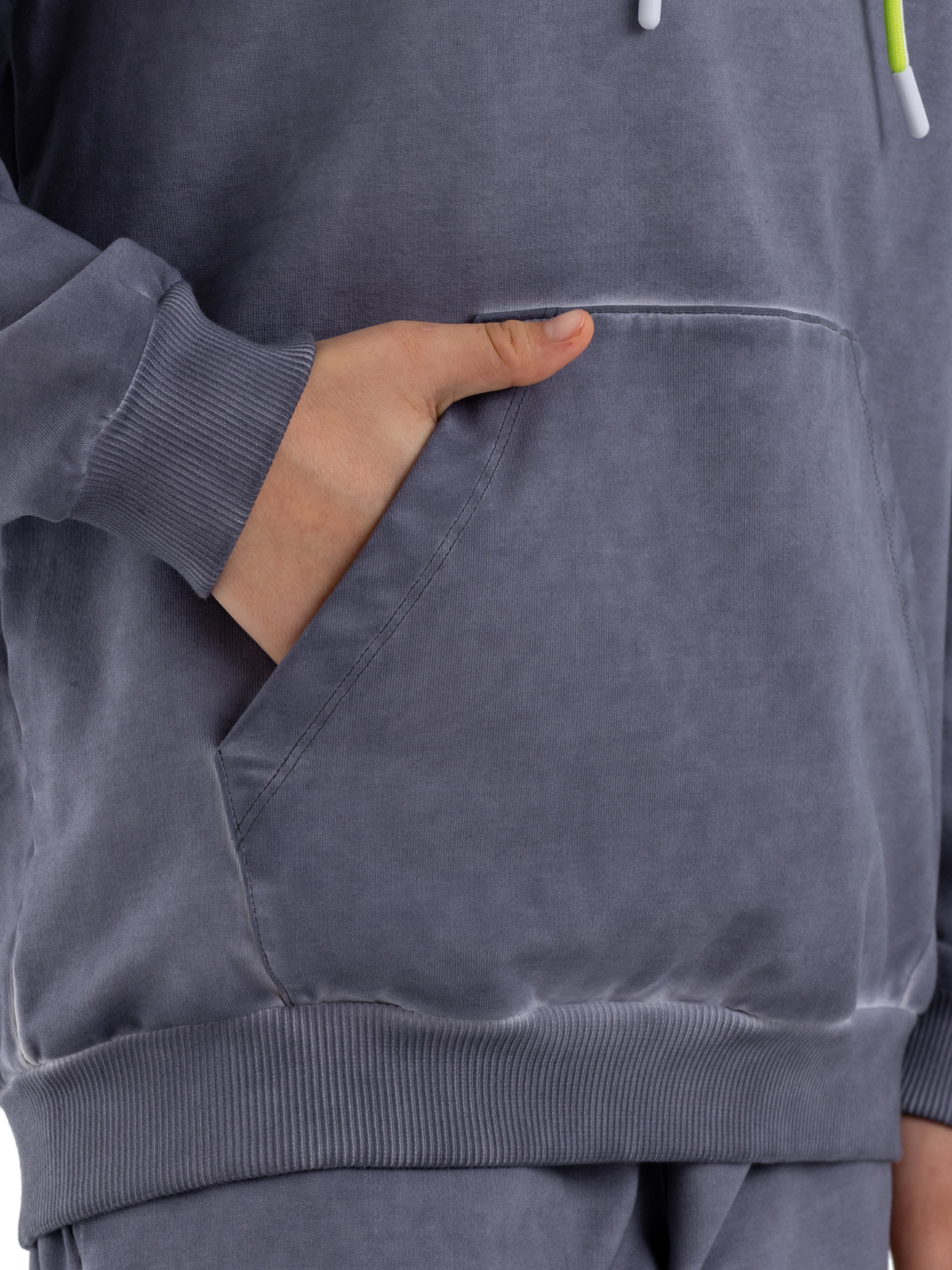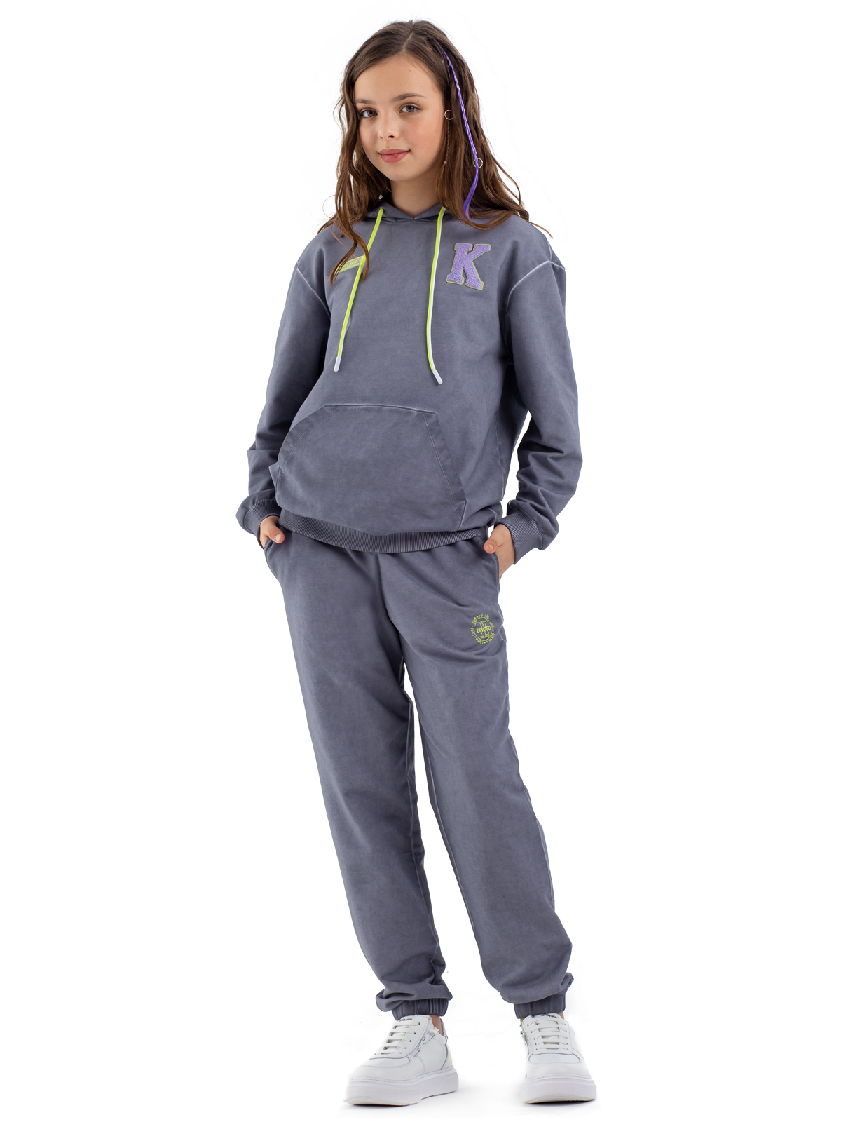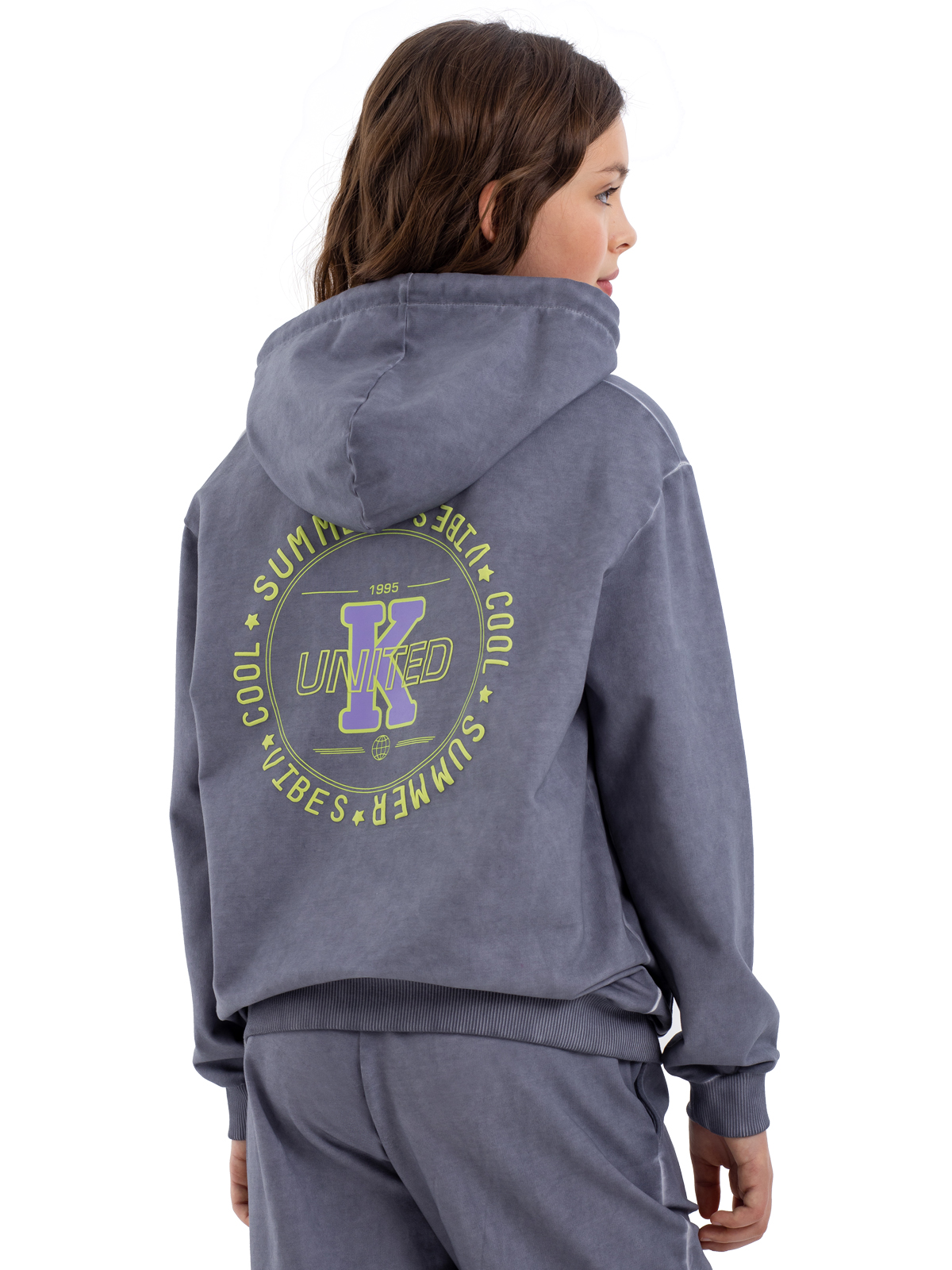 Стильная толстовка с капюшоном для девочки-подростка из высококачественного хлопка в технике "dirty wash". Дополнена нашивными патчами по полочке, стильным неоновым шнурком для регулировки капюшона, функциональным карманом и объемным шрифтовым принтом контрастного цвета на спинке.
