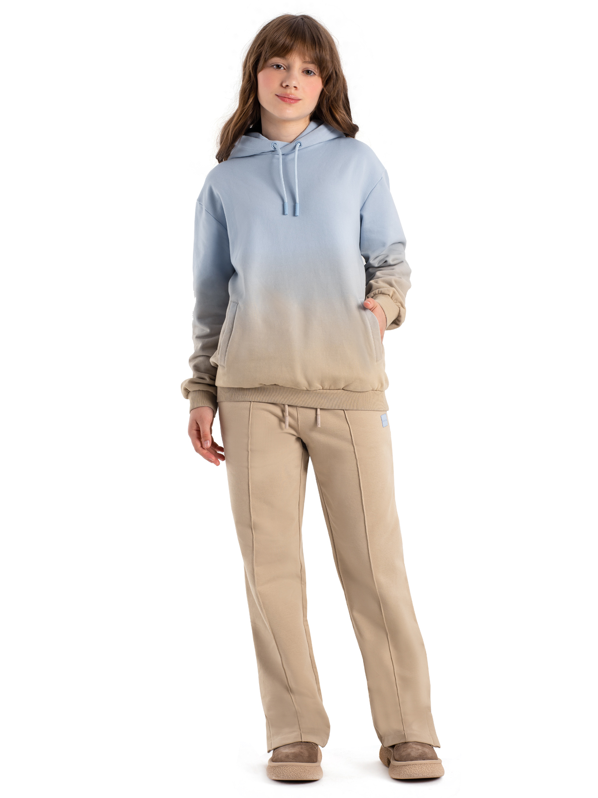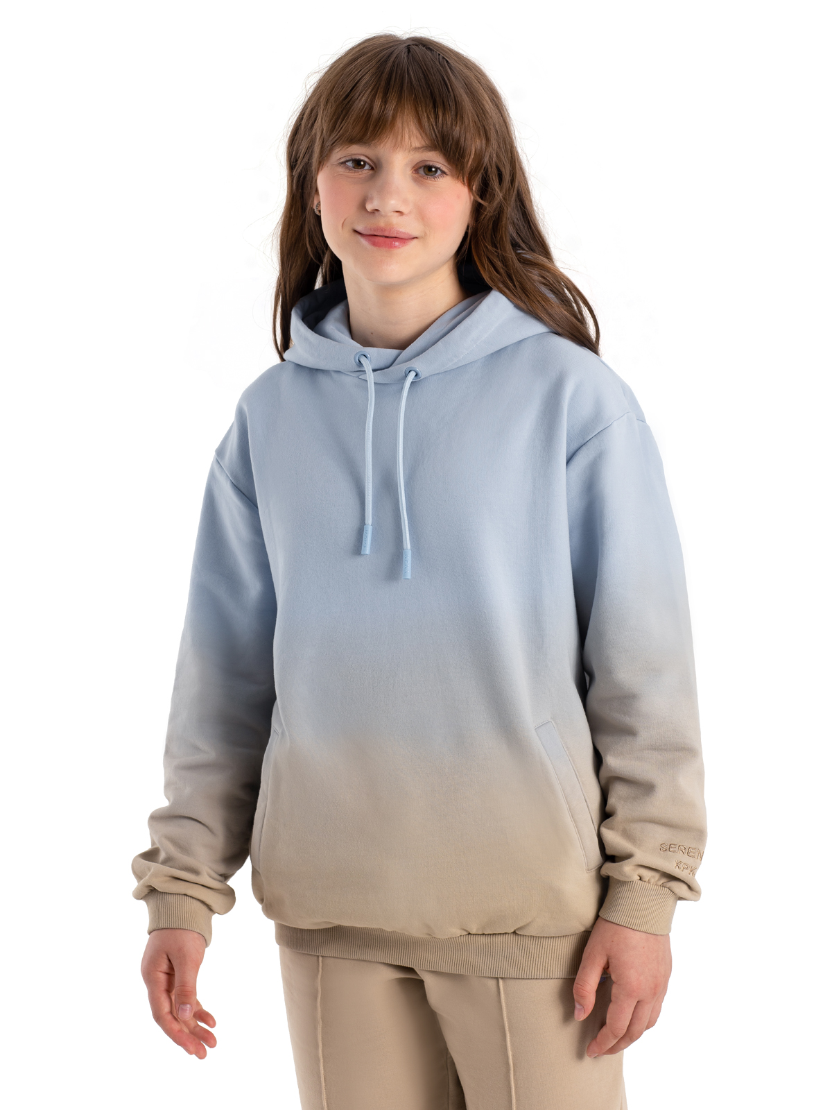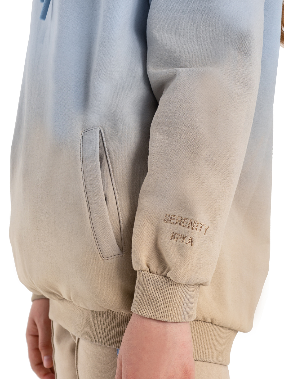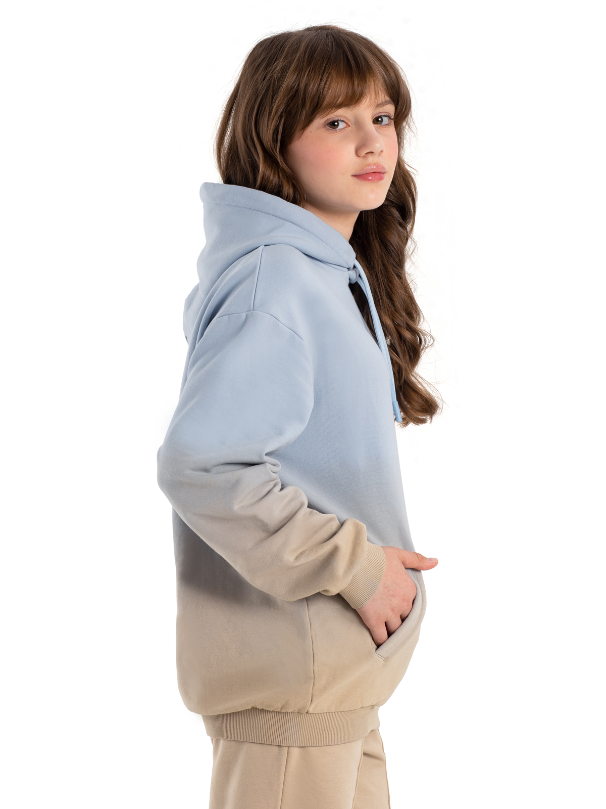 Стильная толстовка в оригинальном исполнении — плавным переходом от нежно-голубого к бежевому цвету — станет настоящим украшением гардероба. Модель выполнена из комфортного материала, хлопка с содержанием полиэстера, который обеспечивает отличную посадку и долговечность. Практичный капюшон со шнурком защитит от ветра, а два удобных прорезных кармана с листочками помогут хранить необходимые мелочи. Мягкие рибы по низу изделия и рукавам гарантируют комфортную посадку и свободу движений. Универсальный дизайн делает толстовку идеальной для повседневной носки и активного отдыха.