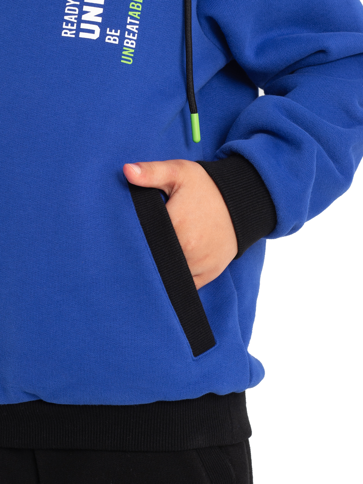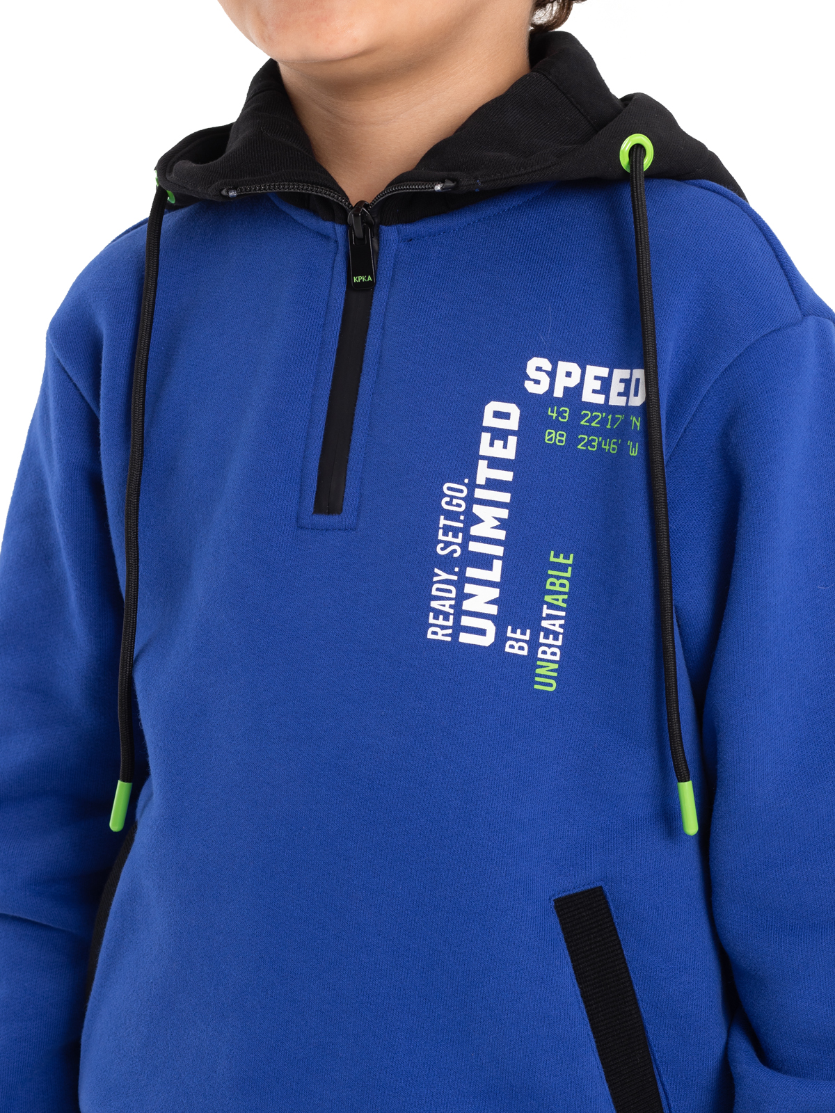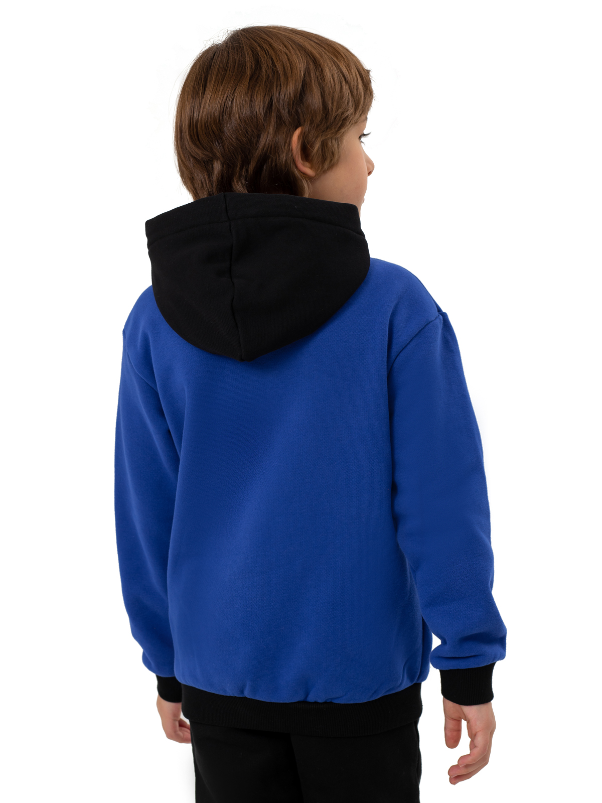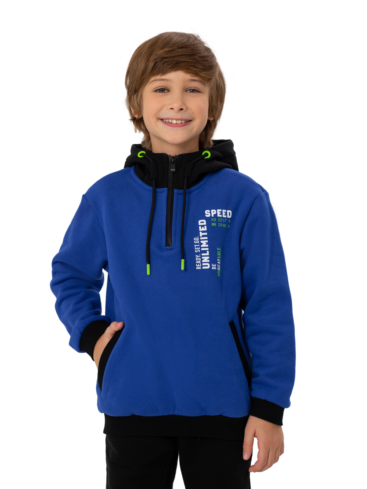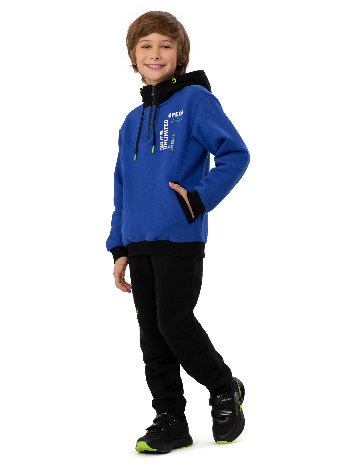 Стильная синяя толстовка для мальчика привлекает внимание своим оригинальным дизайном: контрастный чёрный капюшон с яркими салатовыми акцентами создаёт модный образ. Модель оснащена удобной застёжкой half-zip, которая позволяет регулировать уровень открытости. На груди расположен привлекательный принт, а два вместительных кармана на молниях обеспечивают безопасное хранение мелочей. Чёрные мягкие рибы по низу изделия и на рукавах гарантируют комфортную посадку и защиту от ветра. Эта современная толстовка станет отличным выбором для повседневной носки и активного отдыха. Сочетание качественных материалов и продуманного дизайна делает её незаменимой частью гардероба ребёнка.