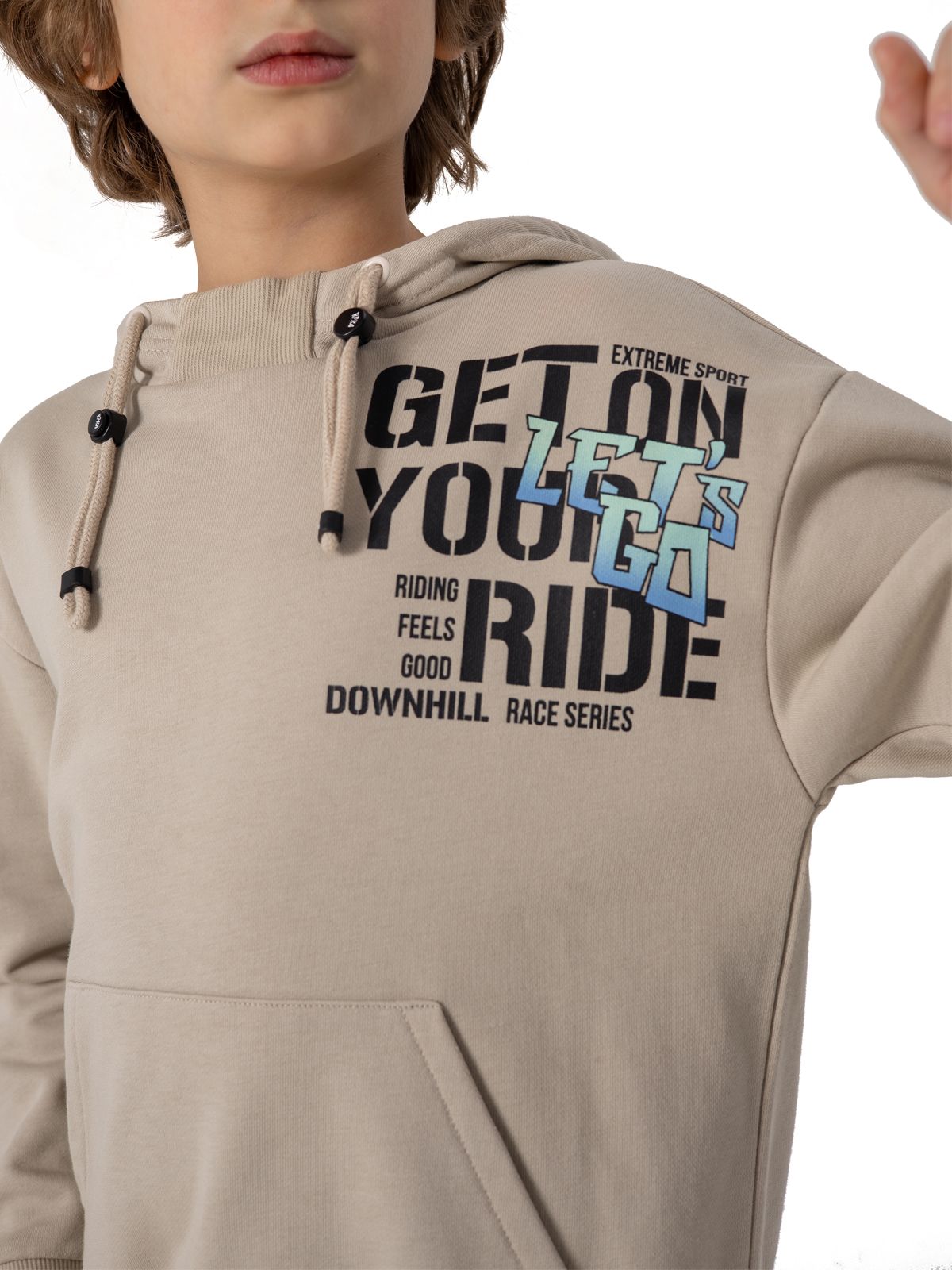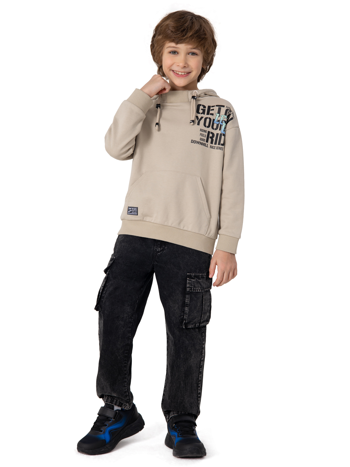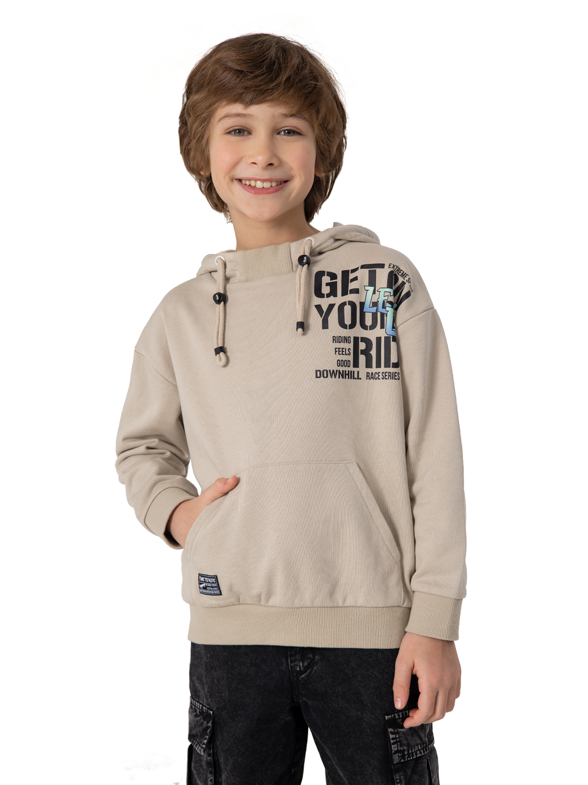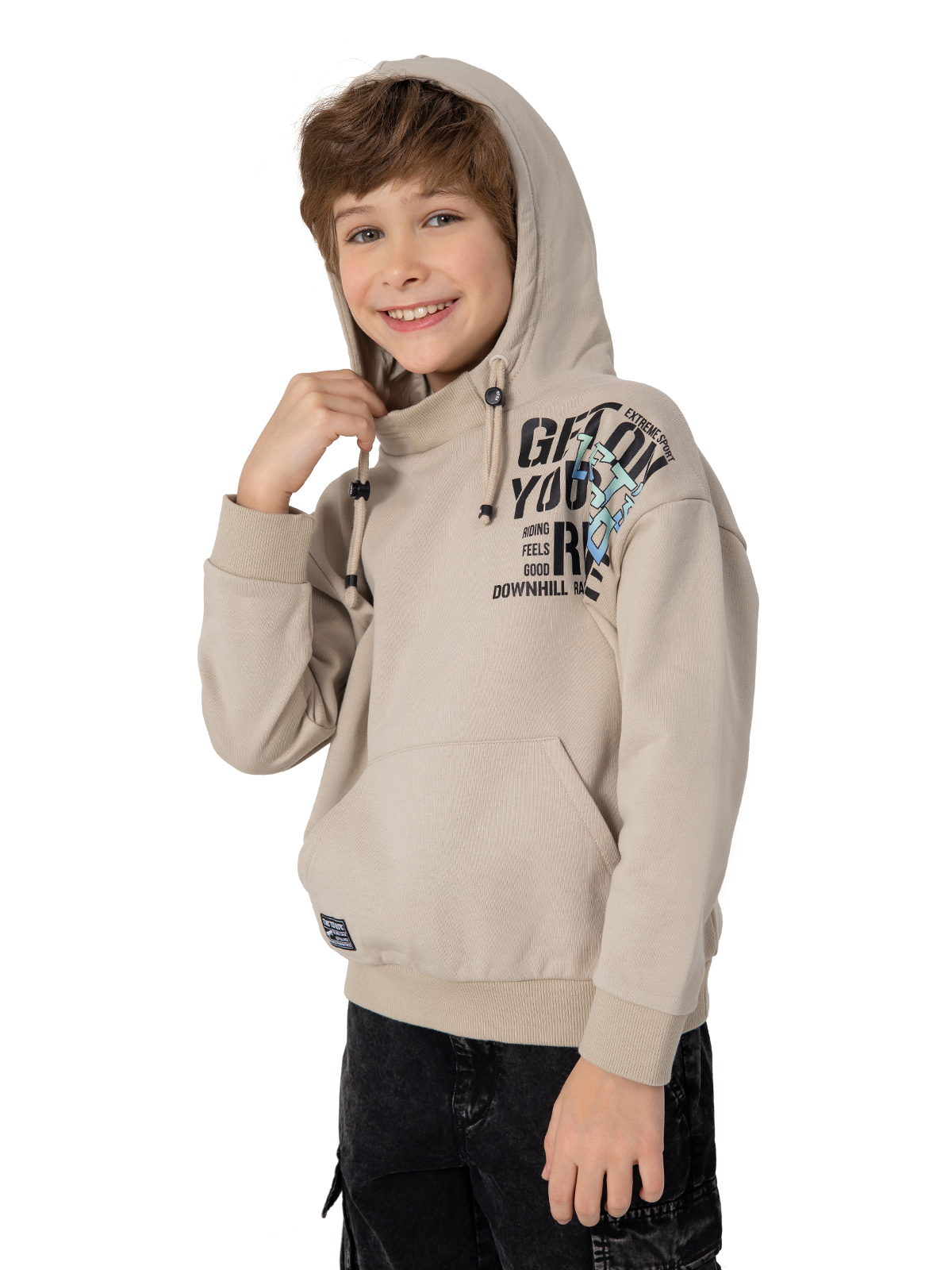 Уютная толстовка в бежевом цвете выполнена из комфортного материала — смеси хлопка с полиэстером, что обеспечивает отличную воздухопроницаемость и долговечность. Внутренняя подкладка из 100% хлопка делает изделие особенно приятным к телу. Модель оснащена практичным капюшоном с регулируемыми завязками, выразительным принтом на груди и удобным карманом-кенгуру. Мягкие рибы по низу изделия и рукавам гарантируют комфортную посадку и защиту от ветра. Благодаря качественным материалам толстовка сохраняет форму после стирки и остаётся такой же мягкой и приятной в носке. Идеальный выбор для повседневной носки и активного отдыха.
